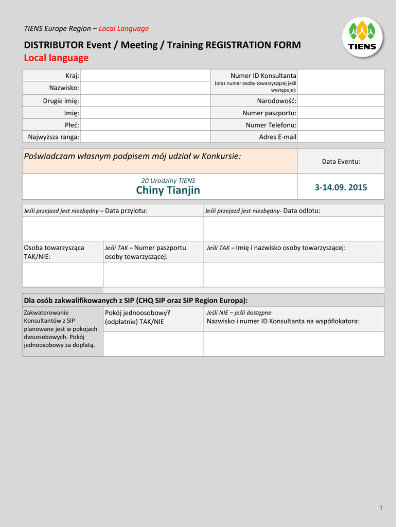 TIENS Europe Region – Local Language DISTRIBUTOR Event / Meeting / Training REGISTRATION FORM Local language Kraj: Numer ID Konsultanta Nazwisko: (oraz numer osoby towarzyszącej jeśli występuje): Drugie imię: Narodowość: Imię: Numer paszportu: Płeć: Numer Telefonu: Najwyższa ranga: Adres E-mail Poświadczam własnym podpisem mój udział w Konkursie: 20 Urodziny TIENS Data Eventu: 3-14.09. 2015 Chiny Tianjin Jeśli przejazd jest niezbędny – Data przylotu: Jeśli przejazd jest niezbędny- Data odlotu: Osoba towarzysząca TAK/NIE: Jeśli TAK – Imię i nazwisko osoby towarzyszącej: Jeśli TAK – Numer paszportu osoby towarzyszącej: Dla osób zakwalifikowanych z SIP (CHQ SIP oraz SIP Region Europa): Zakwaterowanie Konsultantów z SIP planowane jest w pokojach dwuosobowych. Pokój jednoosobowy za dopłatą. Pokój jednoosobowy? (odpłatnie) TAK/NIE Jeśli NIE – jeśli dostępne Nazwisko i numer ID Konsultanta na współlokatora: 1 TIENS Europe Region – Local Language DISTRIBUTOR Event / Meeting / Training REGISTRATION FORM Local language Preferencje żywieniowe (brak gwarancji dostępności): Alergie, specjalne potrzeby, inne potrzeby: Języki mówione I rozumiane Inne, ważne informacje dotyczące podróży i planowania? Język ojczysty - Kwalifikator SIP TAK/NIE: Jeśli TAK, który SIP: Płaci za siebie TAK/NIE Data i miejsce: Podpis Konsultanta, biorącego udział: ………………………………………………… ……………………………………………………… 2