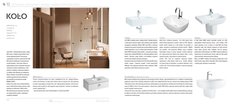 12 ceramik a sanitarna, wanny, k abiny prysznicowe Sanitec Kolo Sp. z o.o. ul. Toruńska 154 62-600 Koło infolinia 801 17 17 17 [email protected] www.kolo.com.pl Sanitec KOŁO – doskonałe połączenie jakości i designu. KOŁO to jedna z najbardziej rozpoznawalnych marek w branży wyposażenia łazienek. Firma znana jest z wysokiej jakości ceramiki oraz nowoczesnych linii mebli. KOŁO należy do największego w Europie producenta ceramiki łazienkowej – Grupy Sanitec. Wejście do międzynarodowej struktury zaowocowało inwestycjami i dynamicznym rozwojem przedsiębiorstwa, a także pozwoliło na rozbudowę i modernizację istniejących już zakładów w Kole, Włocławku oraz wybudowanie fabryki w Ozorkowie. Sanitec KOŁO jest producentem produktów wyposażenia łazienek sprzedawanych pod marką KOŁO oraz dystrybutorem brandów KERAMAG i KORALLE. W ofercie firmy znaleźć można ceramikę łazienkową, wanny i brodziki akrylowe, kabiny prysznicowe, meble łazienkowe oraz hydromasaże. Produkty Sanitec KOŁO charakteryzują się nowoczesnym wzornictwem oraz najwyższą jakością, zgodną z restrykcyjnymi europejskimi standardami. 230 TWINS STYLE VARIUS Seria TWINS to podwójne piękno i podwójny komfort. Umywalka połączona z szafką zapewni maksimum wygody i spełni oczekiwania nawet najbardziej wymagających użytkowników. Kolekcja TWINS marki KOŁO to rewelacyjne rozwiązania, które sprawią, że łazienka stanie się odzwierciedleniem topowych trendów designerskich, a przy tym zachowa pełną funkcjonalność. W skład kolekcji TWINS wchodzą dwa modele umywalek – z misą owalną i prostokątną, dostępne także z powłoką Reflex KOŁO, oraz szafki podumywalkowe w dwóch kolorach – dąb Arava i wenge. Produkty z serii pozwalają na stworzenie w łazience pięciu głównych wariantów aranżacyjnych. Zastosowanie nowoczesnej technologii Fine Fire Clay (FFC) pozwoliło stworzyć unikalne, masywne i nowoczesne umywalki o dużych powierzchniach odkładczych, które zapewniają maksymalny komfort użytkowania. Gładka powierzchnia ceramiki ułatwia utrzymanie jej w czystości. Modna forma i praktyczne rozwiązania – tak w kilku słowach można określić łazienkę wyposażoną w ceramikę i meble serii STYLE. Opływowe kształty ceramiki, wpisujące się w plan kwadratu lub prostokąta, są zgodne z panującymi we współczesnym wzornictwie trendami. Głębokie misy umywalek i duże powierzchnie odkładcze czynią je wyjątkowo funkcjonalnymi. Dotyczy to zarówno umywalek o kształcie tradycyjnym jak i modeli asymetrycznych. Również miski ustępowe i bidety - w wersji stojącej lub wiszącej - mają mniejsze niż zazwyczaj wymiary. Łazienka STYLE może być uzupełniona praktycznym meblami, wyposażonymi w półki wewnątrz szafek oraz na drzwiach, ułatwiając tym samym dostęp do kosmetyków, czy przyborów toaletowych. Fronty w kolorze teak lub bieli polarnej pozwalają na stworzenie przyjaznego klimatu w łazience. W skład kolekcji VARIUS wchodzi śnieżnobiała ceramika oraz szafki: podumywalkowa w dwóch wymiarach i boczne – niska z szufladą, a także wysoka wyposażona w kosz na bieliznę. Za marką KOŁO stoją również funkcjonalne meble, które doskonale wpasowują się każdą przestrzeń, tworząc spójną, estetyczną całość. Przykładem może być najnowszy, grafitowy dekor mebli łazienkowych z serii VARIUS. Znakomicie podkreśla on niepowtarzalny styl minimalistycznych aranżacji. Lekka linia mebli pozwala uzyskać przestronną, nowoczesną przestrzeń użytkową. Meble z serii VARIUS to kolekcja, która dotychczas dostępna była w trzech kolorach frontów: wenge, zebrano i biały połysk. Oferta została wzbogacona o atrakcyjny grafit, polerowany na wysoki połysk. Preciosa 2 OVUM/EGO by Antonio Citterio "Preciosa 2 kontynuuje klasyczny styl, znanej i produkowanej od lat, serii dostępnej dotychczas w ofercie marki Keramag o tej samej nazwie. Naszym celem jest tworzenie form, które wyróżniają się zarówno swoją elegancją i estetyką umiaru, jak i najwyższą jakością wykonania. Serię Preciosa 2 kierujemy przede wszystkim do osób pragnących czerpać przyjemność z otaczania się przedmiotami o prostej i oryginalnej bryle." – mówi Krzysztof Brzeziński, Senior Produkt Menadżer ds. Ceramiki Sanitec KOŁO. KOŁO nieustannie podkreśla swoje przywiązanie do nowoczesnego wzornictwa i designu, czego potwierdzeniem jest m.in. współpraca ze światowej sławy projektantem, Antonio Citterio. W połowie października na polskim rynku zadebiutowały dwie nowe serie, stworzone przez włoskiego designera; OVUM i EGO by Antonio Citterio. Obie zachwycają prostotą formy, subtelną elegancją i precyzją wykonania. Charakterystyczny kształt jajka jest cechą dominującą nowej linii OVUM by Citterio. Przez swoją wyrazistość i ciekawą formę, produkty OVUM idealnie organizują przestrzeń wokół siebie, nadając każdej aranżacji oryginalny, nowoczesny wyraz. Z kolei prostota formy to idea stojąca za produktami linii EGO by Citterio – w tym przypadku architekt poddał zmianom istniejącą kolekcję Ego, pokazując jej całkowicie nowe oblicze. W nowej odsłonie produkty jeszcze bardziej zachwycają smukłą linią i pietyzmem wykończenia, pozostają w pełnej zgodzie z najświeższymi trendami designu. IAinfoarchitekta.pl
