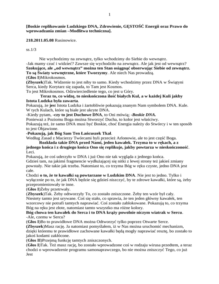1 [Boskie replikowanie Ludzkiego DNA, Zdrowienie, GĘSTOŚĆ Energii oraz Prawo do wprowadzania zmian –Modlitwa techniczna]. 218.2011.05.08 Rusinowice. ss.1/3 Nie wychodzimy na zewnątrz, tylko wchodzimy do Siebie do wewnątrz. -Jak mamy czuć i widzieć? Zawsze się wychodziło na zewnątrz. Ale jak jest od wewnątrz? Szokujące, ale „od wewnątrz” można ten Stan osiągnąć obserwując Siebie od zewnątrz. To są Światy wewnętrzne, które Tworzymy. Ale niech Nas prowadzą. (Głos I)Mikrokosmos. (Zbyszek)Tak. Widzenie to jest niby to samo. Kiedy wchodzimy przez DNA w Świątyni Serca, kiedy Korytarz się zapada, to Tam jest Kosmos. To jest Mikrokosmos. Odzwierciedlenie tego, co jest u Góry. Teraz to, co widzę, to nieskończona ilość białych Kul, a w każdej Kuli jakby Istota Ludzka była zawarta. Pokazują, że jest Istota Ludzka i żartobliwie pokazują znanym Nam symbolem DNA. Kule. W tych Kulach, które są białe jest ukryte DNA. -Kiedy pytam, -czy to jest Duchowe DNA, to Oni mówią; -Boskie DNA. Ponieważ z Poziomu Boga można Stworzyć Ducha, to kolor jest właściwy. Pokazują też, że samo DNA musi być Boskie, choć Energia należy do Stwórcy i w ten sposób to jest Objawione. -Pokazują, jak Bóg Sam Ten Łańcuszek Tkał. Według Zasad z Macierzy Twórcami byli przecież Arlonowie, ale to jest część Boga. Rozkłada takie DNA przed Nami, jeden kawałek. Trzyma to w rękach, a z jednego końca i z drugiego końca Ono się replikuje, jakby powtarza w nieskończoność. Leci. Pokazują, że coś uderzyło w DNA i już Ono nie tak wygląda z jednego końca. Gdzieś tam, na jakimś fragmencie wydłużającej się nitki z lewej strony też jakieś zmiany powstały. Nie takie jak trzeba. Natomiast to, co trzyma Bóg w ręku czyste, jedno DNA jest całe. Chodzi o to, że te kawałki są powtarzane w Ludzkim DNA. Nie jest to jedno. Tylko i wyłącznie po to, że jak DNA będzie się gdzieś niszczyć, by te zdrowe kawałki, które są, żeby przepromieniowały te inne. (Głos I)Żeby przetrwały. (Zbyszek)Tak. Żeby odtworzyły To, co zostało zniszczone. Żeby ten wzór był cały. Niestety tamto jest urywane. Coś się stało, co sprawia, że ten jeden główny kawałek, ten wzorcowy nie potrafi tamtych naprawiać. Coś zostało zablokowane. Pokazują to, co trzyma Bóg na ręku jest złote, natomiast tamto wszystko ma różne kolory. Bóg chowa ten kawałek do Serca i to DNA krąży powolnie niczym wiatrak w Sercu. -Ale, czemu w Sercu? (Głos I)Bo to prawidłowe DNA można Odtworzyć tylko poprzez Otwarte Serce. (Zbyszek)Masz rację. Ja natomiast pomyślałem, iż w Nas można uruchomić mechanizm, dzięki któremu te prawidłowe zachowane kawałki będą mogły naprawiać resztę, bo zostało to jakoś kodami zakłócone. (Głos II)Przejmą funkcję tamtych zniszczonych. (Głos I)Tak. Też masz rację, bo zostało wprowadzone coś w rodzaju wirusa przedtem, a teraz chodzi o wprowadzenie programu samonaprawczego, bo nie można zniszczyć Tego, co już Jest 2 (Głos II)Zabezpieczenia. (Zbyszek)Uwaga! Pokazują Nasze Działanie jak będziemy Uzdrawiać. -Jest skupienie się, Moc Energetyczna i wyciągasz taką Kulę z Serca. Jak zobaczysz, że DNA, to Ludzkie, które nosimy w Sercu, ten cały zapis będzie taki sam w Twoim ręku albo widzisz, że do tej Kuli w ręku zaczyna to być przepromieniowywane wtykasz w Człowieka i patrzysz, jak To DNA się w Nim Odtworzy. To jest Zdrowienie. Czyli Zagęszczenie z Całym Przekazem. Zamknęli kotarę powiedzieli; -KONIEC. Czyli zagęszczanie Energii w ten sposób się odbywa, zobacz DNA, które przekazujesz Drugiemu Człowiekowi, wtykasz i Całość jest zapięta. Bóg wszedł w Pomoc w Uzdrawianiu. W sposób techniczny. (Głos I)To jakby przedłużenie tego wczorajszego Procesu zagęszczenia. Dalszy ciąg. (Zbyszek)Jakby bez tej właściwej gęstości nie można było tego chwycić. Trzeba było zejść na któryś tam Poziom, żeby móc to DNA chwycić. Tak naprawdę GĘSTOŚĆ to jest, coraz to wyższy Poziom Wibracji. Coraz mniejsze oczka. -Czyli nie chodzi o zagęszczenie, że coś dwa razy więcej waży, tylko wchodzenie w Istotę Ludzką, na coraz wyższym, subtelniejszym Poziomie. Coraz mniejsze są te oczy. Dzięki temu potrafisz to chwycić. -Trzeba mieć jeszcze Prawo do Wprowadzania Zmian. -Słyszę. Teraz jakby Nasze Serca zaczęły promieniować i jakby jedna Kula unosiła się Tutaj między Nami. Ta Kula jest Zwiastunem Nadziei. Jest orężem w zakresie Radości. On przepromieniowuje Nas. Wpływa. Zmienia. Robi mnóstwo rzeczy. Aż kręci się mi w głowie. Nie wiem, co zachodzi. Różne Energie. To gruntujący coś Proces. (Głos I)Zapis. (Zbyszek)Tak. Przyszedł Ktoś, a My stoimy w małej kolejce; -stoi szereg, a za nim następny i następny. Ktoś pisze Nazwiska. Tak jakbyśmy dostali do tego dostęp, a Oni teraz każą powiedzieć, Kto i odnotowują Nazwisko. Zgoda na to, że chce się Działać tym i Uzdrawiać. Żeby Oni wiedzieli. Otwiera się Wieczernik. Będzie Test na Nasze Działanie, na Nasze Uzdrawianie. Przynoszą Kogoś, Kto jest bardzo pokiereszowany. Rany ma. Nieciekawie to wygląda. Ja ujrzałem jakby Jezusa ściągnęli z krzyża i trzeba Go Uzdrawiać. Jezus za stołem stoi, ma ręce wyciągnięte i Obserwuje to. Dziś Komisja jakby nie miała znaczenia. Jest parę osób tylko, które nie wiedzą, co mają zrobić ze Sobą, ale chcą to osobiście widzieć. Egzaminuje zaś osobiście Jezus. Człowiek leży, a Każdy z Nas wchodzi na Najwyższy z możliwych Poziomów Głębi, Pozwala, by Jego Serce zaczęło Promieniować. Ciekawe, bo Moje Serce samo zaczęło Promieniować i Energia sama zaczęła płynąć. Nie wiem jak będzie u Was. Wyciągnąłem ręce i pierwszy raz, to nie jest tak jakby Energia z moich rąk płynęła tylko jak kieruję ręce, to Światło płynące z Serca jest jakby przez ręce ustawiane w mniejszy, większy Strumień. To nie ręce promieniują tylko Serce. 3 Kie