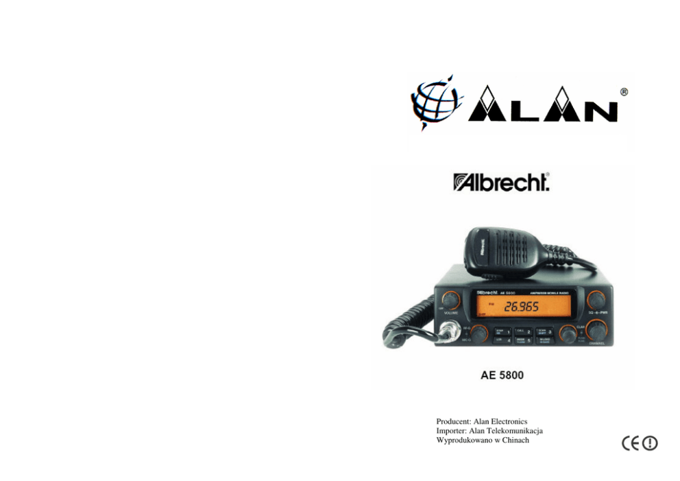 Producent: Alan Electronics Importer: Alan Telekomunikacja Wyprodukowano w Chinach SPIS SPISTRE TRECICI WPROWADZENIE..........................................................................................2 WPROWADZENIE..........................................................................................2 INSTALACJA...................................................................................................2 ANTENA...........................................................................................................3 INSTALACJA...................................................................................................2 ELEMENTY STEROWANIA...........................................................................5 UANTENA...........................................................................................................3 YWANIE RADIOTELEFONU....................................................................8 DANE TECHNICZNE......................................................................................9 TABELA OGRANICZE U YWANIA CB..................................................10 ELEMENTY STEROWANIA..........................................................................5 DEKLARACJA ZGODNO CI........................................................................11 U YWANIE RADIOTELEFONU...................................................................8 DANE TECHNICZNE......................................................................................9 TABELA OGRANICZE U YWANIA CB..................................................10 DEKLARACJA ZGODNO CI........................................................................11 TABELA OGRANICZE U YWANIA CB DANE TECHNICZNE Nadajnik Maksymalna moc wyj ciowa Tłumienie harmonicznych Czuło mikrofonu Typ doł czonego mikrofonu Mikrofon ALC Pobór pr du AM FM SSB ODBIORNIK Czuło przy 12 dB SINAD Selektywno 4W 4W 12 W 90 dB 4 mV/ 1kOhm elektretowy max. 2.5 (AM) max. 2,5 A AM max. 3 A FM, SSB 0,5 µV FM, SSB 0,9 µV AM 60 dB AM/FM 70 dB SSB 1 kHz 2,5W 245x155x53 mm 1,3 kg mi dzykanałowa Zakres płynnego przestrajania Moc audio Wymiary (z pokr tłami ) Waga WPROWADZENIE Albrecht AE5800 to nowoczesny radiotelefon CB wyposa ony we wszystkie dopuszczalne rodzaje emisji AM/FM/SBB oraz wiele dodatkowych funkcji poprawiaj cych komfort obsługi, jak równie dopasowuj cych parametry pracy do warunków propagacyjnych i potrzeb u ytkownika. Wysokiej jako ci filtry ceramiczne umieszczone w torze odbiorczym gwarantuj idealn separacj mi dzykanałow , a tak e brak kłopotliwych interferencji z silnymi sygnałami innych, pobliskich nadajników. INSTALACJA Albrecht AE5800 mo e by u ywany zarówno jako radio samochodowe jak i stacjonarne. Wyposa enie w modulacje jednowst gow szczególnie predystynuje go do wykorzystywania bazowego. SSB to najskuteczniejszy sposób ł czno ci na długich dystansach ale wymaga bardzo precyzyjnego dostrojenia radia do odbieranej cz stotliwo ci, a tak e komfortowych warunków odsłuchu oraz wprawy i pewnego „osłuchania si ” operatora. Bazowa Instaluj c radio w domu podł cz je do stabilizowanego zasilacza 12V o szczytowej wydajno ci pr dowej do 10 A. Zwró uwag na odpowiedni biegunowo i czerwony przewód zasilaj cy poł cz z dodatnim biegunem zasilania, a czarny z ujemnym. Bazow , prawidłowo zestrojon anten umie najwy ej jak to mo liwe. Je eli jej odległo od radia przekracza 20 m zalecamy u ycie kabla o wi kszej rednicy i lepszych parametrach np. RG-213. Samochodowa Radiotelefon mo e by zamontowany tylko w samochodzie posiadaj cym instalacj elektryczn DC 12V z tzw. minusem na masie. Ten warunek spełnia zdecydowana wi kszo współczesnych samochodów. Dla sprawdzenia poprawnej biegunowo ci zobacz, czy ujemny biegun akumulatora poł czony jest z blokiem silnika lub nadwoziem samochodu. 9 2 Du e ci arówki mog by wyposa one w instalacj elektryczn 24V. W takim wypadku u yj reduktora napi cia (przetwornicy 24/12V) lub poprowad zasilanie bezpo rednio z akumulatora (koniecznie z bezpiecznikiem). W razie w tpliwo ci skontaktuj si z serwisem nadajnika. Zewn trzne pokr tło reguluje poziom blokady szumów. Prawidłowe ustawienie polega na powolnym przekr caniu pokr tła z lewego skrajnego poło enia zgodnie z ruchem wskazówek zegara do momentu a szumy tła. przestan by słyszalne. Dalsze przekr canie spowoduje e słabe sygnały od dalszych korespondentów nie b d odbierane. Pokr tłem wewn trznym mo esz płynnie regulowa moc nadajnika w zale no ci od odległo ci korespondenta z którym prowadzisz ł czno . Zmniejszenie mocy przy transmisjach lokalnych powoduje mniejsze zakłócenia dla innych u ytkowników i zwi kszenie prywatno ci korespondencji (jeste słyszalny z krótszej odległo ci). Wybór miejsca instalacji Albrecht AE5800 mo e by instalowany zarówno poziomo jak i pionowo w miejscu zapewniaj cym najwygodniejszy i jednocze nie bezpieczny dost p. Uwaga! Zamontowany radiotelefon nie mo e w aden sposób ogranicza mo liwo ci kierowania samochodem ani utrudnia prawidłowego funkcjonowania jego podzespołów np. poduszek powietrznych. Podł czenie elektryczne Je eli nie jeste pewny jak biegunowo ma twoja instalacja elektryczna w samochodzie sprawd to teraz. Odł cz przewód od ujemnego bieguna akumulatora, aby unikn zagro enie krótkim spi ciem podczas monta u, chyba, e producent twojego samochodu zabrania odł czania akumulatora poza stacj serwisow . Podł cz czerwony przewód radiotelefonu bezpo rednio z dodatnim biegunem akumulatora lub jednym z przewodów ze skrzynki bezpieczników. Mo esz wybra miejsce dopływu pr du odcinane po wył czeniu stacyjki, je eli nie chcesz korzysta z radia podczas postoju z wył czonym silnikiem. Czarny przewód zasilaj cy radiotelefonu podł cz z metalow cz ci nadwozia samochodu. Przy korzystaniu z gniazda zapalniczki do zasilania radiotelefonu, zalecamy poł czenie obudowy AlbrechtA AE5800 z metalow cz ci nadwozia samochodu je eli wspornik nie jest przykr 