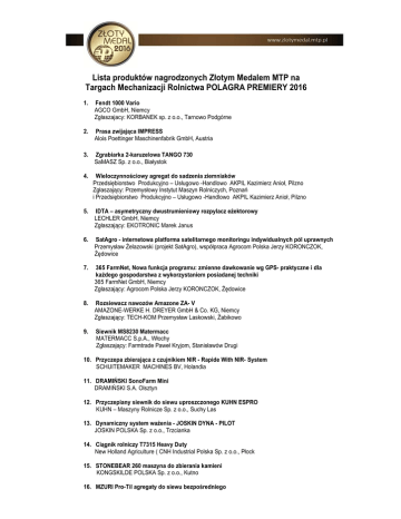 Lista produktów nagrodzonych Złotym Medalem MTP na Targach Mechanizacji Rolnictwa POLAGRA PREMIERY 2016 1. Fendt 1000 Vario AGCO GmbH, Niemcy Zgłaszajacy: KORBANEK sp. z o.o., Tarnowo Podgórne 2. Prasa zwijająca IMPRESS Alois Poettinger Maschinenfabrik GmbH, Austria 3. Zgrabiarka 2-karuzelowa TANGO 730 SaMASZ Sp. z o.o., Białystok 4. Wieloczynnościowy agregat do sadzenia ziemniaków Przedsiębiorstwo Produkcyjno – Usługowo -Handlowo AKPIL Kazimierz Anioł, Pilzno Zgłaszający: Przemysłowy Instytut Maszyn Rolniczych, Poznań i Przedsiębiorstwo Produkcyjno – Usługowo -Handlowo AKPIL Kazimierz Anioł, Pilzno 5. IDTA – asymetryczny dwustrumieniowy rozpylacz eżektorowy LECHLER GmbH, Niemcy Zgłaszający: EKOTRONIC Marek Janus 6. SatAgro - internetowa platforma satelitarnego monitoringu indywidualnych pól uprawnych Przemysław Żelazowski (projekt SatAgro), współpraca Agrocom Polska Jerzy KORONCZOK, Żędowice 7. 365 FarmNet, Nowa funkcja programu: zmienne dawkowanie wg GPS- praktyczne i dla każdego gospodarstwa z wykorzystaniem posiadanej techniki 365 FarmNet GmbH, Niemcy Zgłaszający: Agrocom Polska Jerzy KORONCZOK, Żędowice 8. Rozsiewacz nawozów Amazone ZA- V AMAZONE-WERKE H. DREYER GmbH & Co. KG, Niemcy Zgłaszający: TECH-KOM Przemysław Laskowski, Żabikowo 9. Siewnik MS8230 Matermacc MATERMACC S.p.A., Włochy Zgłaszający: Farmtrade Paweł Kryjom, Stanisławów Drugi 10. Przyczepa zbierająca z czujnikiem NIR - Rapide With NIR- System SCHUITEMAKER MACHINES BV, Holandia 11. DRAMIŃSKI SonoFarm Mini DRAMIŃSKI S.A. Olsztyn 12. Przyczepiany siewnik do siewu uproszczonego KUHN ESPRO KUHN – Maszyny Rolnicze Sp. z o.o., Suchy Las 13. Dynamiczny system ważenia - JOSKIN DYNA - PILOT JOSKIN POLSKA Sp. z o.o., Trzcianka 14. Ciągnik rolniczy T7315 Heavy Duty New Holland Agriculture ( CNH Industrial Polska Sp. z o.o., Płock 15. STONEBEAR 260 maszyna do zbierania kamieni KONGSKILDE POLSKA Sp. z o.o., Kutno 16. MZURI Pro-Til agregaty do siewu bezpośredniego Mzuri Ltd Springfield Farm, Wielka Brytania Zgłaszający: Agro-Land Marek Rożniak, Śmielin 17. Ciągniki rolnicze VALTRA serii N - model N154 EcoPower VALTRA INC, Finlandia Zgłaszający : AGCO Sp. z o.o., Paczkowo 18. Wał uprawowy składany hydraulicznie TYTAN 600 EXPOM Sp. z o.o., Krośniewice 19. Kombajn zbożowy S680i z systemem Integrated Combine Adjustment 2 (ICA2) oraz z systemem Active Yield John Deere Werke Zweibruecken, Niemcy Zgłaszający: John Deere Polska, Tarnowo Podgórne 20. Sieczkarnie John Deere serii 8000 z systemami ProcCut oraz Synchronizacji Aktywnej Kontroli Załadunku John Deere Werke Zweibruecken, Niemcy Zgłaszający: John Deere Polska, Tarnowo Podgórne 21. Ciągnik rolniczy 9620X John Deere Watrloo Works, USA Zgłaszający: John Deere Polska sp. z o.o., Tarnowo Podgórne 22. Pług dłutowy Terraland TN PROFI 3000+Ferti Box BEDNAR FMT, Republika Czeska 23. Opryskiwacz VEGA 12 LEMKEN GmbH +Co.KG, Niemcy Zgłaszający: LEMKEN POLSKA sp. z o.o., Zalęcino 24. Prasa KRONE BIG PACK 129 HDP II Bernard Krone Holding GmbH & Co.KG, Niemcy Zgłaszający : PUP Agromix Sp. z o.o., Rojęczyn 25. Ładowarka teleskopowa MANITU MVT 730 MANITOU / oddział MANITOU POLSKA Sp. z o.o., Raszyn Zgłaszający : PUP Agromix Sp. z o.o., Rojęczyn