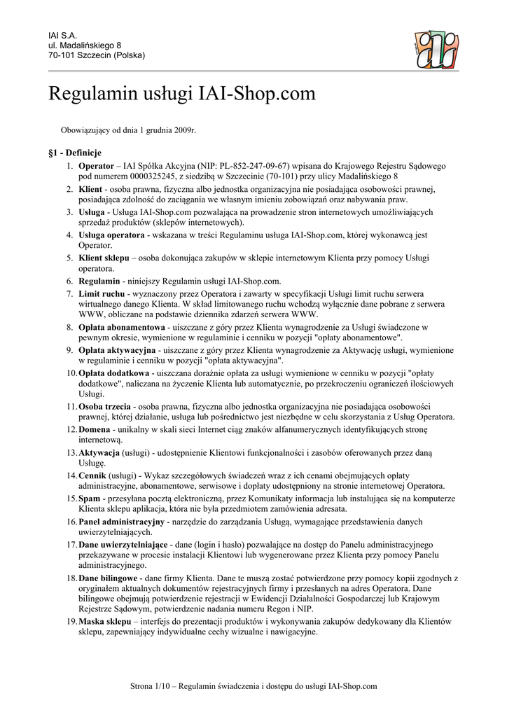 IAI S.A. ul. Madalińskiego 8 70-101 Szczecin (Polska) Regulamin usługi IAI-Shop.com Obowiązujący od dnia 1 grudnia 2009r. §1 - Definicje 1. Operator – IAI Spółka Akcyjna (NIP: PL-852-247-09-67) wpisana do Krajowego Rejestru Sądowego pod numerem 0000325245, z siedzibą w Szczecinie (70-101) przy ulicy Madalińskiego 8 2. Klient - osoba prawna, fizyczna albo jednostka organizacyjna nie posiadająca osobowości prawnej, posiadająca zdolność do zaciągania we własnym imieniu zobowiązań oraz nabywania praw. 3. Usługa - Usługa IAI-Shop.com pozwalająca na prowadzenie stron internetowych umożliwiających sprzedaż produktów (sklepów internetowych). 4. Usługa operatora - wskazana w treści Regulaminu usługa IAI-Shop.com, której wykonawcą jest Operator. 5. Klient sklepu – osoba dokonująca zakupów w sklepie internetowym Klienta przy pomocy Usługi operatora. 6. Regulamin - niniejszy Regulamin usługi IAI-Shop.com. 7. Limit ruchu - wyznaczony przez Operatora i zawarty w specyfikacji Usługi limit ruchu serwera wirtualnego danego Klienta. W skład limitowanego ruchu wchodzą wyłącznie dane pobrane z serwera WWW, obliczane na podstawie dziennika zdarzeń serwera WWW. 8. Opłata abonamentowa - uiszczane z góry przez Klienta wynagrodzenie za Usługi świadczone w pewnym okresie, wymienione w regulaminie i cenniku w pozycji "opłaty abonamentowe". 9. Opłata aktywacyjna - uiszczane z góry przez Klienta wynagrodzenie za Aktywację usługi, wymienione w regulaminie i cenniku w pozycji "opłata aktywacyjna". 10.Opłata dodatkowa - uiszczana doraźnie opłata za usługi wymienione w cenniku w pozycji "opłaty dodatkowe", naliczana na życzenie Klienta lub automatycznie, po przekroczeniu ograniczeń ilościowych Usługi. 11.Osoba trzecia - osoba prawna, fizyczna albo jednostka organizacyjna nie posiadająca osobowości prawnej, której działanie, usługa lub pośrednictwo jest niezbędne w celu skorzystania z Usług Operatora. 12.Domena - unikalny w skali sieci Internet ciąg znaków alfanumerycznych identyfikujących stronę internetową. 13.Aktywacja (usługi) - udostępnienie Klientowi funkcjonalności i zasobów oferowanych przez daną Usługę. 14.Cennik (usługi) - Wykaz szczegółowych świadczeń wraz z ich cenami obejmujących opłaty administracyjne, abonamentowe, serwisowe i dopłaty udostępniony na stronie internetowej Operatora. 15.Spam - przesyłana pocztą elektroniczną, przez Komunikaty informacja lub instalująca się na komputerze Klienta sklepu aplikacja, która nie była przedmiotem zamówienia adresata. 16.Panel administracyjny - narzędzie do zarządzania Usługą, wymagające przedstawienia danych uwierzytelniających. 17.Dane uwierzytelniające - dane (login i hasło) pozwalające na dostęp do Panelu administracyjnego przekazywane w procesie instalacji Klientowi lub wygenerowane przez Klienta przy pomocy Panelu administracyjnego. 18.Dane bilingowe - dane firmy Klienta. Dane te muszą zostać potwierdzone przy pomocy kopii zgodnych z oryginałem aktualnych dokumentów rejestracyjnych firmy i przesłanych na adres Operatora. Dane bilingowe obejmują potwierdzenie rejestracji w Ewidencji Działalności Gospodarczej lub Krajowym Rejestrze Sądowym, potwierdzenie nadania numeru Regon i NIP. 19.Maska sklepu – interfejs do prezentacji produktów i wykonywania zakupów dedykowany dla Klientów sklepu, zapewniający indywidualne cechy wizualne i nawigacyjne. Strona 1/10 – Regulamin świadczenia i dostępu do usługi IAI-Shop.com IAI S.A. ul. Madalińskiego 8 70-101 Szczecin (Polska) 20.Serwer dedykowany – serwer będący własnością Operatora, zarządzany wyłącznie przez Operatora, którego zasoby sprzętowe wykorzystywane są wyłącznie przez Klienta, na którego przerzucany jest pełen koszt utrzymania. 21.Wytyczne – warunki brzegowe kierunkujące Operatora na etapie projektowania przy wdrożeniu Maski sklepu lub funkcji dodatkowych definiowane przez Klienta w formie pisemnej przed przystąpieniem do prac wdrożeniowych i nie modyfikowane na etapie wdrożenia. 22.Komunikat – wiadomość wysłana z Panelu administracyjnego przy pomocy specjalnego systemu do komunikacji między Klientem a Operatorem. Każdy Komunikat oprócz treści opatrzony jest imieniem i nazwiskiem osoby wysyłającej oraz datą i godzina jego wysłania. Komunikaty po wysłaniu nie mogą być modyfikowane. 23.Aplikacje Pomocnicze – dodatkowe programy instalowane poza Usługą zwiększające funkcjonalność systemu o niestandardowe funkcje. Podstawą korzystania z Aplikacji Pomocniczych jest posiadanie klucza licencyjnego dostępnego na zasadach opisanych w Cenniku. 24.Saldo – łączna wartość nieuregulowanych faktur vat oraz zrealizowanych prac serwisowych i opłat dodatkowych, które nie znalazły się na fakturach vat wystawianych przez Operatora. 25.Tryb produkcyjny – faza wywiązywania się Operatora ze świadczenia w pełni Usługi dla wybranej maski, dla której zostały zakończone wszystkie podstawowe czynności wdrożeniowe i jest naliczany abonament lub opłaty dodatkowe za utrzymanie dodatkowej maski sklepu. 26.IAI-News – system przekazywania informacji wszystkim Klientom korzystających z Usługi poprzez Panel administracyjny. Informacje przekazywane przez IAI-News mają taki sam charakter jak pisma papierowe, zwłaszcza w kwestii zawiadomienia z wyprzedzeniem o zmianach lub prowadzonych pracach. §2 - Przedmiot regulaminu i postanowienia wstępne 1. Postanowienia zawarte w niniejszym Regulaminie określają sposób korzystania z Usługi, zakres odpowiedzialności oraz wszelkie inne informacje o charakterze porządkowym. 2. Zapoznanie się z Regulaminem jako integralną częścią łączącej strony umowy jest niezbędne. Jakiekolwiek zachowania Klienta i Operatora sprzeczne z treścią Regulaminu będą powodować skutki wynikające bezpośrednio z treści Regulaminu oraz z obowiązujących przepisów prawa. 3. Dokonanie pierwszej zapłaty za Usłu