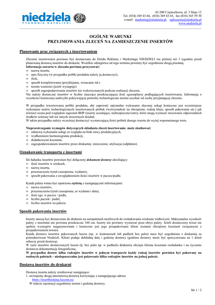 42-200 Częstochowa, ul. 3 Maja 12 Tel. (034) 369 43 66, (034) 369 43 65, fax (034) 365 59 30 e-mail: [email protected], ogł[email protected] www.niedziela.pl ________________________________________________________________________________________________________________ OGÓLNE WARUNKI PRZYJMOWANIA ZLECEŃ NA ZAMIESZCZENIE INSERTÓW Planowanie prac związanych z insertowaniem Zlecenie insertowania powinno być dostarczane do Działu Reklamy i Marketingu NIEDZIELI nie później niż 3 tygodnie przed planowaną dostawą insertów do drukarni. Wszelkie odstępstwa od tego terminu powinny być uzgodnione drogą pisemną. Informacja zawarta w zleceniu powinna precyzować: • nazwę insertu, • opis fizyczny (w przypadku próbki produktu należy ją dostarczyć), • ilość, • sposób kompletowania (przyklejanie, wrzucanie itd.) • termin ważności (jeżeli występuje) • sposób zagospodarowania insertów nie wykorzystanych podczas realizacji zlecenia. Nie należy dostarczać insertów w liczbie znacząco przekraczającej ilość egzemplarzy podlegających insertowaniu. Informację o wysokości koniecznej nadwyżki pokrywającej potrzeby technologiczne można uzyskać od osoby przyjmującej zlecenie. W przypadku inwertowania próbki produktu, aby zapewnić optymalne wykonanie zleconej usługi konieczne jest wcześniejsze wykonanie testów technologicznych insertowanych próbek (wytrzymałość na obciążenie, rodzaj kleju, sposób pakowania etc.) jak również ocena pod względem zagrożeń BHP (inserty uczulające, niebezpieczne/ostre), które mogą wymusić stosowanie odpowiednich środków ochrony lub też innych stosownych działań. W takim przypadku należy wcześniej dostarczyć wystarczającą ilości próbek danego insertu do wyżej wspomnianego testu. Nieprzestrzeganie wymogów dotyczących składania zleceń insertowania może skutkować: • odmową wykonania usługi ze względu na brak mocy produkcyjnych, • wydłużeniem harmonogramu produkcji, • dodatkowymi kosztami, • zagospodarowaniem insertów przez drukarnię: zniszczenie, utylizacja (odpłatnie). Oznakowanie transportu z insertami Do ładunku insertów powinien być dołączony dokument dostawy określający: • ilość insertów w sztukach, • nazwę insertu, • przeznaczenie (tytuł czasopisma, wydanie), • sposób pakowania z uwzględnieniem ilości insertów w paczce/pudle. Każda paleta winna być opatrzona etykietą z następującymi informacjami: • nazwa insertów, • przeznaczeniu (tytuł czasopisma, nr wydania i data), • ilość egz. w paczce / pudle, • liczbie paczek / pudeł, • liczbie insertów na palecie. Sposób pakowania insertów Inserty muszą być dostarczone do drukarni na europaletach możliwych do rozładowania wózkami widłowymi. Maksymalna wysokość palety z insertami nie powinna przekraczać 160 cm. Inserty nie powinny wystawać poza obrys palety. Jeżeli dostarczony towar nie spełnia wymogów magazynowania i konieczne jest jego przepakowanie klient zostanie obciążony kosztami związanymi z przepakowaniem towaru. Każda dostawa insertów pakowanych luzem (np. w kontenerach lub pudłach bez palet) musi być uzgodniona z drukarnią za pośrednictwem Niedzieli. Klient podaje dokładną datę i godzinę dostawy (godzina dostawy może być sprecyzowana na 1 dzień roboczy przed dostawą). W razie insertów dostarczonych luzem (tj. bez palet np. w pudłach) drukarnia obciąża klienta kosztami rozładunku i na życzenie dostarcza dokumentację fotograficzną. W przypadku dostaw kilku rodzajów insertów w jednym transporcie każdy rodzaj insertów powinien być pakowany na osobnych paletach – niedopuszczalne jest pakowanie kilku rodzajów insertów na jednej palecie. Dostawa insertów do drukarni Dostawę insertu należy zrealizować następująco: 1. awizujemy drogą internetową dostawę korzystając z następującego adresu https://insertbooking.lsccom.eu/ W trakcie rejestracji uzgodnimy termin i godzinę dostawy. Str 1 / 2 42-200 Częstochowa, ul. 3 Maja 12 Tel. (034) 369 43 66, (034) 369 43 65, fax (034) 365 59 30 e-mail: [email protected], ogł[email protected] www.niedziela.pl ________________________________________________________________________________________________________________ 2. przesyłkę należy dostarczyć do: Drukarnia LSC Communications Europe (dawniej RR Donnelley) Magazyn insertów Ul. Półłanki 18, 30-740 Kraków Należy przyjąć, iż data dostarczenia materiałów to najpóźniej 10 dni przed datą wydawniczą. Termin ten może być zakłócony w okresach świątecznych dlatego wymagana jest każdorazowa konsultacja terminu dostawy. Dostawa insertów ze znacznym wyprzedzeniem czasowym w stosunku do daty dostarczenia materiałów także podlega konsultacji ze względu na ograniczoną powierzchnię magazynową oraz koszty składowania. Spóźnienia w dostarczeniu insertów mogą skutkować: • wydłużeniem harmonogramu produkcji, • dodatkowymi kosztami (czas przestoju pracowników i maszyn związany z brakiem insertów koniecznych do realizacji zlecenia). Z powodu braku miejsca magazynowego, nieuzgodnione dostawy będą kierowane do zewnętrznych odpłatnych magazynów. Dyspozycje odnośnie pozostałości poprodukcyjnych Po wykonaniu zlecenia insertowania prosimy o podjęcie decyzji odnośnie zagospodarowania pozostałości poprodukcyjnych na jeden z poniższych sposobów: • odpłatna utylizacja • odpłatny zwrot do miejsca wskazanego przez Klienta • nieodpłatne przekazanie na cele charytatywne • insert dodatkowy w dalszym wybranym terminie Decyzja winna być podjęta do 7 dni roboczych po zakończeniu produkcji. Inserty składowane będą bezpłatnie do 14 dni roboczych od zakończenia produkcji. Po tym okresie inserty przekazywane będą do magazynów zewnętrznych i składowane odpłatnie. Wysokość opłat związanych z utylizacją, zwrotem i przechowywaniem określa drukarnia. Inne uwagi Prosimy, aby wszelkie informacje do