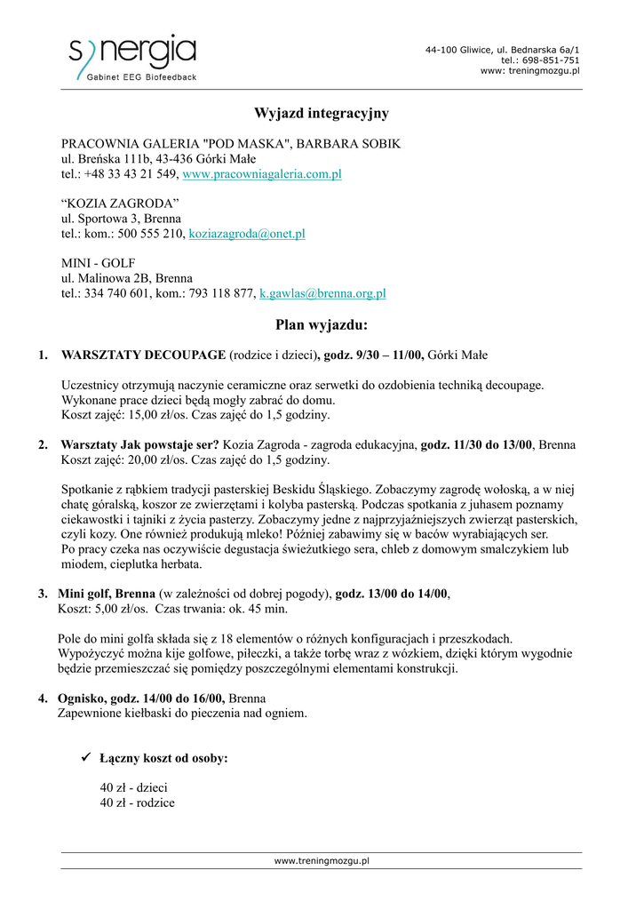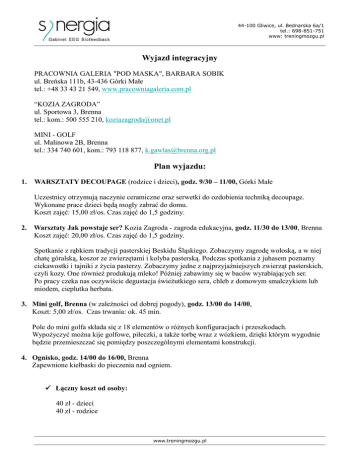 44-100 Gliwice, ul. Bednarska 6a/1 tel.: 698-851-751 www: treningmozgu.pl Wyjazd integracyjny PRACOWNIA GALERIA "POD MASKA", BARBARA SOBIK ul. Breńska 111b, 43-436 Górki Małe tel.: +48 33 43 21 549, www.pracowniagaleria.com.pl “KOZIA ZAGRODA” ul. Sportowa 3, Brenna tel.: kom.: 500 555 210, [email protected] MINI - GOLF ul. Malinowa 2B, Brenna tel.: 334 740 601, kom.: 793 118 877, [email protected] Plan wyjazdu: 1. WARSZTATY DECOUPAGE (rodzice i dzieci), godz. 9/30 – 11/00, Górki Małe Uczestnicy otrzymują naczynie ceramiczne oraz serwetki do ozdobienia techniką decoupage. Wykonane prace dzieci będą mogły zabrać do domu. Koszt zajęć: 15,00 zł/os. Czas zajęć do 1,5 godziny. 2. Warsztaty Jak powstaje ser? Kozia Zagroda - zagroda edukacyjna, godz. 11/30 do 13/00, Brenna Koszt zajęć: 20,00 zł/os. Czas zajęć do 1,5 godziny. Spotkanie z rąbkiem tradycji pasterskiej Beskidu Śląskiego. Zobaczymy zagrodę wołoską, a w niej chatę góralską, koszor ze zwierzętami i kolyba pasterską. Podczas spotkania z juhasem poznamy ciekawostki i tajniki z życia pasterzy. Zobaczymy jedne z najprzyjaźniejszych zwierząt pasterskich, czyli kozy. One również produkują mleko! Później zabawimy się w baców wyrabiających ser. Po pracy czeka nas oczywiście degustacja świeżutkiego sera, chleb z domowym smalczykiem lub miodem, cieplutka herbata. 3. Mini golf, Brenna (w zależności od dobrej pogody), godz. 13/00 do 14/00, Koszt: 5,00 zł/os. Czas trwania: ok. 45 min. Pole do mini golfa składa się z 18 elementów o różnych konfiguracjach i przeszkodach. Wypożyczyć można kije golfowe, piłeczki, a także torbę wraz z wózkiem, dzięki którym wygodnie będzie przemieszczać się pomiędzy poszczególnymi elementami konstrukcji. 4. Ognisko, godz. 14/00 do 16/00, Brenna Zapewnione kiełbaski do pieczenia nad ogniem. Łączny koszt od osoby: 40 zł - dzieci 40 zł - rodzice www.treningmozgu.pl 44-100 Gliwice, ul. Bednarska 6a/1 tel.: 698-851-751 www: treningmozgu.pl Organizacja, wsparcie i opieka: Łukasz Żynda, Fizjoterapeuta, Państwowa Wyższa Szkoła Zawodowa w Pile, Zdrowie Publiczne - Studia magisterskie Uniwersytet Medyczny w Poznaniu, Fizjoterapia w kardiologii - studia podyplomowe Uniwersytet Medyczny w Szczecinie. Instruktor Ultimate Frisbee, Terapeuta BFB, Terapeuta SI 796-337-052, [email protected] Barbara Kusto Psychologia Społeczna, Uniwersytet Opolski Psychologia Kliniczna, SWPS, Katowice (w trakcie) Dogoterapeuta, Terapeuta BFB, Terapeuta SI 667-289-145, [email protected] Osoby zainteresowane proszę o kontakt: Iwona Garcarz, nr telefonu: 698-851-751 www.treningmozgu.pl