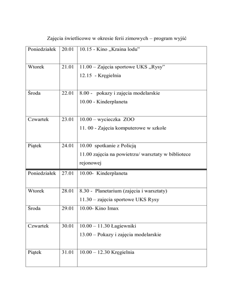 Zajęcia świetlicowe w okresie ferii zimowych – program wyjść Poniedziałek 20.01 10.15 - Kino „Kraina lodu” Wtorek 21.01 11.00 – Zajęcia sportowe UKS „Rysy” 12.15 - Kręgielnia Środa 22.01 8.00 - pokazy i zajęcia modelarskie 10.00 - Kinderplaneta Czwartek 23.01 10.00 – wycieczka ZOO 11. 00 - Zajęcia komputerowe w szkole Piątek 24.01 10.00 spotkanie z Policją 11.00 zajęcia na powietrzu/ warsztaty w bibliotece rejonowej Poniedziałek 27.01 10.00- Kinderplaneta Wtorek 28.01 8.30 - Planetarium (zajęcia i warsztaty) 11.30 – zajęcia sportowe UKS Rysy Środa 29.01 10.00- Kino Imax Czwartek 30.01 10.00 – 11.30 Łagiewniki 13.00 – Pokazy i zajęcia modelarskie Piątek 31.01 10.00 – 12.30 Kręgielnia