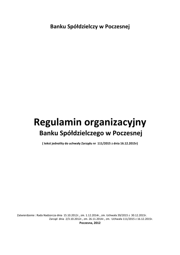 Banku Spółdzielczy w Poczesnej Regulamin organizacyjny Banku Spółdzielczego w Poczesnej ( tekst jednolity do uchwały Zarządu nr 111/2015 z dnia 16.12.2015r) Zatwierdzenie : Rada Nadzorcza dnia 15.10.2012r., zm. 1.12.2014r., zm. Uchwała 39/2015 z 30.12.2015r. Zarząd dnia 2/3.10.2012r., zm. 26.11.2014r., zm. Uchwała 111/2015 z 16.12.2015r. Poczesna, 2012 Spis treści : Wstęp....................................................................................................................................................................... 3 Zasady organizacji organów banku ......................................................................................................................... 3 Zasady realizowania długoterminowych celów prowadzenia działalności ............................................................ 6 Zasady zarządzania działalnością banku oraz zarządzania ryzykami . ..................................................................... 7 Organizacja zarządzania – kluczowe funkcje w banku............................................................................................. 8 Podstawowe zadania wspólne wszystkich komórek organizacyjnych banku ...................................................... 10 Podstawowe zadania poszczególnych komórek organizacyjnych ....................................................................... 11 Organizacja systemu kontroli wewnętrznej........................................................................................................... 19 Organizacja sporządzania informacji i sprawozdań dla potrzeb podejmowania decyzji zarządczych przez zarząd Banku i nadzorczych przez radę nadzorczą i właścicieli banku .............................................................................. 20 Organizacja sporządzania i obiegu dokumentów .................................................................................................. 20 Zasady realizacji przez bank wymogów wynikających z przepisów prawa z uwzględnieniem rekomendacji nadzorczych wydawanych przez krajowe i europejskie urzędy nadzoru finansowego ..................................... 22 Zasady określające relacje banku z pracownikami . .............................................................................................. 22 Zasady określające relacje banku z udziałowcami i klientami . ............................................................................. 23 Organizacja czasu pracy w banku .......................................................................................................................... 24 Ochrona informacji stanowiących tajemnicę bankową i tajemnicę zawodową .................................................... 24 2 Wstęp Mając na uwadze Statut Banku , własne cele strategiczne Banku , przepisy prawa , regulacje nadzorcze , w tym zasady ładu korporacyjnego , ustala się organizację Banku , której celem jest : - umożliwienie Bankowi realizowania długoterminowych celów prowadzenia działalności ; - sprawne zarządzanie działalnością gospodarczą Banku w celu realizacji interesów właścicieli Banku; - skuteczne i efektywne zarządzanie ryzykami w celu minimalizacji potencjalnych i rzeczywistych strat wynikających z działalności gospodarczej Banku; - wykonywanie skutecznej kontroli wewnętrznej każdego obszaru działalności Banku, - zapewnienie sporządzania rzetelnych informacji i sprawozdań zewnętrznych i wewnętrznych dla potrzeb podejmowania decyzji zarządczych przez zarząd Banku i nadzorczych przez radę nadzorczą i właścicieli Banku; - zapewnienie rzetelnego sporządzania i obiegu dokumentów odzwierciedlających przebieg procesów gospodarczych zachodzących w Banku oraz prowadzenie na ich podstawie ksiąg rachunkowych; - zapewnienie przestrzegania wymogów wynikających z przepisów prawa z uwzględnieniem rekomendacji nadzorczych wydawanych przez krajowe i europejskie urzędy nadzoru finansowego ; - efektywne gospodarowanie zasobami ludzkimi , jako najwyższym dobrem Banku , w celu wykonywanie zadań gospodarczych z najwyższą starannością , zasadami etyki bankowej i z zachowaniem poszanowania praw udziałowców i klientów ; - należyta ochrona praw pracowników i należyte uwzględnianie ich interesów , w szczególności poprzez stosowanie przejrzystych i obiektywnych zasad zatrudniania i wynagradzania, oceny, a także nagradzania i awansu zawodowego ; - zapewnienie pracownikom odpowiedniego dostępu do informacji o zakresach uprawnień, obowiązkach i odpowiedzialności poszczególnych komórek organizacyjnych Banku; - określenie zasad relacji Banku z udziałowcami i klientami; Zasady organizacji organów Banku § 1 1. Regulamin niniejszy ustala wewnętrzną organizację Banku oraz strukturę organizacyjną Banku. 2. Bank Spółdzielczy w Poczesnej jest spółdzielnią i działa pod Firmą Bank Spółdzielczy w Poczesnej z siedzibą w Poczesnej przy ul. Bankowej 1, na podstawie statutu zarejestrowanego w Sądzie Rejonowym w Częstochowie pod numerem KRS 0000049133 oraz przepisów obowiązującego prawa. 3. Zgodnie z postanowieniami obowiązującego w Banku statutu , który przewiduje zastąpienie Walnego Zgromadzenia , Zebraniem Przedstawicieli , ze względu na liczbę członków , organami Banku są : 1) zebranie przedstawicieli, dalej w Regulaminie ZP 2) rada nadzorcza, dalej w Regulaminie RN, 3) zarząd, 4) zebranie grup członkowskich, dalej w Regulaminie ZGCz . 3 §2 1. ZP, jest organem stanowiącym i działa w zakresie i w sposób określony w Statucie Banku , a w zakresie nie uregulowanym postanowieniami statutu - w zakresie i w sposób określony w ustawie Prawo spółdzielcze oraz w niniejszym Regulaminie . 2. Zasady i terminy zwołania ZP oraz osoby uprawnione do zwołania określa Statut Banku. 3. Projekt porządku obrad ZP sporządza zarząd Banku i doręcza przedstawicielom w terminie i w sposób określony w Statucie Banku. 4. Z