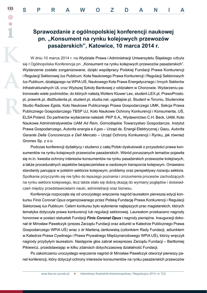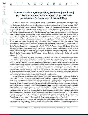 133 S P R A W O Z D A N I A Sprawozdanie z ogólnopolskiej konferencji naukowej pn. „Konsument na rynku kolejowych przewozów pasażerskich”, Katowice, 10 marca 2014 r. W dniu 10 marca 2014 r. na Wydziale Prawa i Administracji Uniwersytetu Śląskiego odbyła się I Ogólnopolska Konferencja pn. „Konsument na rynku kolejowych przewozów pasażerskich”. Wydarzenie zostało zorganizowane, dzięki współpracy Polskiej Fundacji Prawa Konkurencji i Regulacji Sektorowej Ius Publicum, Koła Naukowego Prawa Konkurencji i Regulacji Sektorowych Ius Publicum, działającego na WPiA UŚ, Naukowego Koła Prawa Energetycznego i Innych Sektorów Infrastrukturalnych UŁ oraz Wyższej Szkoły Bankowej z oddziałem w Chorzowie. Wydarzeniu patronowało wiele podmiotów, do których należą Wolters Kluwer Lex, student.LEX.pl, PrawoProsto. pl, prawnik.pl, dlaStudenta.pl, student.pl, studia.net, ugadajsie.pl, Student w Toruniu, Studenckie Studio Radiowe Egida, Koło Naukowe Publicznego Prawa Gospodarczego UMK, Sekcja Prawa Publicznego Gospodarczego TBSP UJ, Koło Naukowe Ochrony Konkurencji i Konsumenta, UŚ, ELSA Poland. Do partnerów wydarzenia należeli: PKP S.A., Wydawnictwo C.H. Beck, UAM, Koło Naukowe Administratywistów UAM Ad Rem, Górnośląskie Towarzystwo Gospodarcze, Instytut Prawa Gospodarczego, Autorita energia e il gas – Urząd ds. Energii Elektrycznej i Gazu, Autorita Garante Della Concorenzza e Dell Mercato – Urząd Ochrony Konkurencji i Rynku, jak również Gromex Sp. z o.o. Podczas konferencji dydaktycy i studenci z całej Polski dyskutowali o przyszłości prawa konsumentów na rynku kolejowych przewozów pasażerskich. Wśród poruszanych tematów pojawiła się m.in. kwestia ochrony interesów konsumentów na rynku pasażerskich przewozów kolejowych, a także proceduralnych aspektów bezpieczeństwa w osobowym transporcie kolejowym. Omawiano standardy panujące w polskim sektorze kolejowym, problemy oraz perspektywy rozwoju sektora. Spotkanie przyczyniło się nie tylko do lepszego poznania i zrozumienia procesów zachodzących na rynku sektora kolejowego, lecz także stało się dobrą okazją do wymiany poglądów i doświadczeń między przedstawicielami nauki, administracji oraz biznesu. Konferencja rozpoczęła się od uroczystego wręczenia nagród laureatom pierwszej edycji konkursu Finis Coronat Opus organizowanego przez Polską Fundację Prawa Konkurencji i Regulacji Sektorowej Ius Publicum. Celem konkursu było wyłonienie najlepszych prac magisterskich, których tematyka dotyczyła prawa konkurencji lub regulacji sektorowej. Laureatom przekazano nagrody honorowe w postaci statuetek Fundacji Finis Coronat Opus i nagrody pieniężne. Inauguracji dokonał dr Mirosław Pawełczyk (prezes Zarządu Fundacji oraz adiunkt w Katedrze Publicznego Prawa Gospodarczego WPiA UŚ) wraz z dr Marleną Jankowską (członkiem Rady Fundacji, adiunktem w Katedrze Prawa Cywilnego i Prawa Prywatnego Międzynarodowego WPiA UŚ), którzy wręczyli nagrody przybyłym laureatom. Następnie głos zabrał wiceprezes Zarządu Fundacji – Bartłomiej Pikiewicz, przedstawiając w kilku zdaniach dotychczasową działalność Fundacji. Po zakończeniu uroczystego wręczenia nagród dr Mirosław Pawełczyk otworzył pierwszy panel konferencji, który dotyczył ochrony interesów konsumentów na rynku pasażerskich przewozów www.ikar.wz.uw.edu.pl internetowy Kwartalnik Antymonopolowy i Regulacyjny 2014, nr 7(3) 134 Marcin Kraśniewski Sprawozdanie z ogólnopolskiej konferencji naukowej... kolejowych. Pierwszy referat został wygłoszony przez dr Monikę Przybylską (UWr), która poruszyła kwestie związane z ochroną konsumentów – pasażerów w transporcie kolejowym. Prelegentka zaprezentowała różnice pomiędzy definicją konsumenta a pasażera, jak również przedstawiła kompetencje Prezesa UTK, dokonując analizy porównawczej z kompetencjami Prezesa UOKiK. Kolejną prelegentką była Joanna Tabeńska (doktorantka, UŚ), która swoje wystąpienie poświęciła zagadnieniu postanowień wzorców umów stosowanych przez wybranych przewoźników, w sposób szczególny analizując naruszenia zbiorowych interesów konsumentów. Ostatni referat w pierwszym panelu wygłosiła Dobrosława Tomzik (UŚ). W ramach swojej prezentacji przedstawiła problem ograniczania prawa konsumenta do zmiany lub odstąpienia od umowy przewozu transportem kolejowym. Panel pierwszy zwieńczyła dyskusja związana z wygłoszonymi referatami, którą poprowadził moderator pierwszego panelu. Kolejny panel dotyczył proceduralnych aspektów bezpieczeństwa w osobowym transporcie kolejowym. Moderatorem panelu był Mariusz Hassa (prezes Zarządu Stowarzyszenia OPPEN). Moderator dokonał krótkiego wprowadzenia w zakres tematyczny panelu drugiego. Pierwszy referat – „Postępowanie w sprawach wypadków kolejowych – wybrane problemy prawne” wygłosiła dr Katarzyna Wlaźlak (WPiA UŁ). Tematem rozważań były wybrane problemy prawne dotyczące postępowania w sprawach wypadków kolejowych. W prezentacji zostały omówione m.in. wybrane przepisy krajowe i unijne, a także problem braku precyzji przepisów dotyczących omawianej kwestii. Prelegentka zaznaczyła, iż bardzo istotne jest skonkretyzowanie w rozporządzeniu ministra obowiązku przewoźnika kolejowego, o którym stanowi wprost art. 28g utk, jak również wskazała na niejasność art. 28j ust. 1 utk. Kolejnym prelegentem była dr Maria Karcz-Kaczmarek (WPiA UŁ). W tej części konferencji uczestnicy spotkania zapoznali się z tematem zapewniania bezpieczeństwa i porządku w pociągach i na obszarze kolejowym. Dr M. Karcz-Kaczmarek przedstawiła w sposób szczególny kompetencje straży ochrony kolei, a także zestawienie popełniania przestępstw na dworcach kolejowych w największych miastach Polski i skalę ich wykrywalności. Na zakończenie drugiego panelu Aleksandra Makarucha (UŚ) przedstawiła publiczności perspektywy i wpływ, jaki na rozwó