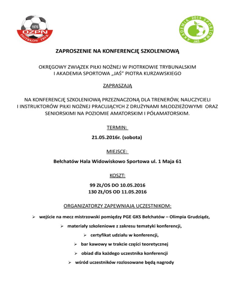 ZAPROSZENIE NA KONFERENCJĘ SZKOLENIOWĄ OKRĘGOWY ZWIĄZEK PIŁKI NOŻNEJ W PIOTRKOWIE TRYBUNALSKIM I AKADEMIA SPORTOWA „JAŚ” PIOTRA KURZAWSKIEGO ZAPRASZAJĄ NA KONFERENCJĘ SZKOLENIOWĄ PRZEZNACZONĄ DLA TRENERÓW, NAUCZYCIELI I INSTRUKTORÓW PIŁKI NOŻNEJ PRACUJĄCYCH Z DRUŻYNAMI MŁODZIEŻOWYMI ORAZ SENIORSKIMI NA POZIOMIE AMATORSKIM I PÓŁAMATORSKIM. TERMIN: 21.05.2016r. (sobota) MIEJSCE: Bełchatów Hala Widowiskowo Sportowa ul. 1 Maja 61 KOSZT: 99 ZŁ/OS DO 10.05.2016 130 ZŁ/OS OD 11.05.2016 ORGANIZATORZY ZAPEWNIAJĄ UCZESTNIKOM: wejście na mecz mistrzowski pomiędzy PGE GKS Bełchatów – Olimpia Grudziądz, materiały szkoleniowe z zakresu tematyki konferencji, certyfikat udziału w konferencji, bar kawowy w trakcie części teoretycznej obiad dla każdego uczestnika konferencji wśród uczestników rozlosowane będą nagrody PARTNERZY WYKŁADY POPROWADZĄ: Rafał Ulatowski - Trener PGE GKS Bełchatów. Licencja trenerska UEFA Pro Licence A. ŁKS Łódź – grupy młodzieżowe. Piotrcovia-Ptak. Kluby islandzkie m.in. Þrottur Reykjavík. Asystent selekcjonera reprezentacji Polski - Leo Beenhakkera. Trener min. Zagłębie Lubin, GKS Bełchatów, Cracovia Kraków, Lechia Gdańsk, Miedź Legnica. Uczestnik trenerskich staży szkoleniowych, m.in. Chelsea F.C. (2003), Glasgow Rangers (2004), Tottenham Hotspur (2006). Krystian Kierach – Koordynator grup młodzieżowych PGE GKS Bełchatów. Trener II drużyny PGE GKS Bełchatów. Licencja UEFA A Damian Zieliński – fizjoterapeuta PGE GKS Bełchatów. Pracował również: EKS Skra Bełchatów, WKS Śląsk Wrocław. Posiadający dyplomy min: Diagnoza i leczenie punktów spustowych według terapii osteopatii, Funkcjonalna terapia manualna, Terapia Manualna McKenzie, MTT- Medyczny trening terapeutyczny, OMT Kaltenborn- EvjentConcept- dyplomowany terapeuta manualny, Współczesne metody diagnozy i leczenia tkanek miękkich, Igłoterapia sucha, Kurs KinesiologyTaping, Instruktor sportu osób niepełnosprawnych – podnoszenie ciężarów Grzegorz Gromadzki/ Maciej Grzywa Marek Świder - Trener przygotowania motorycznego. Wzoruje się na filozofii Marka Verstagena - założyciela jednej z najlepszych agencji motorycznych na świecie Athletes Performance. Zdobytą wiedzę zaczął łączyć z doświadczeniem w pracy z dziećmi. Sukcesywna praca zaowocowała pracą w Ekstraklasowym klubie WKS Śląsk Wrocław, z którym w sezonie 2014/2015 zajął 4 miejsce gwarantujące udział w europejski pucharach. Obecnie pracuje z dziećmi i młodzieżą w szkołach mistrzostwach sportowego we Wrocławiu i Katowicach, wdrażając system LTAD (długofalowy rozwój sportowca). Jakub Prockiw – BIOMED - Od czterech lat wespół z Centrum Rehabilitacji Poznawczej BIOMED z Wrocławia wdraża systemy EEG, aparaturę do treningu słuchowego, wzrokowego i motorycznego na terenie Polski oraz organizuje szkolenia certyfikujące specjalistów. Jest konsultantem w dziedzinie treningów EEG Biofeedback, metody Warnkego i Sensomotoryki. Wybrane narzędzia stosuje w treningach z najmłodszymi adeptami sportu. Dotychczasowe wdrożenia: Akademia Wychowania Fizycznego im. Jerzego Kukuczki w Katowicach Akademia Wychowania Fizycznego i Sportu im. Jędrzeja Śniadeckiego w Gdańsku Akademia Wychowania Fizycznego we Wrocławiu Polski Związek Żeglarstwa Wojskowy Instytut Medycyny Lotniczej w Warszawie INFORMACJE: Zgłoszenie wraz z dowodem wpłaty należy przesyłać na adres email: [email protected] Dane kontaktowe Akademia Sportowa „JAŚ” Piotr Kurzawski Os. Żołnierzy POW 8/110 97-400 Bełchatów NIP: 769 – 186 – 99 – 44 Nr konta: 07 1050 1937 1000 0092 1663 2092 Tytuł przelewu: Konferencja– imię i nazwisko, klub, pesel Tel: 511 401 250