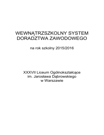 WEWNĄTRZSZKOLNY SYSTEM DORADZTWA ZAWODOWEGO na rok szkolny 2015/2016 XXXVII Liceum Ogólnokształcące im. Jarosława Dąbrowskiego w Warszawie 1. Podstawa prawna: Ustawa z dnia 7 września 1991r. o systemie oświaty (tekst jednolity Dz.U.z 2004r. Nr 256 poz. 2572 ze zm.) Ustawa z dnia 26 stycznia 1982r . - Karta Nauczyciela (Dz. U. z 2003 r., Nr 118, poz. 1112, Nr 137, poz.1304, Nr203, poz. 1966, Nr 228, poz.2258 oraz z 2004 r., Nr 96, poz. 959 i Nr 179 poz. 1845) Rozporządzenie MEN z dnia 21 maja 2001 r. w sprawie ramowych statutów publicznego przedszkola oraz publicznych szkół (Dz. U. z 2001r. Nr 61, poz. 624, z 2002 r. Nr 10, poz. 96, z 2003 r. Nr 146, poz. 1416) Rozporządzenie MEN z dnia 30 kwietnia 2013 r. w sprawie zasad udzielania i organizacji pomocy psychologiczno-pedagogicznej w publicznych przedszkolach, szkołach i placówkach (Dz. U. 2013.532 z dnia 7 maja 2013 r.) Memorandum dotyczące kształcenia ustawicznego. Komisja Wspólnot Europejskich, 2000 r. Rezolucja Rady Unii Europejskiej z 18 Maja 2004 - 9286/04 2. Cel ogólny: Przygotowanie uczniów do trafnego wyboru dalszego kierunku kształcenia i zawodu oraz do roli pracownika na obecnym rynku pracy. Wybór ścieżki zawodowej ma być procesem rozwojowym, który wiąże się z kolejnymi decyzjami podejmowanymi na przestrzeni całego życia ucznia. Wewnątrzszkolny system doradztwa zawodowego ma mieć charakter celowych i zaplanowanych działań w formie pracy indywidualnej i grupowej. 3. Cele szczegółowe: Rozwój aktywności poznawczej uczniów w kierunku samopoznania (predyspozycje zawodowe) Przygotowanie uczniów do dokonywania realistycznych planów kariery edukacyjnej i zawodowej Zachęcanie uczniów do poznawania kierunków kształcenia i wymagań na wyższych uczelniach Rozwój umiejętności społecznych (współpraca, rozwiązywanie konfliktów, autoprezentacja, praca w zespole) Przygotowanie uczniów do roli pracowników na obecnym rynku pracy, uczenie odpowiedzialności i samodzielności w różnych sytuacjach życiowych Uczenie umiejętności podejmowana decyzji dotyczących własnego rozwoju zawodowego (stawianie celów, planowanie, tworzenie więcej niż jednej ścieżek kariery) Stworzenie bazy edukacyjno – informacyjnej dotyczącej wyboru dalszej drogi kształcenia (strona szkoły, tablica informacyjna w szkole) Podnoszenie kompetencji nauczycieli do prowadzenia doradztwa zawodowego w szkole Włączanie rodziców w pomoc własnym dzieciom w zakresie wyboru dalszej drogi kształcenia Współpraca z instytucjami, placówkami pozaszkolnymi, które wspierają proces rozwoju zawodowego uczniów 2 4. Zadania i formy realizacji ZADANIA Określanie predyspozycji zawodowych (cechy osobowości, temperamentu, zdolności i zainteresowania) Samopoznanie i realistyczna ocena siebie w kontekście wykonywania różnych zawodów (mocne i słabe strony) Przekazanie uczniom wiedzy dotyczącej kierunków kształcenia, wymagań na studiach, zawodów i aktualnego rynku pracy FORMY REALIZACJI Badanie testami psychologicznymi, kontakt indywidualny Kontakt indywidualny REALIZATORZY ADRESACI Pedagog szkolny, Uczniowie psycholog I-II szkolny, doradca zawodowy, nauczyciele Pedagog szkolny, psycholog szkolny, nauczyciele, poradnie specjalistyczne Zakładka na stronie Nauczyciele, szkoły dotycząca pedagog szkolny, doradztwa psycholog zawodowego, tablica szkolny informacyjna w szkole, spotkania z przedstawicielami różnych zawodów w szkole i poza szkołą Aktualności dotyczące ofert edukacyjnych w bibliotece szkolnej Kształtowanie Wykłady, warsztaty, Nauczyciele, umiejętności prezentacje, dyskusje, pedagog szkolny, społecznych ćwiczenia, praca w psycholog przygotowujących do grupach szkolny podjęcia roli pracownika TERMIN Cały rok szkolny Uczniowie I-II Cały rok szkolny Uczniowie I-III Cały rok szkolny Uczniowie I- Cały rok III szkolny Kształtowanie Wykłady, ćwiczenia umiejętności podejmowania decyzji i planowania własnej przyszłości zawodowej Nauczyciele, Uczniowie I- Cały rok pedagog szkolny, III szkolny psycholog szkolny Wykłady, ćwiczenia Nauczyciele, Uczniowie I- Cały rok pedagog szkolny, III szkolny psycholog szkolny Rozwijanie umiejętności selektywnego korzystania mediów, internetu z 3 Włączanie wszystkich nauczycieli w proces jakim jest doradztwo zawodowe Szkolenie dla nauczycieli dotyczące doradztwa, przygotowanie w zespołach przedmiotowych planów i sprawozdań dotyczących doradztwa zawodowego na poszczególnych przedmiotach Współpraca z Kontakt indywidualny z rodzicami w zakresie nauczycielami, doradztwa pedagogiem i zawodowego psychologiem szkolnym, korzystanie z informacji zawartych na stronie szkoły i tablicy (zapoznanie rodziców z możliwościami dalszego kształcenia się, z potrzebami rynku pracy, możliwościami zatrudnienia, możliwymi formami wspierania dzieci w tym zakresie) Współpraca z Kontakty indywidualne, placówkami, wykłady i warsztaty instytucjami w ramach doradztwa zawodowego (m.in. Biuro Edukacji m.st. Warszawa, Centrum Rozwoju Doradztwa Zawodowego WCIES, poradnie psychologiczno pedagogiczne, Mobilne Centra Informacji Zawodowej OHP, urzędy pracy, uczelnie wyższe) Nauczyciele, Nauczyciele pedagog szkolny, psycholog szkolny, instytucje zewnętrzne Cały rok szkolny Nauczyciele, Rodzice pedagog szkolny, psycholog szkolny Cały rok szkolny Nauczyciele, Uczniowie, Cały rok pedagog szkolny, nauczyciele i szkolny psycholog rodzice szkolny 4 5. Treści i formy realizowane w ramach poszczególnych przedmiotów. Przedmiot Treści i formy do realizacji Język polski i Zwiększanie kompetencji językowych uczniów (omawianie zagadnień: Wiedza o kulturze zróżnicowanie współczesnej polszczyzny, norma językowa i błąd językowy, grzeczność i etyka językowa, retoryka i erystyka, komunikacja internetowa a zmiany w akcie komunikacji językowej, etykieta, pisma użytkowe, korespondencja e-mailowa). Budowanie wypowiedzi argumentacyjnej (pisemnej i ustnej), ref