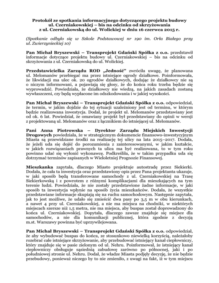 Protokół ze spotkania informacyjnego dotyczącego projektu budowy ul. Czerniakowskiej – bis na odcinku od skrzyżowania z ul. Czerniakowską do ul. Wolickiej w dniu 16 czerwca 2015 r. (Spotkanie odbyło się w Szkole Podstawowej nr 190 im. Orła Białego przy ul. Zwierzynieckiej 10) Pan Michał Bryszewski – Transprojekt Gdański Spółka z o.o. przedstawił informacje dotyczące projektu budowy ul. Czerniakowskiej – bis na odcinku od skrzyżowania z ul. Czerniakowską do ul. Wolickiej. Przedstawicielka Zarządu ROD „Jedność” zwróciła uwagę, że planowana ul. Melomanów przebiegać ma przez istniejące ogrody działkowe. Poinformowała, że likwidacji ma ulec ok. 20 ogrodów działkowych, dodając że działkowcy nie są o niczym informowani, a pojawiają się głosy, że do końca roku trzeba będzie się wyprowadzić. Powiedziała, że działkowcy nie wiedzą, na jakich zasadach zostaną wywłaszczeni, czy będą wypłacone im odszkodowania i w jakiej wysokości. Pan Michał Bryszewski – Transprojekt Gdański Spółka z o.o. odpowiedział, że termin, w jakim dojdzie do tej sytuacji uzależniony jest od terminu, w którym będzie realizowana inwestycja. Dodał, że projekt ul. Melomanów przedstawiany jest od ok. 6 lat. Powiedział, że omawiany projekt był przedstawiany do opinii w wersji z projektowaną ul. Melomanów oraz z łącznikiem do istniejącej ul. Melomanów. Pani Anna Piotrowska – Dyrektor Zarządu Miejskich Inwestycji Drogowych powiedziała, że w strategicznym dokumencie finansowo-inwestycyjnym Miasta są przewidziane środki na realizację tej ulicy na lata 2015–2017. Dodała, że jeżeli uda się dojść do porozumienia z zainteresowanymi, w jakim kształcie, w jakich rozwiązaniach prawnych ta ulica ma być realizowana, to w tym roku powinno udać się wyłonić wykonawcę. Podkreśliła, że w takim przypadku uda się dotrzymać terminów zapisanych w Wieloletniej Prognozie Finansowej. Mieszkanka zapytała, dlaczego Miasto projektuje autostradę przez Siekierki. Dodała, że cała ta inwestycja oraz przedstawiony opis przez Pana projektanta ukazuje, w jaki sposób będą transferowane samochody z ul. Czerniakowskiej na Trasę Siekierkowską i z powrotem z różnymi komplikacjami dla mieszkających na tym terenie ludzi. Powiedziała, że nie zostały przedstawione żadne informacje, w jaki sposób ta inwestycja wpłynie na sposób życia mieszkańców. Dodała, że wszystkie przedstawiane informacje skupiają się na ruchu samochodowym. Następnie zapytała, jak to jest możliwe, że udało się zmieścić dwa pasy po 3,5 m w obu kierunkach, a nawet 4 przy ul. Czerniakowskiej, a nie ma miejsca na chodniki, w niektórych miejscach szersze niż 1,5 metra, nie ma miejsca, aby buspas został doprowadzony do końca ul. Czerniakowskiej. Dopytała, dlaczego zawsze znajduje się miejsce dla samochodów, a nie dla komunikacji publicznej, która zgodnie z decyzją m.st. Warszawy powinna być uprzywilejowana. Pan Michał Bryszewski – Transprojekt Gdański Spółka z o.o. odpowiedział, że aby wybudować buspas do końca, ze stosunkowo niewielką korzyścią, należałoby rozebrać całe istniejące skrzyżowanie, aby przebudować istniejący kanał ciepłowniczy, który znajduje się w pasie zielonym od ul. Nehru. Poinformował, że istniejący kanał ciepłowniczy obsługuje sąsiednią zabudowę zarówno po północnej, jaki i po południowej stronie ul. Nehru. Dodał, że władze Miasta podjęły decyzję, że nie będzie przebudowy, ponieważ niczego by to nie zmieniło, z uwagi na fakt, iż w tym miejscu nie ma miejsca, aby to skrzyżowanie przebudować na lepsze, ładniejsze, ponieważ w tym miejscu nie ma takiej możliwości. Poinformował, że jedna z komór ciepłowniczych usytuowana jest na końcu buspasa. Odnosząc się do kwestii chodników, powiedział, że na pierwszym odcinku projektant otrzymał zgodę, aby wyjść poza plan zagospodarowania i na tym odcinku zostały zaproponowane jak najszersze chodniki, ale nie kosztem zabierania terenu pod zabudowę infrastruktury komunikacyjnej. Poinformował, że na dalszym odcinku projektant nie mógł wyjść poza plan zagospodarowania i odbyło się to kosztem ścieżek rowerowych, ponieważ nie można było zmniejszyć wymiarów jezdni. Poinformował, że jezdnia ma pasy ruchu o szerokości 3,5 m. Zauważył, że znajduje się również ściek, którym płynie woda, który zgodnie z przepisami nie jest traktowany jako element pasa ruchu, tylko element służący odwodnieniu, a jest to element, który jest wyłożony kostką. Podkreślił, że przepisy określają szerokość pasów ruchu dla tej klasy drogi. Zauważył, że zawężanie pasów mogłoby doprowadzić do sytuacji, że w przypadku awarii nie byłoby możliwości ominięcia samochodu. Powiedział, że takie są wytyczne rozporządzenia o warunkach technicznych i takie szerokości pasów są stosowane na jezdniach klasy ulicy G, jaką jest ulica Czerniakowska – bis. Pani Anna Piotrowska – Dyrektor Zarządu Miejskich Inwestycji Drogowych powiedziała, że projektant informując zebranych o ogólnych założeniach do projektowanej ulicy Czerniakowskiej – bis, wymienił strategiczny dokument planistyczny Miasta, tj. Studium uwarunkowań i kierunków zagospodarowania przestrzennego m.st. Warszawy, dodając że dokument ten został uchwalony przez Radę m.st. Warszawy. Dodała, że jest to obowiązujący dokument, stanowiący wiążące wytyczne do sporządzania planów miejscowych. Poinformowała, że ulica Czerniakowska – bis w tym dokumencie posiada klasę ulicy G, dodając, że ulicę tej klasy buduje się w przekroju dwujezdniowym. Podkreśliła, że nie jest to autostrada. Zauważyła, że aby wybudować autostradę, musiałoby to zostać określone w Studium uwarunkowań oraz w planie miejscowym. Dodała, że prędkość techniczna określona na 50 km/h wskazuje, że nie jest to autostrada. Zauważyła, że ulica Czerniakowsk