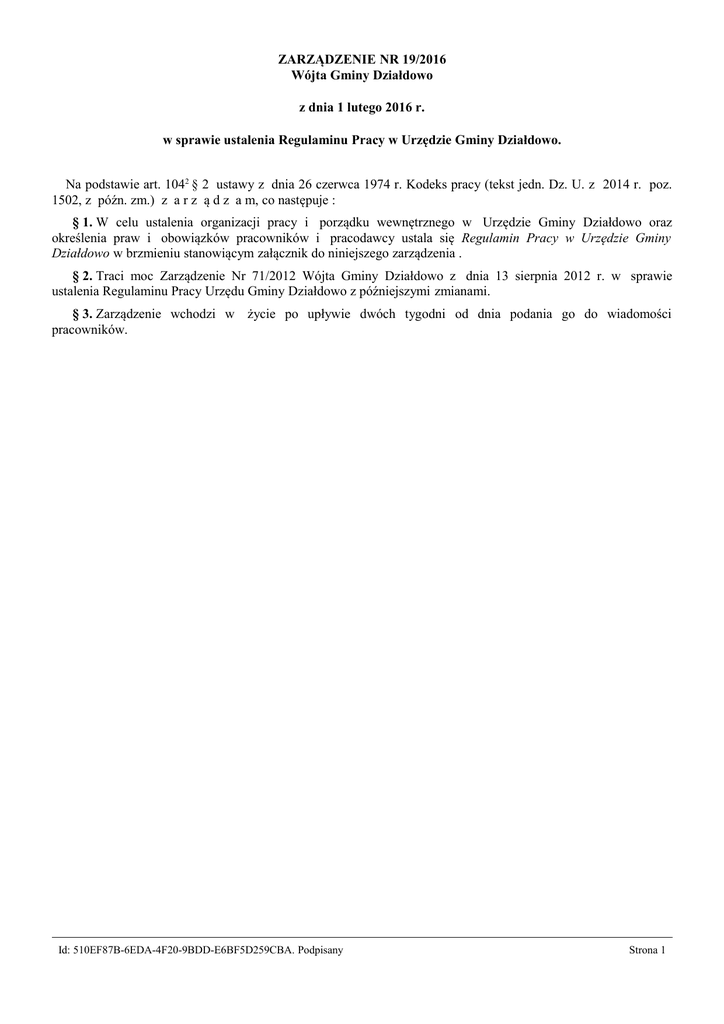ZARZĄDZENIE NR 19/2016 Wójta Gminy Działdowo z dnia 1 lutego 2016 r. w sprawie ustalenia Regulaminu Pracy w Urzędzie Gminy Działdowo. Na podstawie art. 1042 § 2 ustawy z dnia 26 czerwca 1974 r. Kodeks pracy (tekst jedn. Dz. U. z 2014 r. poz. 1502, z późn. zm.) z a r z ą d z a m, co następuje : § 1. W celu ustalenia organizacji pracy i porządku wewnętrznego w Urzędzie Gminy Działdowo oraz określenia praw i obowiązków pracowników i pracodawcy ustala się Regulamin Pracy w Urzędzie Gminy Działdowo w brzmieniu stanowiącym załącznik do niniejszego zarządzenia . § 2. Traci moc Zarządzenie Nr 71/2012 Wójta Gminy Działdowo z dnia 13 sierpnia 2012 r. w sprawie ustalenia Regulaminu Pracy Urzędu Gminy Działdowo z późniejszymi zmianami. § 3. Zarządzenie wchodzi w życie po upływie dwóch tygodni od dnia podania go do wiadomości pracowników. Id: 510EF87B-6EDA-4F20-9BDD-E6BF5D259CBA. Podpisany Strona 1 «»Załącznik do Zarządzenia Nr 19/2016 Wójta Gminy Działdowo z dnia 1 lutego 2016 r. REGULAMIN PRACY W URZĘDZIE GMINY DZIAŁDOWO Rozdział 1. POSTANOWIENIA OGÓLNE § 1. Regulamin Pracy Urzędu Gminy Działdowo zwany dalej „ Regulaminem” , określa organizację i porządek wewnętrzny oraz związane z procesem pracy prawa pracy, obowiązki pracodawcy i pracowników Urzędu Gminy w Działdowie. § 2. Przepisy Regulaminu obowiązują wszystkich pracowników Urzędu bez względu na sposób nawiązania stosunku pracy, wymiar czasu pracy i zajmowane stanowisko. § 3. Każdy pracownik obowiązany jest znać postanowienia Regulaminu i ściśle je przestrzegać. § 4. Pracodawca zapoznaje każdego przyjmowanego do pracy pracownika z treścią Regulaminu przed rozpoczęciem przez niego pracy, a pracownik potwierdza znajomość Regulaminu stosownym oświadczeniem złożonym w formie pisemnej, które zostaje włączone do jego akt osobowych. § 5. Ilekroć w Regulaminie jest mowa o: 1) Pracodawcy – należy przez to rozumieć Urząd Gminy Działdowo reprezentowany przez Wójta Gminy, 2) Pracowniku - należy przez to rozumieć osobę, zatrudnioną w Urzędzie Gminy Działdowo na podstawie umowy o pracę, powołania, wyboru, 3) Przedstawicielu pracowników – osobę wybraną przez pracowników Urzędu, spośród ich grona, w celu reprezentowania ich interesów pracowniczych, 4) Urzędzie – należy przez to rozumieć Urząd Gminy Działdowo, 5) Wójcie, Sekretarzu, Skarbniku – należy przez to rozumieć Wójta Gminy Działdowo, Sekretarza Gminy Działdowo, Skarbnika Gminy Działdowo, 6) Referacie – należy przez to rozumieć komórki organizacyjne Urzędu, 7) Kierowniku – należy przez to rozumieć osobę kierującą referatem, 8) Osobie niepełnosprawnej – należy przez to rozumieć pracownika Urzędu, którego niepełnosprawność została potwierdzona stosownym orzeczeniem, 9) Przepisach prawa pracy – przepisy ustawy o pracownikach samorządowych, przepisy Kodeksu pracy oraz przepisy innych ustaw i aktów wykonawczych, określające prawa i obowiązki pracowników i pracodawcy, a także postanowienia regulaminów określających prawa i obowiązki stron stosunku pracy. Rozdział 2. PODSTAWOWE OBOWIĄZKI PRACODAWCY § 6. 1. Pracodawca jest obowiązany w szczególności: 1) zaznajomić pracowników podejmujących pracę z zakresem ich obowiązków, sposobem wykonywania pracy na wyznaczonych stanowiskach oraz ich podstawowymi uprawnieniami, 2) przydzielać pracownikom pracę zgodną z treścią stosunku pracy, potrzebami Urzędu, biorąc pod uwagę staż pracy zawodowej i kwalifikacje pracownika, 3) organizować pracę w sposób zapewniający pełne wykorzystanie czasu pracy, jak również osiąganie przez pracowników, przy wykorzystaniu ich uzdolnień i kwalifikacji, wysokiej wydajności i należytej jakości pracy, 4) organizować pracę w sposób zapewniający zmniejszenie uciążliwości w pracy, zwłaszcza pracy monotonnej i pracy w ustalonym z góry tempie, Id: 510EF87B-6EDA-4F20-9BDD-E6BF5D259CBA. Podpisany Strona 1 5) przeciwdziałać dyskryminacji w zatrudnieniu, w szczególności ze względu na wiek, płeć, niepełnosprawność, rasę, religię, narodowość, przekonania polityczne, wyznanie, orientację seksualną, a także ze względu na zatrudnienie na czas określony lub nieokreślony, albo w pełnym lub w niepełnym wymiarze czasu pracy, 6) zapewnić bezpieczne i higieniczne warunki pracy oraz prowadzić systematyczne szkolenie pracowników w zakresie bezpieczeństwa i higieny pracy oraz kierować ich na profilaktyczne badania lekarskie, 7) oceniać i dokumentować ryzyko zawodowe związane z wykonywaną pracą oraz stosować niezbędne środki profilaktyczne zmniejszające ryzyko, 8) informować pracowników o ryzyku zawodowym, które wiąże się z wykonywaną pracą oraz o zasadach ochrony przed zagrożeniem, 9) w razie wypadku pracodawca jest zobowiązany podjąć działania eliminujące lub ograniczające zagrożenie, zapewnić udzielenie pierwszej pomocy osobom poszkodowanym i ustalić okoliczności i przyczyny wypadku oraz zastosować odpowiednie środki zapobiegające podobnym wypadkom, 10) stosować środki zapobiegające chorobom zawodowym i innym chorobom związanym z wykonywaną pracą, 11) prowadzić rejestr wypadków przy pracy oraz rejestr obejmujący przypadki stwierdzonych chorób zawodowych i podejrzeń o takie choroby, 12) informować o pracownikach wyznaczonych do udzielania pierwszej pomocy i wykonywania działań w zakresie zwalczania pożarów i ewakuacji pracowników, 13) dostarczać pracownikom nieodpłatnie środki ochrony indywidualnej oraz odzieży i obuwia roboczego, 14) wypłacać prawidłowo i terminowo wynagrodzenie, 15) ułatwiać pracownikom podnoszenie kwalifikacji zawodowych, 16) stwarzać pracownikom podejmującym zatrudnienie przystosowaniu się do należytego wykonywania pracy, po ukończeniu szkoły warunki sprzyjające 17) zaspokajać w miarę posiadanych środków socjalne potrzeby pracowników, 1