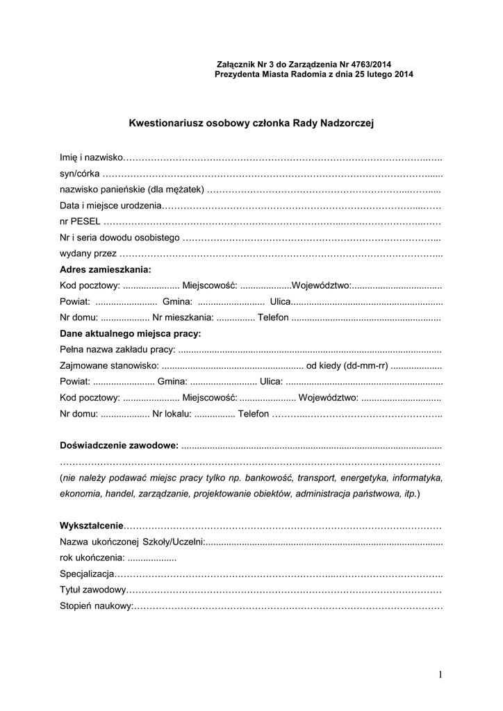 Załącznik Nr 3 do Zarządzenia Nr 4763/2014 Prezydenta Miasta Radomia z dnia 25 lutego 2014 Kwestionariusz osobowy członka Rady Nadzorczej Imię i nazwisko………………………….…………………………………………………………..….. syn/córka ……………………………………………………………………………………………...... nazwisko panieńskie (dla męŜatek) ………………………………………………………...……..... Data i miejsce urodzenia………………………………………………………………………....…… nr PESEL …………………………………………………………………...……………………..…… Nr i seria dowodu osobistego ………………………………………………………………………... wydany przez …………………………………………………………………………………………... Adres zamieszkania: Kod pocztowy: ...................... Miejscowość: ....................Województwo:................................... Powiat: ........................ Gmina: .......................... Ulica........................................................... Nr domu: ................... Nr mieszkania: ............... Telefon .......................................................... Dane aktualnego miejsca pracy: Pełna nazwa zakładu pracy: ...................................................................................................... Zajmowane stanowisko: ....................................................... od kiedy (dd-mm-rr) .................... Powiat: ........................ Gmina: .......................... Ulica: ............................................................. Kod pocztowy: ...................... Miejscowość: ...................... Województwo: ............................... Nr domu: ................... Nr lokalu: ................ Telefon ………...…………………………………….. Doświadczenie zawodowe: ..................................................................................................... …………………………………………………………………………………………………………… (nie naleŜy podawać miejsc pracy tylko np. bankowość, transport, energetyka, informatyka, ekonomia, handel, zarządzanie, projektowanie obiektów, administracja państwowa, itp.) Wykształcenie……………………………………………………………………………….………… Nazwa ukończonej Szkoły/Uczelni:............................................................................................ rok ukończenia: ................... Specjalizacja……………………………………………………………...…………………………….. Tytuł zawodowy………………………………………………………………………………………… Stopień naukowy:…………………………………………….………………………………………… 1 Inne uprawnienia zawodowe: (inne uprawnienia zawodowe potwierdzone zdanym egzaminem, otrzymanym certyfikatem, itp. np. makler giełdowy, biegły rewident, radca prawny, adwokat, rzeczoznawca majątkowy, itd.) Nazwa kursu/studiów Rok ukończenia Tytuł StaŜ pracy ogółem: ...................................... lat Uprawnienia do powołania do Rad Nadzorczych spółek z udziałem jednostek samorządu terytorialnego Data złoŜenia egzaminu na kandydatów na członków Rad Nadzorczych Dyplom wydany przez: Podstawa zwolnienia z egzaminu: Aktualne uczestnictwo w organach władz spółek (Zarząd, Rada Nadzorcza) Nazwa spółki Miejscowość Funkcja Od: (rr-mm-dd) StaŜ w Radach Nadzorczych spółek z udziałem Skarbu Państwa lub jednostek samorządu terytorialnego ogółem ............................ lat 2 Dotychczasowe uczestnictwo w organach władz spółek z udziałem Skarbu Państwa lub jednostek samorządu terytorialnego Lp Nazwa spółki i siedziba Rok Funkcja obrotowy Uzyskanie Wypłacane absolutorium wynagrodzenie (skwitowanie) TAK/NIE TAK/NIE Uwagi: 1. Wypełnić pismem drukowanym 2. KaŜdy wiersz winien zawierać informację o pojedyńczym roku obrotowym, przy powtarzającej się nazwie naleŜy w polu nazwa wpisać jak wyŜej 3. W przypadku większej liczby informacji naleŜy wypełniać dwa lub więcej arkuszy Zgodnie z ustawą z dnia 29 sierpnia 1997 r. o ochronie danych osobowych (j.t. Dz. U. z 2002 r. Nr 101, poz. 926 ze zm.), wyraŜam zgodę na przetwarzanie, obecnie i w przyszłości, moich danych osobowych, zawartych w kwestionariuszu osobowym członka rady nadzorczej, w celu rekrutacji oraz weryfikacji uprawnień niezbędnych do pełnienia funkcji członka Rady Nadzorczej w Spółce z udziałem Gminy Miasta Radomia, a takŜe do bieŜących kontaktów. .......................................... (miejscowość i data) …………………………………… (podpis) 3 .......................................................... (miejscowość, data) ............................................................ (imię i nazwisko) OŚWIADCZENIE Niniejszym oświadczam, Ŝe spełniam warunki ustawowe umoŜliwiające kandydowanie na członka Rady Nadzorczej Spółki …………………………………..…………… z siedzibą w Radomiu przy ul. ................................................................................................... a mianowicie: 1. Posiadam uprawnienie do zasiadania w radach nadzorczych, wynikające z (właściwe zakreślić): a)* art. 10a ustawy z dnia 20 grudnia 1996 r. o gospodarce komunalnej (t.j. Dz.U. z 2011 r. Nr 45, poz. 236) oraz art. 12 ust. 2 ustawy z dnia 30 sierpnia 1996 r. o komercjalizacji i prywatyzacji (j.t. Dz.U. z 2013 r., poz. 216) tj. złoŜenie z wynikiem pozytywnym egzaminu dla kandydatów na członków rad nadzorczych, b)* Rozporządzenia Rady Ministrów z dnia 7 września