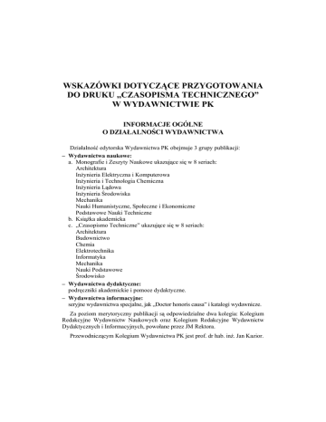 WSKAZÓWKI DOTYCZĄCE PRZYGOTOWANIA DO DRUKU ,,CZASOPISMA TECHNICZNEGO” W WYDAWNICTWIE PK INFORMACJE OGÓLNE O DZIAŁALNOŚCI WYDAWNICTWA Działalność edytorska Wydawnictwa PK obejmuje 3 grupy publikacji: – Wydawnictwa naukowe: a. Monografie i Zeszyty Naukowe ukazujące się w 8 seriach: Architektura Inżynieria Elektryczna i Komputerowa Inżynieria i Technologia Chemiczna Inżynieria Lądowa Inżynieria Środowiska Mechanika Nauki Humanistyczne, Społeczne i Ekonomiczne Podstawowe Nauki Techniczne b. Książka akademicka c. „Czasopismo Techniczne” ukazujące się w 8 seriach: Architektura Budownictwo Chemia Elektrotechnika Informatyka Mechanika Nauki Podstawowe Środowisko – Wydawnictwa dydaktyczne: podręczniki akademickie i pomoce dydaktyczne. – Wydawnictwa informacyjne: seryjne wydawnictwa specjalne, jak „Doctor honoris causa” i katalogi wydawnicze. Za poziom merytoryczny publikacji są odpowiedzialne dwa kolegia: Kolegium Redakcyjne Wydawnictw Naukowych oraz Kolegium Redakcyjne Wydawnictw Dydaktycznych i Informacyjnych, powołane przez JM Rektora. Przewodniczącym Kolegium Wydawnictwa PK jest prof. dr hab. inż. Jan Kazior. 2 Kolegium Redakcyjne Wydawnictw Naukowych prof. dr hab. Józef Nizioł – przewodniczący prof. dr hab. inż. arch. Dariusz Kozłowski dr hab. inż. Marek Piekarczyk, prof. PK prof. dr hab. inż. Krzysztof Pielichowski prof. dr hab. inż. Tadeusz Sobczyk prof. dr hab. inż. Krzysztof Sapiecha prof. dr hab. inż. Michał Dyląg prof. dr hab. inż. Antoni Ostoja-Gajewski prof. dr hab. inż. Stanisław Kandefer dr hab. Eugeniusz Szumakowicz, prof. PK Prace do publikacji prosimy składać w siedzibie Redakcji Wydawnictwa na ręce redaktora prowadzącego daną sekcję. Pozycje nie ujęte w planie wydawniczym należy dostarczać wraz z pisemną zgodą dziekana na sfinansowanie kosztów wydania (recenzje, opracowanie redakcyjne, druk, ewentualne honorarium autorskie). Autorzy przygotowujący prace do druku proszeni są o wcześniejszy kontakt z Działem Poligrafii Wydawnictwa PK w celu omówienia szczegółów wykonania. CZASOPISMO TECHNICZNE Artykuły (wcześniej zgłoszone do planu wydawniczego) należy dostarczyć w jednym egzemplarzu oraz na dyskietce lub CD-R. Objętrość artykułu nie powinna przekraczać 1 ark. aut. Uwaga! 1 arkusz autorski to 40 000 znaków graficznych, czyli ok. 20–22 strony maszynopisu lub 3000 cm2 materiału ilustracyjnego. Na pierwszej stronie artykułu należy umieścić w kolejności: – imię i nazwisko autora (przykład – s. 6) – tytuł artykułu w języku polskim i angielskim (przykład – s. 6) – streszczenie w języku polskim i angielskim (przykład – s. 6) – słowa kluczowe w języku polskim i angielskim (przykład – s. 6) – u dołu strony przypis zawierający tytuł (stopień naukowy), imię, nazwisko autora/autorów, nazwę instytutu, wydziału, uczelni/instytucji (przykład – s. 6) Na końcu artykułu należy umieścić: – wykaz literatury (przykład – s. 10). 3 MATERIAŁ ILUSTRACYJNY W przypadku umieszczenia ilustracji (zwłaszcza kolorowych) w tekście lub na okładce autor jest zobowiązany do dostarczenia oryginałów przezroczy lub zdjęć, dotyczy to w szczególności fotografii i rysunków, które będą skanowane. Jeżeli materiał ilustracyjny będzie dostarczany przez autorów w formie elektronicznej, to powinien mieć on następującą formę: Grafika bitowa (np. skany fotografii, wszelkiego rodzaju obrazy z aparatów cyfrowych czy bibliotek na CD-R itp.) – rozmiar grafiki najmniej 1:1 – rozdzielczość najmniej 300 dpi – format TIFF, EPS, JPEG Rysunki wektorowe (znaczki, logo, wykresy, itp.) robione w programach Corel czy Adobe Illustrator – rozmiar grafiki najmniej 1:1 – format CD-R, AI – tekst (fonty, czcionki) zamieniony na krzywe Mamy możliwość otwarcia i obróbki plików zapisanych w następujących programach: – Adobe Page Maker 6.5 (i wersje niższe) – Adobe Photoshop 7.0 (i wersje niższe) – Corel Draw 9.0 (i wersje niższe) – Adobe Illustrator 9.0 (pliki jednak prosimy zapisywać w wersji 7.0) – MS Word 2002/XP (i wersje niższe). Uwaga! • Prosimy nie dostarczać plików graficznych o rozdzielczości mniejszej niż 300 dpi. Rysunki o mniejszej rozdzielczości nie będą przyjmowane. • Prosimy nie dostarczać plików graficznych (tabele, wykresy itp.) wykonanych w programie Word w kolorze, a w szczególności zawierających kolorowy tekst objaśniający. FORMY ELEKTRONICZNE PRZEKAZANIA PRACY Prosimy o dostarczanie prac na nośnikach CD-R, najlepiej jeśli będą to oddzielnie pliki tekstowe i pliki graficzne. Przy wersji zapisanej w formacie PDF bardzo ułatwi pracę dostarczenie również pliku MS Word. 4 ZALECENIA TECHNICZNE USTAWIENIA STRONY I MAKIETY B5 DO DRUKU (W PROGRAMIE MS WORD) W celu poprawnego ustawienia formatu kolumny (13×19,5 cm) do druku należy, w programie komputerowym MS Word, wykonać kolejno: 1. Otworzyć menu PLIK następnie USTAWIENIA STRONY w zakładce MARGINESY wpisać w odpowiednich okienkach: GÓRNY 5,7 cm DOLNY 5,1 cm LEWY 4 cm PRAWY 4 cm MARGINES NA OPRAWĘ 0 POZYCJA MARGINESU NA OPRAWĘ lewy ORIENTACJA pionowa STRONY standardowo PAPIER A4 CAŁY DOKUMENT 2. Otworzyć menu WSTAW następnie NUMERY STRON i ustawić: POŁOŻENIE góra strony (nagłówek) WYRÓWNANIE zewnętrzne nacisnąć FORMAT ustawić FORMAT NUMERACJI: 1, 2, 3… Numery stron mają wielkość pisma podstawowego (czcionka Times New Roman CE, rozmiar 10). 5 USTAWIENIA STRONY W PROGRAMIE MS WORD 2002/XP 6 IMIĘ I NAZWISKO1 (czcionka 10, odstęp pzred 78, po 36 punktów) TYTUŁ ARTYKUŁU (czcionka 14, kolor czarny odstęp przed 36, po 12 punkty) ANGIELSKI TYTUŁ ARTYKUŁU (czcionka 14, kolor popielaty) Streszczenie W artykule przedstawiono metody wytwarzania oraz zagospodarowania biogazu w kontekście współczesnych wymagań gospodarki odpadami oraz racjonalnej polityki energetycznej. Scharakteryzowano zrealizowane inwestycje dotyczące zastosowa
