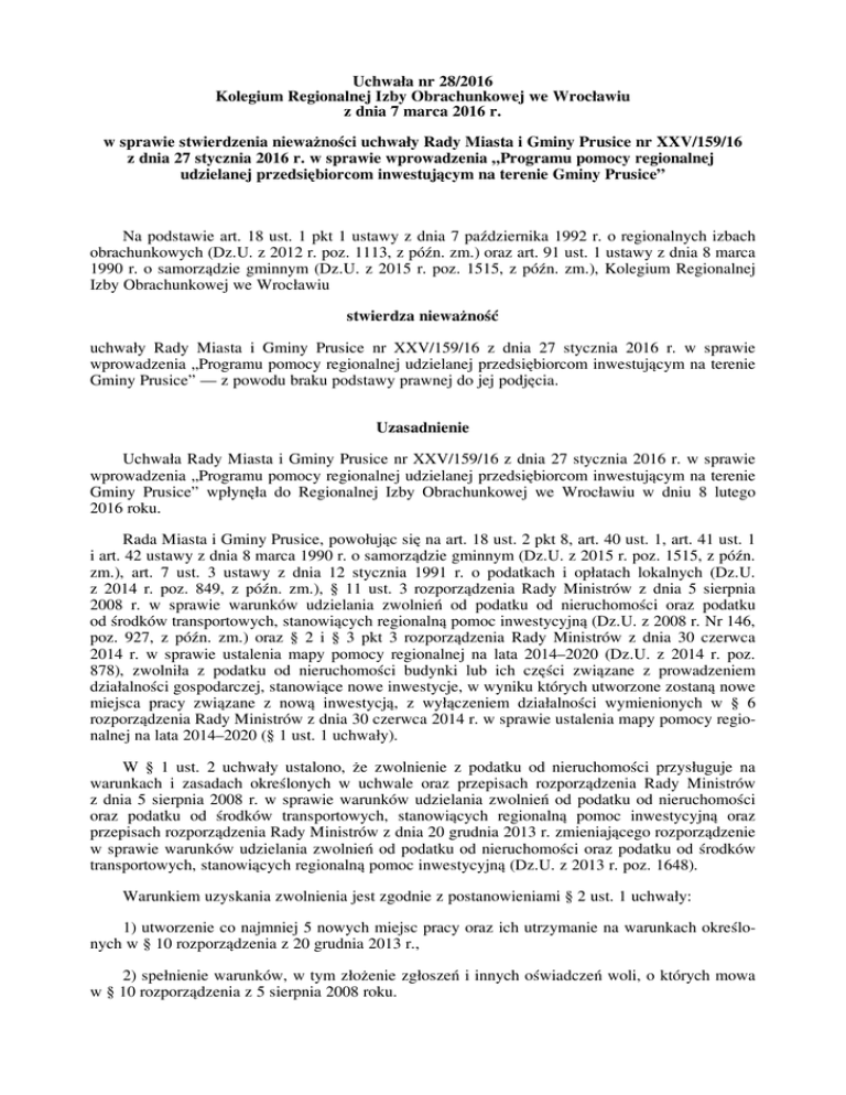 Uchwałanr28/2016 KolegiumRegionalnejIzbyObrachunkowejweWrocławiu zdnia7marca2016r. wsprawiestwierdzenianieważnościuchwałyRadyMiastaiGminyPrusicenrXXV/159/16 zdnia27stycznia2016r.wsprawiewprowadzenia„Programupomocyregionalnej udzielanejprzedsiębiorcominwestującymnaterenieGminyPrusice” Napodstawieart.18ust.1pkt1ustawyzdnia7października1992r.oregionalnychizbach obrachunkowych(Dz.U.z2012r.poz.1113,zpóźn.zm.)orazart.91ust.1ustawyzdnia8marca 1990 r. o samorządzie gminnym (Dz.U. z 2015 r. poz. 1515, z późn. zm.), Kolegium Regionalnej IzbyObrachunkowejweWrocławiu stwierdzanieważność uchwały Rady Miasta i Gminy Prusice nr XXV/159/16 z dnia 27 stycznia 2016 r. w sprawie wprowadzenia„Programupomocyregionalnejudzielanejprzedsiębiorcominwestującymnaterenie GminyPrusice”—zpowodubrakupodstawyprawnejdojejpodjęcia. Uzasadnienie UchwałaRadyMiastaiGminyPrusicenrXXV/159/16zdnia27stycznia2016r.wsprawie wprowadzenia„Programupomocyregionalnejudzielanejprzedsiębiorcominwestującymnaterenie Gminy Prusice” wpłynęła do Regionalnej Izby Obrachunkowej we Wrocławiu w dniu 8 lutego 2016roku. RadaMiastaiGminyPrusice,powołującsięnaart.18ust.2pkt8,art.40ust.1,art.41ust.1 iart.42ustawyzdnia8marca1990r.osamorządziegminnym(Dz.U.z2015r.poz.1515,zpóźn. zm.), art. 7 ust. 3 ustawy z dnia 12 stycznia 1991 r. o podatkach i opłatach lokalnych (Dz.U. z 2014 r. poz. 849, z późn. zm.), § 11 ust. 3 rozporządzenia Rady Ministrów z dnia 5 sierpnia 2008 r. w sprawie warunków udzielania zwolnień od podatku od nieruchomości oraz podatku odśrodkówtransportowych,stanowiącychregionalnąpomocinwestycyjną(Dz.U.z2008r.Nr146, poz. 927, z późn. zm.) oraz § 2 i § 3 pkt 3 rozporządzenia Rady Ministrów z dnia 30 czerwca 2014 r. w sprawie ustalenia mapy pomocy regionalnej na lata 2014–2020 (Dz.U. z 2014 r. poz. 878), zwolniła z podatku od nieruchomości budynki lub ich części związane z prowadzeniem działalnościgospodarczej,stanowiącenoweinwestycje,wwynikuktórychutworzonezostanąnowe miejsca pracy związane z nową inwestycją, z wyłączeniem działalności wymienionych w § 6 rozporządzeniaRadyMinistrówzdnia30czerwca2014r.wsprawieustaleniamapypomocyregionalnejnalata2014–2020(§1ust.1uchwały). W § 1 ust. 2 uchwały ustalono, że zwolnienie z podatku od nieruchomości przysługuje na warunkach i zasadach określonych w uchwale oraz przepisach rozporządzenia Rady Ministrów z dnia 5 sierpnia 2008 r. w sprawie warunków udzielania zwolnień od podatku od nieruchomości oraz podatku od środków transportowych, stanowiących regionalną pomoc inwestycyjną oraz przepisachrozporządzeniaRadyMinistrówzdnia20grudnia2013r.zmieniającegorozporządzenie w sprawie warunków udzielania zwolnień od podatku od nieruchomości oraz podatku od środków transportowych,stanowiącychregionalnąpomocinwestycyjną(Dz.U.z2013r.poz.1648). Warunkiemuzyskaniazwolnieniajestzgodniezpostanowieniami§2ust.1uchwały: 1)utworzenieconajmniej5nowychmiejscpracyorazichutrzymanienawarunkachokreślonychw§10rozporządzeniaz20grudnia2013r., 2)spełnieniewarunków,wtymzłożeniezgłoszeńiinnychoświadczeńwoli,októrychmowa w§10rozporządzeniaz5sierpnia2008roku. 2 W § 2 uchwały ustalono ponadto, że „okres korzystania ze zwolnienia, które stanowi pomoc publiczną, nie może być dłuższy niż do dnia 31 grudnia 2020 r., z zastrzeżeniem ograniczeń, októrychmowaw§11i12rozporządzeniaz5sierpnia2008r.”(ust.2)orazże„udzielonapomoc podlegazsumowaniuzinnymibezwzględunaźródłopochodzeniainiemożeprzekroczyćmaksymalnej intensywności pomocy określonej w § 8 rozporządzenia z 5 sierpnia 2008 r.” (ust. 3). Pozostałe warunki uzyskania pomocy zgodnie z postanowieniami § 2 ust. 4 uchwały „określają przepisyrozporządzeniazdnia5sierpnia2008r.”. Kolegium Regionalnej Izby Obrachunkowej we Wrocławiu badając przedmiotową uchwałę stwierdziło,conastępuje: UchwałaRadyMiastaiGminyPrusicenrXXV/159/16zdnia27stycznia2016r.wsprawie wprowadzenia„Programupomocyregionalnejudzielanejprzedsiębiorcominwestującymnaterenie Gminy Prusice” podjęta została w oparciu o nieobowiązujące już rozporządzenie Rady Ministrów z dnia 5 sierpnia 2008 r. w sprawie warunków udzielania zwolnień od podatku od nieruchomości orazpodatkuodśrodkówtransportowych,stanowiącychregionalnąpomocinwestycyjną(Dz.U.Nr 146,poz.927,zpóźn.zm.). Z postanowień zawartych w § 13 rozporządzenia z dnia 5 sierpnia 2008 r. wynikało, że „Pomoc na warunkach określonych w rozporządzeniu może być udzielana do dnia określonego wart.44ust.3zdaniedrugierozporządzeniaKomisji(WE)nr800/2008zdnia6sierpnia2008r. uznającegoniektórerodzajepomocyzazgodnezewspólnymrynkiemwzastosowaniuart.87i88 Traktatu (ogólnego rozporządzenia w sprawie wyłączeń blokowych)”. W związku z powyższym rozporządzeniewygasłozdniem30czerwca2014roku. Warunki udzielania zwolnień z podatku od nieruchomości stanowiących pomoc publiczną, awprowadzanychwdrodzeuchwałradgminnapodstawieart.7ust.3ustawyopodatkachiopłatachlokalnychobecnieokreślarozporządzenieRadyMinistrówzdnia9stycznia2015r.wsprawie warunków udzielania zwolnień z podatku od nieruchomości oraz podatku od środków transportowych, stanowiących regionalną pomoc inwestycyjną, pomoc na kulturę i zachowanie dziedzictwa kulturowego, pomoc na infrastrukturę sportową i wielofunkcyjną infrastrukturę rekreacyjną oraz pomoc na infrastrukturę lokalną (Dz.U. poz. 174). Postanowienia rozporządzenia i użyta w nim terminologiapowinnyzatemstanowićpodstawękształtowaniatreściww.uchwałradgmin. Biorąc pod uwagę powyższe, Kolegium Regionalnej Izby Obrachunkowej we Wrocławiu orzekłojakwsentencjiuchwały. Na niniejszą uchwałę Radzie Miasta i Gminy Prusice przysługuje skarga, którą wnosi się do Wojewódzkiego Sądu Administracyjnego we Wrocławiu, ul. Świętego Mikołaja 78/79, za pośrednictwemKolegiumRegionalnejIzbyObrachunkowejweWrocławiu,wterminie30dniod