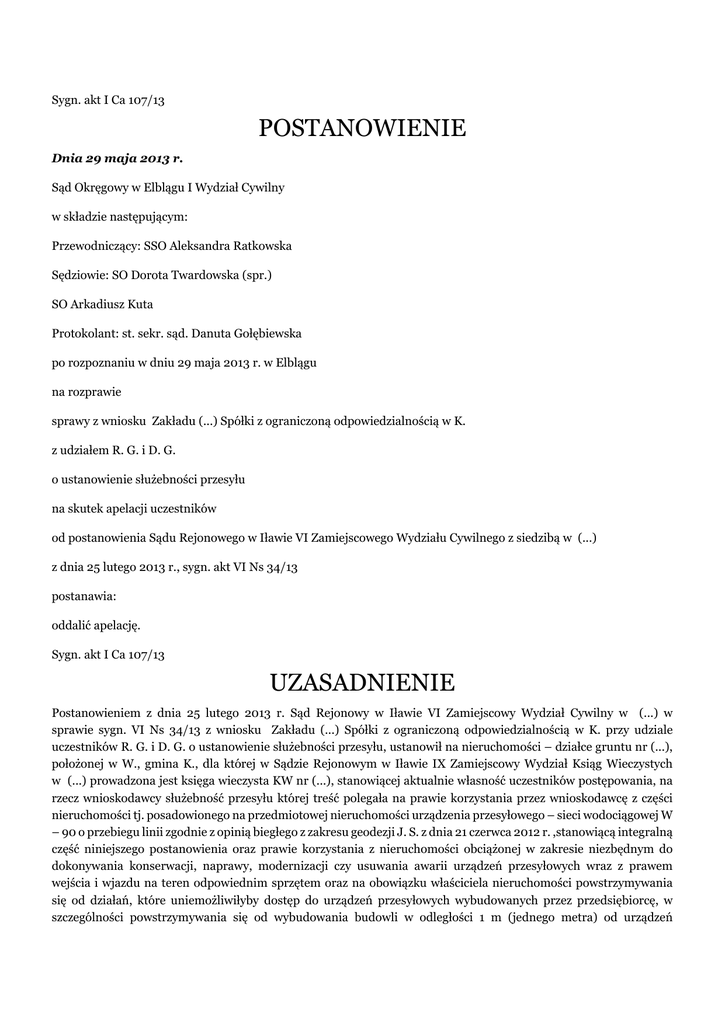 Sygn. akt I Ca 107/13 POSTANOWIENIE Dnia 29 maja 2013 r. Sąd Okręgowy w Elblągu I Wydział Cywilny w składzie następującym: Przewodniczący: SSO Aleksandra Ratkowska Sędziowie: SO Dorota Twardowska (spr.) SO Arkadiusz Kuta Protokolant: st. sekr. sąd. Danuta Gołębiewska po rozpoznaniu w dniu 29 maja 2013 r. w Elblągu na rozprawie sprawy z wniosku Zakładu (...) Spółki z ograniczoną odpowiedzialnością w K. z udziałem R. G. i D. G. o ustanowienie służebności przesyłu na skutek apelacji uczestników od postanowienia Sądu Rejonowego w Iławie VI Zamiejscowego Wydziału Cywilnego z siedzibą w (...) z dnia 25 lutego 2013 r., sygn. akt VI Ns 34/13 postanawia: oddalić apelację. Sygn. akt I Ca 107/13 UZASADNIENIE Postanowieniem z dnia 25 lutego 2013 r. Sąd Rejonowy w Iławie VI Zamiejscowy Wydział Cywilny w (...) w sprawie sygn. VI Ns 34/13 z wniosku Zakładu (...) Spółki z ograniczoną odpowiedzialnością w K. przy udziale uczestników R. G. i D. G. o ustanowienie służebności przesyłu, ustanowił na nieruchomości – działce gruntu nr (...), położonej w W., gmina K., dla której w Sądzie Rejonowym w Iławie IX Zamiejscowy Wydział Ksiąg Wieczystych w (...) prowadzona jest księga wieczysta KW nr (...), stanowiącej aktualnie własność uczestników postępowania, na rzecz wnioskodawcy służebność przesyłu której treść polegała na prawie korzystania przez wnioskodawcę z części nieruchomości tj. posadowionego na przedmiotowej nieruchomości urządzenia przesyłowego – sieci wodociągowej W – 90 o przebiegu linii zgodnie z opinią biegłego z zakresu geodezji J. S. z dnia 21 czerwca 2012 r. ,stanowiącą integralną część niniejszego postanowienia oraz prawie korzystania z nieruchomości obciążonej w zakresie niezbędnym do dokonywania konserwacji, naprawy, modernizacji czy usuwania awarii urządzeń przesyłowych wraz z prawem wejścia i wjazdu na teren odpowiednim sprzętem oraz na obowiązku właściciela nieruchomości powstrzymywania się od działań, które uniemożliwiłyby dostęp do urządzeń przesyłowych wybudowanych przez przedsiębiorcę, w szczególności powstrzymywania się od wybudowania budowli w odległości 1 m (jednego metra) od urządzeń przesyłowych (punkt 1 lit a i b ). Zasądzono od wnioskodawcy na rzecz uczestników solidarnie kwotę 435 zł tytułem jednorazowego wynagrodzenia za ustanowienie służebności opisanej w punkcie 1 postanowienia (punkt 2) oraz nakazano pobrać na rzecz Skarbu Państwa Sądu Rejonowego w Iławie od uczestników postępowania solidarnie kwotę 472,25 zł zaś od wnioskodawcy kwotę 317,59 zł tytułem zwrotu nieuiszczonych kosztów sądowych (punkt 3). W uzasadnieniu powyższego rozstrzygnięcia wskazane zostało, iż wnioskodawca domagał się ustanowienia służebności przesyłu obciążającej nieruchomość stanowiącą własność uczestników postępowania, KW nr (...), za jednorazowym wynagrodzeniem w kwocie 435 zł. Wnioskodawca nie akceptował propozycji uczestników zgłoszonych przed wszczęciem przedmiotowego postępowania, co do wysokości wynagrodzenia za bezumowne korzystanie z nieruchomości (5.676,21 zł ) oraz wynagrodzenia za korzystanie z nieruchomości w wysokości 20.300 zł. Uczestnicy w odpowiedzi na wniosek oświadczyli, iż wyrażają zgodę na ustanowienie służebności przesyłu za wynagrodzeniem 20.300 zł. Ustalone zostało, iż w 2000 roku na działce gruntu nr (...) położonej w W. dla której Sąd Rejonowy w Iławie IX Wydział Zamiejscowy Ksiąg Wieczystych w (...) prowadzi księgę wieczystą nr (...) stanowiącej wówczas własność małżonków M. J. i B. J. wybudowano sieć wodociągową W90. Na budowę wodociągu gmina K. otrzymała pozwolenie na budowę wydaną przez Starostwo Powiatowe w (...). Poprzedni właściciele wyrazili zgodę na wejście na grunt z budową sieci wodociągowej, następnie w 2007 roku gospodarstwo rolne o którym mowa zostało przekazane w drodze umowy darowizny uczestnikom postępowania. W oświadczeniu istniał zapis, iż właściciele gruntu, którzy odniosą korzyści z przyłączenia się do sieci wodociągowej, rezygnują dobrowolnie z odszkodowania za wyrządzone szkody, a którzy nie odnoszą korzyści mogą ubiegać się o odszkodowanie z urzędu gminy za wyrządzone szkody związane z budową sieci wodociągowej. Przedmiotowy wodociąg przebiega skrajem konturów zabudowanego jak i rolnego, na kilku odcinkach blisko granicy działki albo poza nią, a zatem obszar ograniczonego użytkowania właścicieli jest niewielki. Usytuowanie wodociągu przy granicy na głębokości półtora metra nie przeszkadza w uprawie działki i nie stwarza utrudnień w korzystaniu z niej. Ograniczeniem jest jednak to iż, w określonej strefie ochronnej nie można projektować zabudowy kubaturowej z przyczyn prawa budowlanego. Uczestnicy postępowania użytkują w rzeczywistości większy obszar niż ten, który wynika z mapy ewidencyjnej. Przy przyjęciu rzeczywistych granic działki wynikających z mapy ewidencyjnej należna kwota z tytułu ustanowienia służebności przesyłu winna być nie mniejsza niż 361 zł . Sąd pierwszej instancji podkreślił, iż strony nie pozostawały w sporze co do konieczności ustalenia wynagrodzenia za służebność przesyłu, ostatecznie nie kwestionowały też przebiegu linii wodociągowej, pozostawały jednak w sporze co do wysokości należnego wynagrodzenia za ustanowienie służebności. Celem merytorycznej oceny zasadności stanowisk stron Sąd pierwszej instancji dopuścił dowód z opinii biegłego geodety na okoliczność szczegółowego oznaczenia aktualnego przebiegu linii wodociągowej W 90 stanowiącej własność wnioskodawcy usytuowanych na stanowiących własność uczestników postępowania nieruchomości Kw nr (...), określenia zakresu korzystania przez przedsiębiorstwo wnioskodawcy z opisanej nieruchomości w związku z eksploatacją przedmiotowych linii oraz wysoko