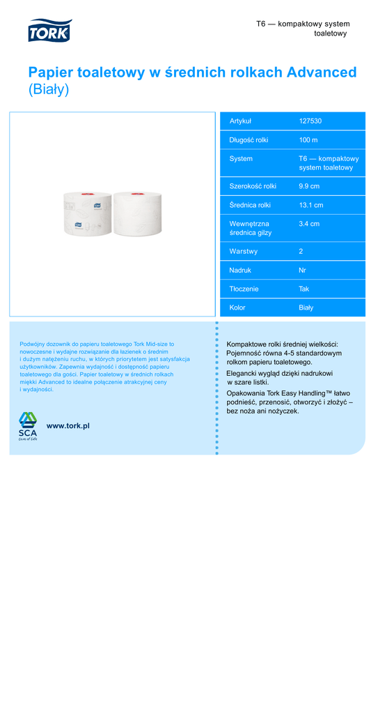 T6 — kompaktowy system toaletowy Papier toaletowy w średnich rolkach Advanced (Biały) Podwójny dozownik do papieru toaletowego Tork Mid-size to nowoczesne i wydajne rozwiązanie dla łazienek o średnim i dużym natężeniu ruchu, w których priorytetem jest satysfakcja użytkowników. Zapewnia wydajność i dostępność papieru toaletowego dla gości. Papier toaletowy w średnich rolkach miękki Advanced to idealne połączenie atrakcyjnej ceny i wydajności. www.tork.pl Artykuł 127530 Długość rolki 100 m System T6 — kompaktowy system toaletowy Szerokość rolki 9.9 cm Średnica rolki 13.1 cm Wewnętrzna średnica gilzy 3.4 cm Warstwy 2 Nadruk Nr Tłoczenie Tak Kolor Biały Kompaktowe rolki średniej wielkości: Pojemność równa 4-5 standardowym rolkom papieru toaletowego. Elegancki wygląd dzięki nadrukowi w szare listki. Opakowania Tork Easy Handling™ łatwo podnieść, przenosić, otworzyć i złożyć – bez noża ani nożyczek. T6 — kompaktowy system toaletowy Informacje o opakowaniu Opakowanie pojedyncze Opakowanie transportowe Paleta EAN 7322540475876 7322540475883 7322540575859 Sztuki 1 27 810 Opakowania pojedyncze - 27 810 Wysokość 99 mm 314 mm 1720 mm Szerokość 132 mm 403 mm 806 mm Długość 132 mm 403 mm 1209 mm Objętość 1.7 dm3 51 dm3 1.5 m3 Waga netto 307 g 8.3 kg 248.59 kg Waga brutto 327 g 9.2 kg 276.66 kg Rodzaj opakowania - Carton - Wybierz dozownik 557500 557508 Alternatywne produkty Dane środowiskowe Zawartość Produkt jest wykonany z Pierwotnej masy celulozowej Opakowanie jest wykonane z papieru lub tworzywa sztucznego. Materiał Włókna pierwotne Pierwotne włókna celulozowe wytwarza się z drewna miękkiego lub twardego. Drewno poddawane jest procesom chemicznym i/lub mechanicznym, w ramach których oddziela się włókna celulozowe oraz usuwa ligninę i resztę pozostałości. Bielenie to proces czyszczenia włókien, którego celem jest uzyskanie jasnej masy włóknistej, a także określonego stopnia czystości włókien, który jest konieczny do spełnienia wymogów obowiązujących dla produktów higienicznych oraz niekiedy do sprostania wytycznym dotyczącym bezpiecznego kontaktu z żywnością. Obecnie wykorzystuje się różne metody bielenia: ECF (bez udziału chloru cząsteczkowego), w ramach której wykorzystuje się dwutlenek chloru) oraz TCF (całkowicie wolne od związków chloru), w ramach której wykorzystuje się ozon, tlen i nadtlenek wodoru. Środki chemiczne Wszystkie środki chemiczne (pomocnicze środki technologiczne oraz dodatki) ocenia się z punktu widzenia bezpieczeństwa i higieny pracy oraz ochrony środowiska, a także bezpieczeństwa produktów. Następujące dodatki pozwalają nam kontrolować wydajność produktów: Środki zwiększające wytrzymałość w stanie mokrym (w przypadku czyściw i ręczników do rąk) Środki zwiększające wytrzymałość w stanie suchym (stosowane przy mechanicznej obróbce masy włóknistej do wytwarzania mocnych produktów, takich jak czyściwa) W przypadku papierów kolorowych dodaje się barwniki i utrwalacze (w celu zachowania idealnej trwałości koloru) W przypadku produktów z nadrukami stosuje się farby drukarskie (pigmenty z nośnikami i utrwalaczami) W przypadku produktów wielowarstwowych korzystamy często z kleju wodorozpuszczalnego, który pozwala zachować integralność produktu Większość naszych zakładów nie stosuje jako dodatków rozjaśniaczy optycznych, które można jednak często znaleźć w papierze odzyskanym, ponieważ są one stosowane w papierze drukowym. W przypadku produktów AfH nie korzystamy ze zmiękczaczy. Wysoką jakość produktów zapewnia się dzięki systemom zarządzania jakością i higieną, które są wdrożone w procesy produkcyjne, magazynowe i transportowe. 127540 127510 Certyfikaty produktu 127520