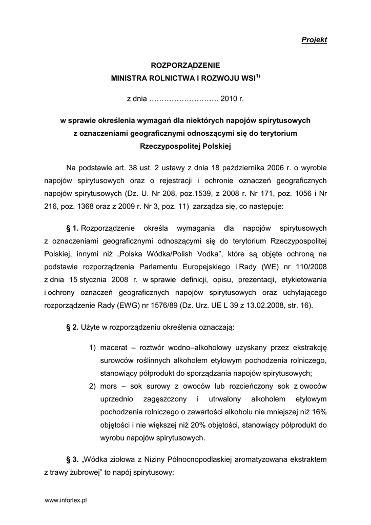 Projekt ROZPORZĄDZENIE MINISTRA ROLNICTWA I ROZWOJU WSI1) z dnia ………………………. 2010 r. w sprawie określenia wymagań dla niektórych napojów spirytusowych z oznaczeniami geograficznymi odnoszącymi się do terytorium Rzeczypospolitej Polskiej Na podstawie art. 38 ust. 2 ustawy z dnia 18 października 2006 r. o wyrobie napojów spirytusowych oraz o rejestracji i ochronie oznaczeń geograficznych napojów spirytusowych (Dz. U. Nr 208, poz.1539, z 2008 r. Nr 171, poz. 1056 i Nr 216, poz. 1368 oraz z 2009 r. Nr 3, poz. 11) zarządza się, co następuje: § 1. Rozporządzenie określa wymagania dla napojów spirytusowych z oznaczeniami geograficznymi odnoszącymi się do terytorium Rzeczypospolitej Polskiej, innymi niŜ „Polska Wódka/Polish Vodka”, które są objęte ochroną na podstawie rozporządzenia Parlamentu Europejskiego i Rady (WE) nr 110/2008 z dnia 15 stycznia 2008 r. w sprawie definicji, opisu, prezentacji, etykietowania i ochrony oznaczeń geograficznych napojów spirytusowych oraz uchylającego rozporządzenie Rady (EWG) nr 1576/89 (Dz. Urz. UE L 39 z 13.02.2008, str. 16). § 2. UŜyte w rozporządzeniu określenia oznaczają: 1) macerat – roztwór wodno–alkoholowy uzyskany przez ekstrakcję surowców roślinnych alkoholem etylowym pochodzenia rolniczego, stanowiący półprodukt do sporządzania napojów spirytusowych; 2) mors – sok surowy z owoców lub rozcieńczony sok z owoców uprzednio zagęszczony i utrwalony alkoholem etylowym pochodzenia rolniczego o zawartości alkoholu nie mniejszej niŜ 16% objętości i nie większej niŜ 20% objętości, stanowiący półprodukt do wyrobu napojów spirytusowych. § 3. „Wódka ziołowa z Niziny Północnopodlaskiej aromatyzowana ekstraktem z trawy Ŝubrowej” to napój spirytusowy: www.inforlex.pl 1) produkowany z polskich surowców, na terytorium Rzeczypospolitej Polskiej wyłącznie w regionie Niziny Północnopodlaskiej; 2) uzyskany przez aromatyzowanie alkoholu etylowego pochodzenia rolniczego o zawartości alkoholu nie mniejszej niŜ 96,5% objętości maceratem trawy Ŝubrowej (Hierochloe odorata i Hierochloe australis) rosnącej na terenie Niziny Północnopodlaskiej; 3) o zawartości alkoholu etylowego nie mniejszej niŜ 37,5% objętości; 4) o zawartości kumaryny nie mniejszej niŜ 7 mg/l; 5) o zawartości cukru nie większej niŜ 4,5 grama na litr w przeliczeniu na cukier inwertowany. § 4. „Polish Cherry” to likier: 1) wyprodukowany na terytorium Rzeczypospolitej Polskiej z morsu oraz maceratu wiśni uprawianych na terytorium Rzeczypospolitej Polskiej z ewentualnym niewielkim dodatkiem morsów lub maceratów z innych owoców jagodowych uprawianych na terytorium Rzeczypospolitej Polskiej oraz naturalnego olejku migdałowego; 2) o zawartości alkoholu etylowego nie mniejszej niŜ 24% objętości; 3) o zawartości ekstraktu nie mniejszej niŜ 180 gramów w litrze napoju; 4) o charakterystycznych cechach organoleptycznych, w szczególności barwie i smaku, pochodzących od owoców wiśni sokowych uprawianych na terytorium Rzeczypospolitej Polskiej. § 5. Wódka aromatyzowana ekstraktem z trawy Ŝubrowej wyprodukowana przed dniem wejścia w Ŝycie niniejszego rozporządzenia, zgodnie ze sposobem produkcji, warunkami technologicznymi i parametrami jakościowymi określonymi w przepisach dotychczasowych, moŜe być wprowadzana do obrotu lub znajdować się w obrocie z oznaczeniem geograficznym „Wódka ziołowa z Niziny Północnopodlaskiej aromatyzowana ekstraktem z trawy Ŝubrowej” nie dłuŜej niŜ przez 12 miesięcy od dnia wejścia w Ŝycie niniejszego rozporządzenia. www.inforlex.pl 2 § 6. Rozporządzenie wchodzi w Ŝycie po upływie 14 dni od dnia ogłoszenia.2) Minister Rolnictwa i Rozwoju Wsi 1) Minister Rolnictwa i Rozwoju Wsi kieruje działem administracji rządowej – rynki rolne, na podstawie § 1 ust. 2 pkt 3 rozporządzenia Prezesa Rady Ministrów z dnia 16 listopada 2007 r. w sprawie szczegółowego zakresu działania Ministra Rolnictwa i Rozwoju Wsi (Dz. U. Nr 216, poz. 1599). 2) Niniejsze rozporządzenie było poprzedzone rozporządzeniem Ministra Rolnictwa i Rozwoju Wsi z dnia 25 stycznia 2007 r. w sprawie określenia wymagań dla niektórych napojów spirytusowych z oznaczeniami geograficznymi odnoszącymi się do terytorium Rzeczypospolitej Polskiej (Dz. U. Nr 21, poz. 129), które utraciło moc z dniem wejścia w Ŝycie ustawy z dnia 24 października 2008 r. o zmianie ustawy o rejestracji i ochronie nazw i oznaczeń produktów rolnych i środków spoŜywczych oraz o produktach tradycyjnych oraz o zmianie niektórych innych ustaw (Dz. U. Nr 216, poz. 1368). www.inforlex.pl 3 UZASADNIENIE Rozporządzenie stanowi wykonanie upowaŜnienia zawartego w art. 38 ust. 2 ustawy z dnia 18 października 2006 r. o wyrobie napojów spirytusowych oraz o rejestracji i ochronie oznaczeń geograficznych napojów spirytusowych (Dz. U. Nr 208, poz. 1539, z późn. zm.). Stosownie do tego przepisu minister właściwy do spraw rynków rolnych określi, w drodze rozporządzenia, wymagania dla napojów spirytusowych z oznaczeniami geograficznymi odnoszącymi się do terytorium Rzeczypospolitej Polskiej, innymi niŜ „Polska Wódka/Polish Vodka”, które zostały objęte ochroną na podstawie rozporządzenia (WE) nr 110/2008, mając na względzie zapewnienie odpowiedniego sposobu produkcji, odpowiednich parametrów jakościowych oraz warunków technologicznych dla poszczególnych napojów spirytusowych, a takŜe obszar na którym mogą być wyrabiane te napoje. W pkt. 15 i pkt. 32 załącznika nr III do rozporządzenia Parlamentu Europejskiego i Rady (WE) nr 110/2008 z dnia 15 stycznia 2008 r. w sprawie definicji, opisu, prezentacji, etykietowania i ochrony oznaczeń geograficznych napojów spirytusowych oraz uchylającego rozporządzenie Rady (EWG) nr 1576/89 (Dz. Urz. UE L 39 z 13.02.2008, str. 16) wpisane są odpowiednio następujące oznaczenia „Wódka ziołowa z Niziny Północnopod