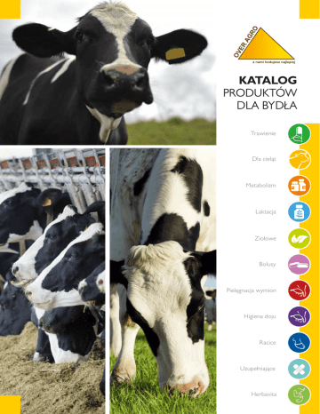 KATALOG PRODUKTÓW DLA BYDŁA Trawienie Dla cieląt Metabolizm Laktacja Ziołowe Bolusy Pielęgnacja wymion Higiena doju Racice Uzupełniające Herbavita Trawienie Produkt Premium Produkt Premium Pectolit plus Electropec Pectospeed Preparat przeciw biegunkom dla cieląt i jagniąt • szybko reguluje pracę przewodu pokarmowego • dostarcza niezbędnych składników pokarmowych • osłania przewód pokarmowy i stymuluje funkcje trawienne Preparat stabilizujący gospodarkę wodno-elektrolitową • wspomaga zatrzymanie biegunki • dostarcza energię oraz elektrolity • rewelacyjny przy wysokich temperaturach Preparat przeciw ostrym biegunkom dla cieląt i prosiąt • zapobiega odwodnieniu • korzystnie wpływa na pracę jelit • dostarcza szybko przyswajalnej energii Skład: dekstroza, mączka z suszonych strąków szarańczynu strąkowego, koncentrat białka sojowego, serwatka w proszku, tłuszcz kokosowy, chlorek sodu, wodorowęglan sodu, chlorek potasu, dodatki min.-wit. Stosowanie: 100g rozpuścić w 2 litrach ciepłej wody (38°C) Skład: dekstroza (glukoza), chleb świętojański suszony, chlorek sodu, dwuwęglan sodu, chlorek potasu, siarczan magnezu, witamina E, glicyna Stosowanie: 25g na 1 litr ciepłej wody Skład: dekstroza, nasiona babki, laktoza, wodorowęglan sodu, chlorek sodu, siarczan magnezu, witaminy Stosowanie: 100g rozpuścić w 2 litrach ciepłej wody (38°C) Dla cieląt Produkt Premium Stop plus IMMUNO Pover Protect mix FASTERIN Milk pro start Ziołowy preparat przeciw biegunkom dla krów i jałowizny - ogranicza występowanie biegunek u jałówek i krów - przyspiesza powrót do pełnej wydajności mlecznej - działa ściągająco na błony przewodu pokarmowego Specjalna mieszanka wzmacniająca dla cieląt - przywraca witalność cieląt po ciężkich porodach - wspomaga kształtowanie odporności - gwarantuje wysokie przyrosty Pełnoporcjowy preparat mlekozastępczy dla cieląt w formie granulatu - przyspiesza pobieranie pasz stałych - wspomaga szybki rozwój żwacza - ułatwia karmienie i oszczędza czas obsługi cieląt Skład: kora dębu, tatarak zwyczajny, pięciornik kurze ziele Stosowanie: 100g rozpuścić 1 litrze ciepłej wody Skład: koncentrat serwatki, olej palmowo-kokosowy, serwatka w proszku, częściowo odlaktozowana serwatka w proszku, gluten pszenny, mleko w proszku, probiotyki, immunoglobuliny, dodatki min.-wit. Stosowanie: : 1kg rozpuścić 9 litrach ciepłej wody Skład: serwatka w proszku, nasiona soi, płatki owsiane, olej kokosowy, białko ziemniaczane, drożdże piwne, probiotyk, dodatki min.-wit. Stosowanie: 100-500g dziennie Metabolizm Produkt Premium VIPover drink Calbal plus Calcium plus Energetyzujące pójło poporodowe • wspomaga regenerację organizmu po porodzie • zapewnia wypełnienie żwacza • ogranicza problemy okresu okołoporodowego Kompleksowy preparat wapniowo-witaminowy zapobiegający porażeniu poporodowemu • dostarcza szybko przyswajalnego wapnia • aktywizuje przemiany energetyczne • wysoka koncentracja składników w małej dawce Wapniowo-magnezowy preparat zapobiegający porażeniu poporodowemu • zapobiega odwapnieniu • dostarcza łatwo przyswajalnych składników • szczególnie zalecany w okresie okołoporodowym Skład: gliceryna, chlorek wapnia, pantotenian wapnia, glikol propylenowy, chlorek magnezu, fosforan dwuamonowy, laktoza, dodatki min.-wit. Stosowanie: 200ml podać krowie bezpośrednio do pyska po wycieleniu Skład: chlorek wapnia, gliceryna, chlorek magnezu, glikol propylenowy, laktoza, dodatki min.-wit. Stosowanie: 500ml podać krowie bezpośrednio do pyska po wycieleniu Skład: dekstroza, serwatka, skrobia pszenna, laktoza, chlorek sodu, dwuwęglan sodu, fosforan sodu, węglan wapnia, chlorek potasu, tlenek magnezu, żywe komórki drożdży, dodatki min.-wit. Stosowanie: 1kg rozpuścić w 20litrach ciepłej wody Produkt Premium Lacto plus vit -Stim Słodki preparat przeciwko ketozie • jest źródłem łatwo przyswajalnej energii • przywraca prawidłową zawartość glukozy we krwi • działa osłonowo na wątrobę Preparat stabilizujący pH dla krów z kwasicą żwacza • normalizuje pH treści żwacza i wzmaga apetyt • stymuluje rozwój pożądanych bakterii żwaczowych • stabilizuje fermentację , likwiduje niestrawności Skład: gliceryna, glikol propylenowy, laktoza, propionian sodu, dodatki min.-wit., aromat Stosowanie: 300-500g bezpośrednio do pyska Skład: dwuwęglan potasu, dwuwęglan sodu, wit. C, sepiolit, kwas jabłkowy Stosowanie: 100g rozpuszczone w wodzie bezpośrednio do pyska www.over-agro.pl Ovulik plus Uzupełniająca mieszanka paszowa stymulująca płodność • • ogranicza zamieralność zarodków • zwiększa skuteczność inseminacji Skład: gliceryna, glikol propylenowy, laktoza, dodatki min.-wit. Stosowanie: 500-1000g bezpośrednio do pyska Laktacja Energia plus Vit Energia forte Energia plus Witaminizowany preparat energetyczny w płynie • dostarcza energię i zmniejsza ryzyko ketozy • poprawia smakowitość paszy • zwiększa wydajność mleka Płynny preparat energetyczny z witaminą E, selenem i niacyną • ogranicza ujemny bilans energii po porodzie • obniża ilość ciał ketonowych we krwi • stabilizuje środowisko żwacza Płynny preparat energetyczny • zwiększa pobranie pasz • zapobiega nadmiernemu spadkowi masy ciała • poprawia wydajność mleka Skład: gliceryna, glikol propylenowy, laktoza, dodatki min.-wit., aromat Stosowanie: 250-300g/szt dziennie do wozu lub na paszę Skład: gliceryna, glikol propylenowy, dodatki min.-wit., aromat Stosowanie: 250-300g/szt dziennie do wozu lub na paszę Skład: gliceryna Stosowanie: 250-300g/szt dziennie do wozu lub na paszę Herbavita Toxisorb Herbatan dry Optistart Dodatek wiążący mykotoksyny z paszy - wychwytuje ,wiąże i usuwa mykotoksyny z organizmu - redukuje występowanie zaburzeń trawienia - nie obniża dostępności witamin i mikroelementów Wzmacniający preparat 