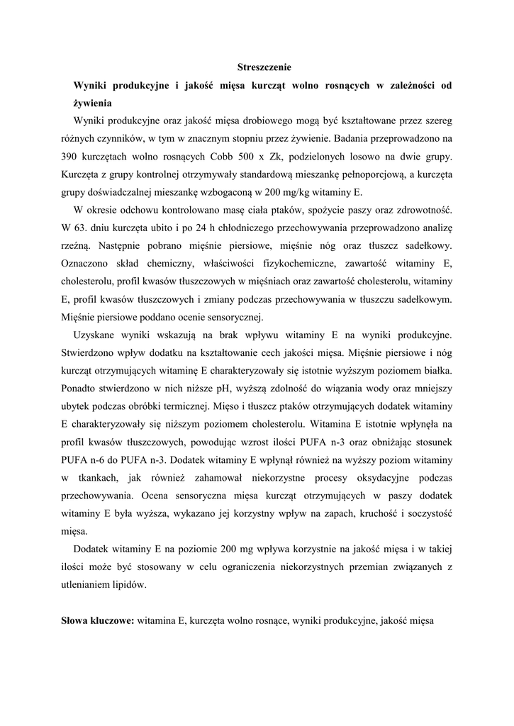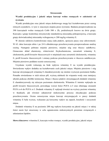 Streszczenie Wyniki produkcyjne i jakość mięsa kurcząt wolno