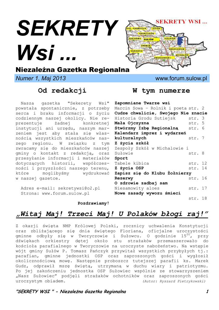 SEKRETY Wsi ... Niezależna Gazetka Regionalna Numer 1, Maj 2013 www.forum.sulow.pl Od redakcji W tym numerze Nasza gazetka "Sekerety Wsi" powstała spontanicznie, z potrzeby serca i braku informacji o życiu codziennym naszej okolicy. Nie reprezentuje żadnej konkretnej instytucji ani urzędu, naszym marzeniem jest aby stała się własnością wszystkich mieszkańców naszego regionu. W związku z tym zwracamy się do mieszkańców naszej gminy o kontakt z redakcją, oraz przesyłanie informacji i materiałów dotyczących historii, współczesności i przyszłości naszego terenu, które moglibyśmy wydrukować w naszej gazetce. Zapomniane Twarze wsi Marcin Sowa – Rolnik i poeta str. 2 Cudze chwalicie, Swojego Nie znacie Historia Grodu Sutiejsk str. 3 Mała Ojczyzna str. 5 Stwórzmy Izbę Regionalną str. 6 Kalendarz imprez i wydarzeń kulturalnych str. 7 Z życia szkół Zespoły Szkół w Michalowie i Sułowie str. 8 Sport Tabele kibica str. 12 Z życia OSP str. 14 Zapisz się do Klubu Żołnierzy Rezerwy str. 16 O zdrowie zadbaj sam Niesamowity aloes str. 17 Nowe zasady wywozu śmieci str. 18 Adres e-mail: [email protected] Strona: www.forum.sulow.pl Pozdrawiamy! „Witaj Maj! Trzeci Maj! U Polaków błogi raj!” Z okazji święta NMP Królowej Polski, rocznicy uchwalenia Konstytucji oraz zbliżającego się dnia świętego Floriana, oficjalne uroczystości gminne odbyły się w Tworyczowie i Sułowcu. O godzinie 1500, przy dźwiękach orkiestry dętej około stu strażaków przemaszerowało do kościoła parafialnego w Tworyczowie na uroczyste nabożeństwo. Na wstępie wójt gminy Sułów P. Tomasz Pańczyk przywitał wszystkich przybyłych tj.: parafian, gminne jednostki OSP oraz zaproszonych gości i wygłosił okolicznościową mowę. Następnie proboszcz tutejszej parafii ks. Marek Gudz, odprawił mszę świętą, utrzymaną w duchu wiary i patriotyzmu. Po jej zakończeniu jednostka OSP Sułowiec wspólnie ze stowarzyszeniem „Nasz Sułowiec” podjęli strażaków ochotników oraz zaproszonych gości uroczystym obiadem. (Autor: Ryszard Pietrykowski) "SEKRETY WSI " - Niezależna Gazetka Regionalna 1 Zapomniane twarze wsi Marcin Sowa – rolnik i poeta Marcin Sowa z Sułowca znany jest nam z licznych wierszyków satyrycznych, które układał przy różnych okazjach. Jak każdy pisarz ludowy, nie miał łatwego dzieciństwa. Na początku XX wieku nie łatwo było otrzymać edukację. Trzeba było wiedzę zdobywać samemu. Tak też zrobił Sowa, który od najmłodszych lat obok rolnictwa interesował się książkami. Te dwa zamiłowania towarzyszyły mu aż do śmierci. Marcin Sowa z Sułowca W 1928 roku dostał się do Ludowej Szkoły Rolniczej w Janowicach pod Zamościem. Tam także zetknął się z książkami wybitnych pisarzy. Uwielbiał poezję romantyczną, głównie Adama Mickiewicza. W tym samym czasie zaczął sam próbować twórczości poetyckiej. Pierwsze próby spotkały się z życzliwym przyjęciem, dlatego Marcin Sowa często oprócz pługa brał w rękę pióro i kreślił słowa wierszy – proste jak dola rolnika. W 1932 roku wydał wierszowany utwór „Wspomnienie pośmiertne o Janku Wyłupku z Sąsiadki”. Po powrocie do rodzinnego Sułowca, zorganizował tam straż pożarną, Kółko Rolnicze, Koło „Wici” i Koło Stronnictwa Ludowego. Brał czynny udział w strajkach chłopskich. Podczas okupacji był członkiem Batalionów Chłopskich. Po zakończeniu wojny brał czynny udział w odbudowie kraju. Jak opowiadał w 1959r. do pisania popchnęło go wydarzenie z dzieciństwa. W 1921, czternastoletni wówczas Marcin Sowa pasł krowy. Siedział na skarpie i słuchał śpiewu skowronków oraz własnych słów układających się w rymy. Wiosenko miła jużeś przybyła Na polskie łany i błonia. Hej tam u góry, żurawi sznury Lecą nad łąką, nad borem. Z przybycia wiosny, okrzyk radosny Czynią doniosłym klangorem… Wtem od strony Sąsiadki nadszedł nieznajomy. Sowa zauważył go, dopiero gdy ten usiadł nieopodal i zaszeleścił gazetą. Gazeta przyciągała jak magnes, gazeta to był daleki świat, coś więcej niż niedzielne kazania proboszcza. Przyszły poeta zaczął zbliżać się z tyłu do nieznajomego, gdy ten odwrócił głowę i powiedział: - Umiesz czytać? Czytaj więc co tu piszą. Sowa bez wahania czytał odezwę Centralnego Komitetu KPP do robotników i chłopów. Czytał powoli głośno, dla nieznajomego. - Dobrze czytasz. – powiedział tajemniczy jegomość. – Zabierz sobie tę gazetę i podaj mi swój adres. Od czasu do czasu przyślę Ci pocztą następne numery. Nieznajomy odszedł, ale dotrzymał słowa. Blisko przez rok czasu Marcin sowa dostawał kolejne numery gazety. Była to pierwsza gazeta jaką Sowa kiedykolwiek miał w ręku. Wtedy zaczął inaczej spoglądać na otaczający go świat. Marcin Sowa w 1968 roku założył Powiatowy Klub Twórców Ludowych w Zamościu. Był odznaczony Złotym Krzyżem Zasługi. Zmarł w 1974 roku. "SEKRETY WSI " - Niezależna Gazetka Regionalna (Autor: Szymon Wiśniewski) 2 Cudze chwalicie, swojego nie znacie Historia Grodu Sutiejsk SĄSIADKA to mała wieś leżąca w okolicach Szczebrzeszyna i Radecznicy. Położona jest na zachodnim skraju gminy Sułów, nad rzeką Gorajec, na pograniczu Roztocza. Z pozoru zwykła miejscoość posiada całkiem interesującą historią. Zaraz za ostatnimi domami wznosi się grodzisko wczesnośredniowieczne – pozostałość po jednym z Grodów Czerwieńskich. Grody te powstawały w X i XI wieku i wchodziły w skład pogranicza Polski i Rusi przy ważnych międzynarodowych szlakach komunikacyjnych. Posiadały one duże znaczenie gospodarcze i militarne. Dzięki długoletnim badaniom archeologicznym gród w Sąsiadce jest jednym z najdokładniej przebadanych grodzisk na Zamojszczyźnie. Badania rozpoczęte w 1936 roku przez W. Antonowicza i Z. Wartołowską z Instytutu Archeologii Uniwersytetu Warszawskiego przerwano na okres II wojny świato