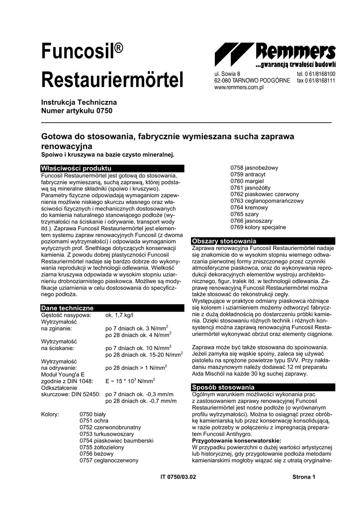 Funcosil® Restauriermörtel Instrukcja Techniczna Numer artykułu 0750 ________________________________________________________________________ Gotowa do stosowania, fabrycznie wymieszana sucha zaprawa renowacyjna Spoiwo i kruszywa na bazie czysto mineralnej. Właściwości produktu Funcosil Restauriermörtel jest gotową do stosowania, fabrycznie wymieszaną, suchą zaprawą, której podstawą są mineralne składniki (spoiwo i kruszywo). Parametry fizyczne odpowiadają wymaganiom zapewnienia możliwie niskiego skurczu własnego oraz właściwości fizycznych i mechanicznych dostosowanych do kamienia naturalnego stanowiącego podłoże (wytrzymałości na ściskanie i odrywanie, transport wody itd.). Zaprawa Funcosil Restauriermörtel jest elementem systemu zapraw renowacyjnych Funcosil (z dwoma poziomami wytrzymałości) i odpowiada wymaganiom wytycznych prof. Snethlage dotyczących konserwacji kamienia. Z powodu dobrej plastyczności Funcosil Restauriermörtel nadaje się bardzo dobrze do wykonywania reprodukcji w technologii odlewania. Wielkość ziarna kruszywa odpowiada w wysokim stopniu uziarnieniu drobnoziarnistego piaskowca. Możliwe są modyfikacje uziarnienia w celu dostosowania do specyficznego podłoża. Dane techniczne Gęstość nasypowa: Wytrzymałość na zginanie: Wytrzymałość na ściskanie: ok. 1,7 kg/l po 7 dniach ok. 3 N/mm2 po 28 dniach ok. 4 N/mm2 po 7 dniach ok. 10 N/mm2 po 28 dniach ok. 15-20 N/mm2 Wytrzymałość na odrywanie: po 28 dniach > 1 N/mm2 Moduł Young'a E zgodnie z DIN 1048: E ~ 15 * 103 N/mm2 Odkształcenie skurczowe: DIN 52450: po 7 dniach ok. -0,3 mm/m po 28 dniach ok. -0,7 mm/m Kolory: 0750 biały 0751 ochra 0752 czerwonobrunatny 0753 turkusowoszary 0754 piaskowiec baumberski 0755 żółtozielony 0756 beżowy 0757 ceglanoczerwony 0758 jasnobeżowy 0759 antracyt 0760 margiel 0761 jasnożółty 0762 piaskowiec czerwony 0763 ceglanopomarańczowy 0764 kremowy 0765 szary 0766 jasnoszary 0769 kolory specjalne Obszary stosowania Zaprawa renowacyjna Funcosil Restauriermörtel nadaje się znakomicie do w wysokim stopniu wiernego odtwarzania pierwotnej formy zniszczonego przez czynniki atmosferyczne piaskowca, oraz do wykonywania reprodukcji dekoracyjnych elementów wystroju architektonicznego, figur, tralek itd. w technologii odlewania. Zaprawę renowacyjną Funcosil Restauriermörtel można także stosować do rekonstrukcji cegły. Występujące w praktyce odmiany piaskowca różniące się kolorem i uziarnieniem możemy odtworzyć fabrycznie z dużą dokładnością po dostarczeniu próbki kamienia. Dzięki stosowaniu różnych technik i różnych konsystencji można zaprawą renowacyjną Funcosil Restauriermörtel wykonywać obrzut oraz elementy ciągnione. Zaprawa może być także stosowana do spoinowania. Jeżeli zamyka się wąskie spoiny, zaleca się używać pistoletu na sprężone powietrze typu SVV. Przy nakładaniu maszynowym należy dodawać 12 ml preparatu Aida Mischöl na każde 30 kg suchej zaprawy. Sposób stosowania Ogólnym warunkiem możliwości wykonania prac z zastosowaniem zaprawy renowacyjnej Funcosil Restauriermörtel jest nośne podłoże (o wyrównanym profilu wytrzymałości). Można to osiągnąć przez obróbkę kamieniarską lub przez konserwację konsolidującą, w razie potrzeby w połączeniu z impregnacją preparatem Funcosil Antihygro. Przygotowanie konserwatorskie: W przypadku powierzchni o dużej wartości artystycznej lub historycznej, gdy przygotowanie podłoża metodami kamieniarskimi mogłoby wiązać się z utratą oryginalne- IT 0750/03.02 Strona 1 go charakteru, należy wykonać przygotowanie podłoża względnie prace mające na celu konsolidację kamienia w systemie preparatów wzmacniających kamień Funcosil opartych na estrach kwasu krzemowego. Dokładny sposób postępowania należy określić indywidualnie dla każdego obiektu. Przygotowanie kamieniarskie: Miejsca, na które ma być nałożona zaprawa Funcosil Restauriermörtel należy obrysować liniami krzyżującymi się pod kątem prostym a następnie wykuć młotkiem i przecinakiem lub wyciąć kątówką. Uszkodzone, zniszczone przez czynniki atmosferyczne powierzchnie należy wykuć do zdrowego kamienia. W strefach brzegowych nie można schodzić do zera. Jedynie w przypadku bardzo wystających elementów budowlanych, jak gzymsy itp. powinno się zastosować zbrojenie w formie gwiazdowych dybli lub prętów ze stali nierdzewnej. Zbrojenie można zakotwić dyblami z tworzywa sztucznego lub zagęszczoną żywicą Viscacid Epoxi-Bauharz. Nakładanie zaprawy renowacyjnej: Przed nałożeniem zaprawy Funcosil Restauriermörtel wymagane jest, szczególnie w przypadku głębokich ubytków, wykonanie jedno- lub wielowarstwowego rdzenia z zaprawy podkładowej Funcosil Grundiermörtel. Miejsca przeznaczone do wykonania prac należy przedmuchać sprężonym powietrzem, dobrze wstępnie zmoczyć (zaleca się zmoczyć już dzień wcześniej) i pokryć zaprawą Funcosil Restauriermörtel w konsystencji szlamu (ok. 1 l wody na 5 kg zaprawy). Na świeżą warstwę szlamu nakłada się natychmiast zaprawę Funcosil Restauriermörtel w konsystencji plastycznej (750 ml wody na 5 kg zaprawy), tak aby warstwa zaprawy wystawała 1-2 mm powyżej otaczającego kamienia. Należy koniecznie zachować układ spoin muru. Lekko związaną zaprawę Funcosil Restauriermörtel przeciera się następnie pacą pokrytą porowatą gumą a po 3-4 godzinach (gdy ziarno wyskakuje przy przeciągnięciu cykliną) poddaje obróbce kamieniarskiej w celu dopasowania do oryginalnej powierzchni kamienia. Doświadczenie pokazuje, że nigdy nie powinno się nakładać grubszych warstw zaprawy renowacyjnej (maks. 3 cm). Nakładanie cienkich warstw w strefach brzegowych ubytków można w razie potrzeby ułatwić przez dodanie preparatu Funcosil Haftemulsion do wody zarobowej (proporcja mieszania 1:4); twardnienie jest przez to nieco opóźniane a wytrzymałość na odrywanie podwyższana. Przeb