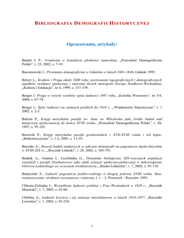 B IBLIOGRAFIA D EMOGRAFII H ISTORYCZNEJ Opracowania, artykuły: Bardet J. P., Urodzenia w kontekście płodności naturalnej, „Przeszłość Demograficzna Polski”, t. 23, 2002, s. 7-19. Baszanowski J., Przemiany demograficzne w Gdańsku w latach 1601-1846, Gdańsk 1995. Belzyt L., Kraków i Praga około 1600 roku: porównanie topograficznych i demograficznych aspektów struktury społecznej i etnicznej dwóch metropolii Europy Środkowo-Wschodniej, „Kultura i Edukacja”, nr 4, 1999, s. 157-159. Berger J. Praga w świetle wyników spisu ludności 1997 roku, „Kronika Warszawy”, nr 3/4, 2000, s. 67-74. Berger J., Spisy ludności na ziemiach polskich do 1918 r., „Wiadomości Statystyczne”, t. 1 2002, s. 2-5. Bokota P., Księgi metrykalne parafii św. Jana we Włocławku jako źródło badań nad miejscową społecznością do końca XVIII wieku, „Przeszłość Demograficzna Polski”, t. 20, 1997, s. 95-103. Borowik P., Księgi metrykalne parafii grodzieńskich z XVII-XVIII wieku i ich kopie, „Białostocczyzna”, t. 1-2, 2001, s. 13-19. Breczko A., Rozwój badań naukowych w zakresie demografii na pograniczu śląsko-łużyckim w XVIII-XIX w., „Rocznik Lubuski”, t. 28, 2002, s. 185-191. Budnik A., Gumna I., Liczbińska G., Dynamika biologiczna XIX-wiecznych populacji wiejskich z parafii Dziekanowice jako efekt sytuacji społeczno-politycznej w mikroregionie Ostrowa Lednickiego we wczesnym średniowieczu, „Studia Lednickie’, t. 7, 2002, s. 95-110. Budzyński Z., Ludność pogranicza polsko-ruskiego w drugiej polowie XVIII wieku. Stan, rozmieszczenie, struktura wyznaniowa i etniczna, t. 1 – 2, Przemyśl – Rzeszów 1993. Chłosta-Zielonka J., Wysiedlenie ludności polskiej z Prus Wschodnich w 1939 r., „Rocznik Mazurski”, t. 7, 2003, s. 63-66. Chlebna A., Ludność Łowicza i jej sytuacja mieszkaniowa w latach 1918-1957, „Roczniki Łowickie”, t. 1, 2003, s. 93-210. 1 Czabański A., Urodzenia pozamałżeńskie w Poznaniu w latach 1912-1937: analiza zjawiska w świetle współczesnych trendów ogólnopolskich i ogólnoeuropejskich, „Poznańskie Zeszyty Humanistyczne”, t. 1, 2003, s. 59-71. Dąbrowski R., Ocena wewnątrzgrupowego spokrewnienia ludności z mikroregionu Ostrowa Lednickiego w XIX i początkach XX wieku – analiza izonomii, „Studia Lednickie”, t. 7, 2002, s. 116-126. Domożol M., Ocena stanu puli genów na podstawie analizy odległości małżeńskich w populacjach wiejskich z mikroregionu Ostrowa Lednickiego na przełomie XIX i XX wieku, „Studia Lednickie”, t. 7, 2002, s. 127-141. Dubert I., Geografia form rodzinnych w Hiszpanii w latach 1752-1860, „Przeszłość Demograficzna Polski”, t. 24, 2003, s. 75-102. Dyczewski L., Ludzie starzy i starość w społeczenstwie polskim, Lublin 1994. Dyl K., Socjotopografia Torunia przed I wojną światową na tle rozwoju gospodarczego i ludnościowego miasta w XIX i na początku XX wieku, „Rocznik Toruński”, t. 28, 2001, s. 95121. Eberhardt P., Geografia ludności Rosji, Warszawa 2002. Eberhardt P.,, Przemiany demograficzno-etniczne na obszarze na obszarze Jugosławii w XX wieku, Lublin 2005. Faure-Chamoux A., Spadek płodności a rodzina miejska w Reims w XVIII wieku, „Przeszłość Demograficzna Polski”, t. 22, 2001, s. 33-53. Gawrysiakowa J., Realizacja zasad rejestracji ruchu naturalnego ludności różnych wyznań w latach 1797-1900 (na przykładzie Lubelszczyzny), t. 12, „Przeszłość Demograficzna Polski”, 1980, s. 7-45. Gawrysiakowa J., Rejestracja ruchu naturalnego ludności unickiej na Lubelszczyźnie w XVIII-XIX w. (do 1875 r.), „Przeszłość Demograficzna Polski”, t. 14, 1983, s. 41-68. Gawrysiakowa J., Grupy wyznaniowe ludności w Lubelskiem w XIX wieku w świetle rejestracji ruchu naturalnego, Lublin 1992. Gawryszewski A, Ludność Polski w XX wieku, Warszawa 2005. Gaziński R., Z dziejów długowieczności. Stulatkowie na Pomorzu w XVIII w., [w:] Monumenta Manet. Księga pamiątkowa dedykowana profesorowi Tadeuszowi Białeckiemu, pod red. A. Makowskiego i E. Włodarczyka, Szczecin 2003, s. 133-149. Gaziński R., Z dziejów dlugowieczności. Rejestracja osób zmarłych powyżej 90. roku życia na Pomorzu w XVIII wieku, [w:] Wykłady na posiedzeniach publicznych walnego zebrania czlonkow Szczecińskiego Towarzystwa Naukowego, z. 1, Szczecin 2004. 2 Gieysztorowa I., Niebezpieczeństwa metodyczne polskich badań metrykalnych XVII – XVIII wieku, „Kwartalnik Historii Kultury Materialnej”, R. 19, 1971, nr 4, s. 557-603. Gieysztorowa I., Wstęp do demografii staropolskiej, Warszawa 1976. Gieysztorowa I., Niewiarygodność statystyki demograficznej ziem polskich w XIX w. i potrzeba jej korekty, „Przeszłość Demograficzna Polski”, t. 12, 1980, s. 179-190. Gieysztorowa I., Trudne początki statystyki demograficznej Królestwa Polskiego, „Przeszłość Demograficzna Polski”, t. 14, 1984. Gordziejew J., Socjotopografia Grodna w XVIII wieku, Toruń 2002. Górna K., Rodzina na Górnym i Dolnym Śląsku w XVIII-XIX wieku. Kontynuacje i zmiany demograficzne, „Przeszłość Demograficzna Polski”, t. 26, 2005, s. 47-60. Górny M., Rejestracja metrykalna parafii Szaradowo z XVIII wieku, „Przeszłość Demograficzna Polski”, t. 18, 1990, s. 117-137. Górny M., Słowa niektóre dla jednostajnego pisania metryk ks. Żarnowieckiego z 1795 r., „Przeszłość Demograficzna Polski”, t. 18, 1990, s. 229-238. Górny M., Mieszkańcy parafii pępowskiej w 1777 r. Analiza księgi status animarum, Wrocław 1994. Greiner P., Emigracje Górnoślązaków, „Śląsk”, t. 10,1999, s. 16-17. Guldon Z., Ludność i gospodarka Rosji i Polski w XVI-XVIII wieku. Wybrane problemy badawcze, [w:] Z dziejów Europy wczesnonowozytnej, pod red. J. Wijaczka, Kielce 1997, s. 127-159. Gut A., Model rodziny szlacheckiej w majątku wiejskim na Pomorzu miedzy wiekiem XVIII a początkiem XX wieku w świetle kronik rodzinnych, [w:] „Dzieje wsi pomorskiej”, IV Międzynarodowa Kon