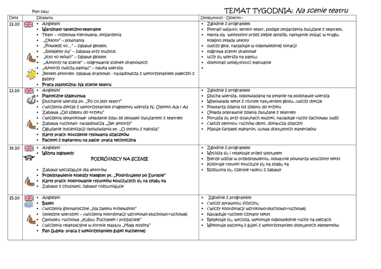 TEMAT TYGODNIA: Na scenie teatru Plan zajęć Data Działania 12.10 13.10 14.10 15.10 Umiejętności - Dziecko : Angielski Warsztaty taneczno-teatralne Teatr – rozmowa kierowana, skojarzenia „Ukłony” – powitania „Powiedz to…” – zabawy głosem. „Śmiejemy się” – zabawa przy muzyce. „Kto to mówi?” – zabawy głosem „Aktorzy na scenie” – odgrywanie scenek dramowych „Aktorzy ćwiczą pamięć” – nauka wiersza Jestem aktorem- zabawa dramowo - naśladowcza z wykorzystaniem pałeczki z gazety Praca plastyczna: Na scenie teatru Angielski Plastyczne szaleństwa Słuchanie wiersza pt. „Po co jest teatr?” Ćwiczenia dykcje z wykorzystaniem fragmentu wiersza N. Usenko Ala i As Zabawa „Od szeptu do krzyku” Ćwiczenia słownikowe- układanie zdań ze słowami związanymi z teatrem Zabawa ruchowo- naśladowcza „Jak aktorzy” Oglądanie inscenizacji opowiadania pt. „O smoku z kalosza” Karty pracy: kończenie rysowania szlaczków Pacynki z makaronu na palce- praca techniczna Angielski Wizyta logopedy PODRÓŻNICY NA SCENIE Zabawy wyciszające dla aktorów Przedstawienie koledzy kolegom pt. „Podróżujemy po Europie” Karty pracy: kolorowanie rysunków kończących się na sylabę ka Zabawy z chustami, zabawy rozluźniające Angielski Basen Ćwiczenia gimnastyczne „Na zamku królewskim” Śmieszne wierszyki – ćwiczenia koordynacji wzrokowo-słuchowo-ruchowej Opowieść ruchowa „Kubuś Puchatek i przyjaciele” Ćwiczenia relaksacyjne w formie masażu „Mała myszka” Pan Gąbka- praca z wykorzystaniem gąbki kuchennej Zgodnie z programem Potrafi wyjaśnić termin teatr, podaje skojarzenia związane z teatrem, kłania się wymyślony przez siebie sposób, następnie stojąc w kręgu, kolejno składa ukłony ćwiczy głos, naśladuje w odpowiedniej tonacji odgrywa scenki dramowe uczy się wiersza na pamięć doskonali umiejętności manualne Zgodnie z programem Słucha wiersza, odpowiadana na pytanie na podstawie wiersza Wypowiada tekst z różnym natężeniem głosu, ćwiczy dykcje Powtarza zdania od szeptu do krzyku Układa poprawnie zdania związane z teatrem Porusza się przy dźwiękach muzyki, naśladuje ruchy zachowań ludzi Ćwiczy płynność ruchów dłoni, dokańcza szlaczki Maluje farbami makaron, używa dostępnych materiałów Zgodnie z programem Wycisza się i relaksuje przed występem Bierze udział w przedstawieniu, odważnie powtarza wyuczony tekst Koloruje rysunki kończące się na sylabę ka Rozluźnia się, czerpie radość z zabawy Zgodnie z programem Ćwiczy sprawność fizyczną Ćwiczy koordynacji wzrokowo-słuchowo-ruchowej Naśladuje ruchem czytany tekst Relaksuje się, wycisza, wykonuje odpowiednie ruchy na plecach Wykonuje pacynkę z gąbki z wykorzystaniem dostępnych elementów 16.10 Angielski Zabawa ruchowa „Za kurtyną” Zabawy z elementami dramy „Teatralne dialogi” Karty pracy: kolorowanie jednakowo takich samych klocków Zabawa twórcza- teatr cieni Bajka relaksacyjna o wróżce i drewnianym pajacyku Bajkowe zagadki Łabędź z papieru- wycinamy, składamy Zgodnie z programem Zgodnie się bawi, naśladuje ruchy ozbogaca słownictwo koloruje jednakowo takie same klocki słucha bajki, relaksuje się odgaduje zagadki tekstowe wycina element, składa w wachlarz papier, składa części