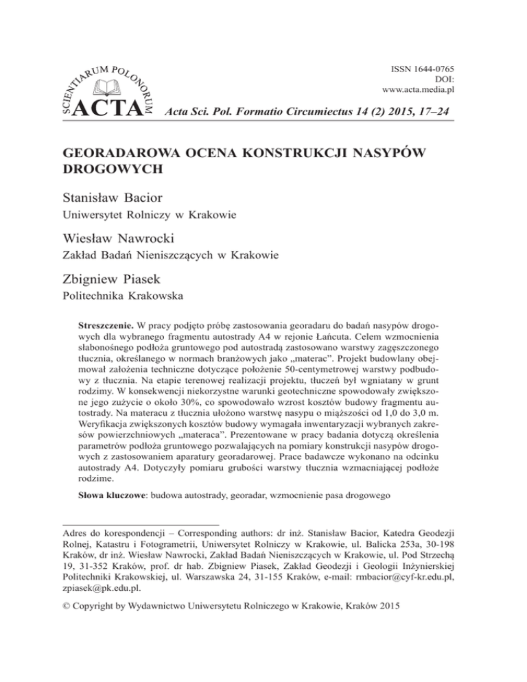 ISSN 1644-0765 DOI: www.acta.media.pl Acta Sci. Pol. Formatio Circumiectus 14 (2) 2015, 17–24 GEORADAROWA OCENA KONSTRUKCJI NASYPÓW DROGOWYCH Stanisław Bacior Uniwersytet Rolniczy w Krakowie Wiesław Nawrocki Zakład Badań Nieniszczących w Krakowie Zbigniew Piasek Politechnika Krakowska Streszczenie. W pracy podjęto próbę zastosowania georadaru do badań nasypów drogowych dla wybranego fragmentu autostrady A4 w rejonie Łańcuta. Celem wzmocnienia słabonośnego podłoża gruntowego pod autostradą zastosowano warstwy zagęszczonego tłucznia, określanego w normach branżowych jako „materac”. Projekt budowlany obejmował założenia techniczne dotyczące położenie 50-centymetrowej warstwy podbudowy z tłucznia. Na etapie terenowej realizacji projektu, tłuczeń był wgniatany w grunt rodzimy. W konsekwencji niekorzystne warunki geotechniczne spowodowały zwiększone jego zużycie o około 30%, co spowodowało wzrost kosztów budowy fragmentu autostrady. Na materacu z tłucznia ułożono warstwę nasypu o miąższości od 1,0 do 3,0 m. Weryfikacja zwiększonych kosztów budowy wymagała inwentaryzacji wybranych zakresów powierzchniowych „materaca”. Prezentowane w pracy badania dotyczą określenia parametrów podłoża gruntowego pozwalających na pomiary konstrukcji nasypów drogowych z zastosowaniem aparatury georadarowej. Prace badawcze wykonano na odcinku autostrady A4. Dotyczyły pomiaru grubości warstwy tłucznia wzmacniającej podłoże rodzime. Słowa kluczowe: budowa autostrady, georadar, wzmocnienie pasa drogowego Adres do korespondencji – Corresponding authors: dr inż. Stanisław Bacior, Katedra Geodezji Rolnej, Katastru i Fotogrametrii, Uniwersytet Rolniczy w Krakowie, ul. Balicka 253a, 30-198 Kraków, dr inż. Wiesław Nawrocki, Zakład Badań Nieniszczących w Krakowie, ul. Pod Strzechą 19, 31-352 Kraków, prof. dr hab. Zbigniew Piasek, Zakład Geodezji i Geologii Inżynierskiej Politechniki Krakowskiej, ul. Warszawska 24, 31-155 Kraków, e-mail: [email protected], [email protected]. © Copyright by Wydawnictwo Uniwersytetu Rolniczego w Krakowie, Kraków 2015 18 S. Bacior, W. Nawrocki. Z. Piasek FIZYCZNE METODY ROZPOZNAWANIA PODŁOŻA PRZY POMOCY TECHNIK GEORADAROWYCH W nieinwazyjnych metodach badań struktury podłoża wykorzystywane są zjawiska związane z rozprzestrzenianiem się fal, które w trakcie przemieszczania się przez niejednorodny ośrodek gruntowy, mogą ulegać odbiciu, załamaniu, interferencji, dyfrakcji, rezonansowi i tłumieniu. Poprawna interpretacja zarejestrowanych zmian fali po przejściu przez badany ośrodek, pozwala na jego rozpoznanie. Wzbudzenie drgań mechanicznych w ośrodku gruntowym powoduje powstanie przemieszczających się w nim fal poprzez przenoszenie drgań z jednej cząsteczki na drugą, bez ich przesunięcia. W drganiach elektromagnetycznych nie istnieją cząstki fizyczne, które przenoszą drgania. Rozchodzenie się tego rodzaju fal odbywa się poprzez oddziaływania ładunków elektrycznych i magnetycznych, ulegających periodycznym zmianom. Drgania elektryczne powstają w wyniku ruchu elektronów związanych z przepływem prądu zmiennego przez ośrodek. Rozpatrywane są one nie jako przesunięcie w sensie geometrycznym, lecz wychylenie. Analizowane fale i ich częstotliwości mogą być zastosowane w badaniach właściwości struktur podpowierzchniowych oraz przy wykrywaniu znajdujących się w nich obiektów. Pomiary elektrooporowe wykonywane są poprzez doprowadzenie do przepływu prądu elektrycznego w gruncie i pomiar jego oporu. Prąd doprowadza się do podłoża gruntowego poprzez dwie wbite w niego elektrody zasilające. Elektrody podłączone są do źródła prądu zmiennego lub stałego, które dostarczają prąd o znanym natężeniu. Aby wyznaczyć wartość oporu elektrycznego niezbędny jest pomiar napięcia przepływającego w gruncie prądu elektrycznego. Pomiaru dokonuje się z zastosowaniem kolejnych wbitych w grunt elektrod pomiarowych podłączonych do miernika napięcia elektrycznego. Wyniki z pomiarów są podstawą do określenia geoelektrycznych przekrojów gruntu. Metody sejsmiczne mają zastosowanie do pomiarów geofizycznych, w których wykorzystywane są własności fal sprężystych, wzbudzonych w ośrodku gruntowym. Analizując zmiany prędkości i parametrów fali sprężystej w badanym środowisku, można wnioskować o jego budowie [Fajklewicz 1972]. W metodzie georadarowej wykorzystywane jest zjawisko odbicia przemieszczającej się fali elektromagnetycznej od obiektów i struktur, różniących się wartościami stałej dielektrycznej. Georadar jest urządzeniem pozwalającym na badania i pomiary budowy warstw podłoża gruntowego [Karczewski i Ziętek 1996, Marcak i in. 1996]. Spośród prezentowanych metod jedynie aparatura georadarowa umożliwia wykonanie pomiarów grubości warstw podłoża gruntowego z dokładnością centymetrową, co jest wymagane w realizacji omawianych badań. Acta Sci. Pol. Georadarowa ocena konstrukcji nasypów drogowych 19 METODA GEORADAROWA POMIARU WARSTW WZMACNIAJĄCYCH PODBUDOWĘ NASYPU Pomiar georadarem polega na przesuwaniu jego anten wzdłuż wyznaczonego profilu. Antena nadawcza i odbiorcza przemieszczane są równocześnie. Z anteny wysyłany jest impuls fali elektromagnetycznej o określonej częstotliwości i amplitudzie. Fala ta odbija się na granicy dwóch ośrodków i powraca do aparatury, gdzie jest elektronicznie przetwarzana i rejestrowana. Impulsy fal wysyłane w trakcie przemieszczeń anteny skanują podłoże i tworzą jego obraz w postaci tzw. echogramu. Głębokość granicy odbijającej falę oblicza się ze wzoru: D= c⋅t 2 εr , m (1) gdzie: εr – stała dielektryczna, t – czas od wysłania do rejestracji odbitego sygnału, c – prędkość światła. W ośrodku geologicznym impuls elektromagnetyczny ulega tłumieniu, odbiciu i załamaniu. Tłumienie fali elektromagnetycznej ma podstawowy wpływ na zasięg gł