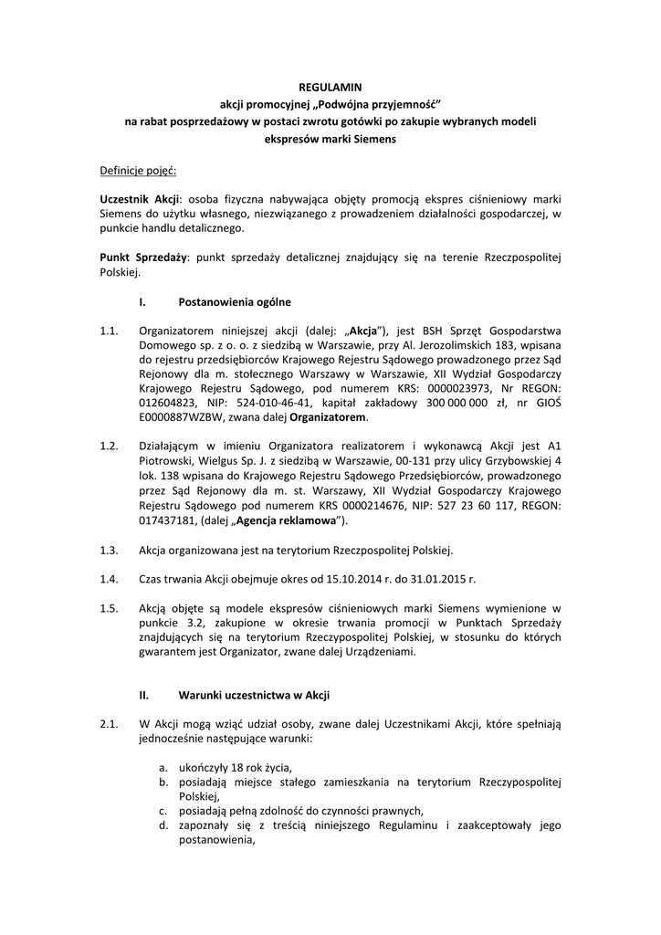 REGULAMIN akcji promocyjnej „Podwójna przyjemność” na rabat posprzedażowy w postaci zwrotu gotówki po zakupie wybranych modeli ekspresów marki Siemens Definicje pojęć: Uczestnik Akcji: osoba fizyczna nabywająca objęty promocją ekspres ciśnieniowy marki Siemens do użytku własnego, niezwiązanego z prowadzeniem działalności gospodarczej, w punkcie handlu detalicznego. Punkt Sprzedaży: punkt sprzedaży detalicznej znajdujący się na terenie Rzeczpospolitej Polskiej. I. Postanowienia ogólne 1.1. Organizatorem niniejszej akcji (dalej: „Akcja”), jest BSH Sprzęt Gospodarstwa Domowego sp. z o. o. z siedzibą w Warszawie, przy Al. Jerozolimskich 183, wpisana do rejestru przedsiębiorców Krajowego Rejestru Sądowego prowadzonego przez Sąd Rejonowy dla m. stołecznego Warszawy w Warszawie, XII Wydział Gospodarczy Krajowego Rejestru Sądowego, pod numerem KRS: 0000023973, Nr REGON: 012604823, NIP: 524-010-46-41, kapitał zakładowy 300 000 000 zł, nr GIOŚ E0000887WZBW, zwana dalej Organizatorem. 1.2. Działającym w imieniu Organizatora realizatorem i wykonawcą Akcji jest A1 Piotrowski, Wielgus Sp. J. z siedzibą w Warszawie, 00-131 przy ulicy Grzybowskiej 4 lok. 138 wpisana do Krajowego Rejestru Sądowego Przedsiębiorców, prowadzonego przez Sąd Rejonowy dla m. st. Warszawy, XII Wydział Gospodarczy Krajowego Rejestru Sądowego pod numerem KRS 0000214676, NIP: 527 23 60 117, REGON: 017437181, (dalej „Agencja reklamowa”). 1.3. Akcja organizowana jest na terytorium Rzeczpospolitej Polskiej. 1.4. Czas trwania Akcji obejmuje okres od 15.10.2014 r. do 31.01.2015 r. 1.5. Akcją objęte są modele ekspresów ciśnieniowych marki Siemens wymienione w punkcie 3.2, zakupione w okresie trwania promocji w Punktach Sprzedaży znajdujących się na terytorium Rzeczypospolitej Polskiej, w stosunku do których gwarantem jest Organizator, zwane dalej Urządzeniami. II. 2.1. Warunki uczestnictwa w Akcji W Akcji mogą wziąć udział osoby, zwane dalej Uczestnikami Akcji, które spełniają jednocześnie następujące warunki: a. ukończyły 18 rok życia, b. posiadają miejsce stałego zamieszkania na terytorium Rzeczypospolitej Polskiej, c. posiadają pełną zdolność do czynności prawnych, d. zapoznały się z treścią niniejszego Regulaminu i zaakceptowały jego postanowienia, e. dokonały zakupu Urządzeń w terminie 15.10.2014 – 31.01.2014, f. dokonały rejestracji zakupu zgodnie z procedurą opisaną w paragrafie III niniejszego Regulaminu. Przy czym, warunki od a. do e. powinny być spełnione w momencie rejestracji zakupu zgodnie z procedurą opisaną w paragrafie III niniejszego Regulaminu. 2.2. W Akcji nie mogą uczestniczyć właściciele, udziałowcy, współwłaściciele lub osoby zatrudnione w jakiejkolwiek formie prawnej w punktach sprzedaży detalicznej, studiach mebli kuchennych oraz hurtowniach, prowadzących sprzedaż produktów Organizatora i członkowie rodzin w/w osób. Przez członków rodziny, o których mowa powyżej rozumie się: wstępnych, zstępnych, rodzeństwo, małżonków, małżonków rodzeństwa, rodziców małżonków, krewni w linii bocznej do II stopnia i osoby pozostające w stosunku przysposobienia. 2.3. Udział w Akcji i podanie danych osobowych na potrzeby przeprowadzenia Akcji jest całkowicie dobrowolne, ale niezbędne do wzięcia udziału w Akcji. III. Zasady Akcji 3.1. W Akcji może wziąć udział Uczestnik Akcji, który zakupi Urządzenie w Punkcie Sprzedaży w terminie 15.10.2014 – 31.01.2015 oraz spełni warunki uczestnictwa w Akcji określone w paragrafie II niniejszego Regulaminu. 3.2 Uczestnik akcji otrzyma rabat posprzedażowy w postaci zwrotu gotówki w wysokości zależnej od modelu zakupionego urządzenia. - Dla wymienionych poniżej ekspresów linii EQ.8: TE 809201RW TE 806201RW TE 803209RW rabat wynosi 500 zł brutto. - Dla wymienionych poniżej ekspresów linii EQ.7 i EQ.6: TE 712201RW TE 717209RW TE 607203RW TE 603201RW rabat wynosi 350 zł brutto. - Dla wymienionych poniżej ekspresów linii EQ.5: TE 501203RW TE 501205RW TE 502206RW TE 503201RW TE 503209RW TE 506201RW TE 506209RW TE 509201RW rabat wynosi 150 zł brutto. 3.3 Rabat otrzyma Uczestnik Akcji, który kupi Urządzenie w Punkcie Sprzedaży i zarejestruje on-line swój zakup na stronie www.siemens-home.pl lub www.kawazprezentem.pl z zachowaniem wymogów określonych w punktach 3.5, 3.6 i 3.7 Regulaminu albo przyśle listem poleconym następujące dokumenty: - wypełniony i podpisany własnoręcznie kupon wycięty z ulotki lub wydrukowany ze strony internetowej www.siemens-home.pl lub www.kawazprezentem.pl kopię faktury VAT lub kopię paragonu z wymienionym modelem Urządzenia, - wycięty z opakowania Urządzenia kod kreskowy. 3.4 Komplety dokumentów, o których mowa w punktach 3.3 Regulaminu, powinny zostać przesłany na adres Agencji reklamowej wskazany w punkcie 1.2. Regulaminu z dopiskiem „Kawa z prezentem”. 3.5 Rejestracja on-line może być dokonana za pomocą formularza WWW znajdującego się na stronie www.siemens-home.pl lub www.kawazprezentem.pl i jest skuteczna tylko pod warunkiem dołączenia do niej następujących dokumentów: - skanu faktury VAT lub paragonu z wymienionym modelem Urządzenia - skanu wyciętego z opakowania Urządzenia kodu kreskowego. 3.6 Wysłanie dokumentów do rejestracji lub rejestracja on-line musi odbyć się do dnia 15.02.2015 r. (decyduje data stempla pocztowego lub data rejestracji formularza na stronie WWW). 3.7 Prawidłowo wypełniony kupon / formularz rejestracyjny on-line powinien zawierać: a. dane osobowe Uczestnika Akcji w postaci imienia i nazwiska, adresu zamieszkania wraz z kodem pocztowym, numeru telefonu kontaktowego, adresu e-mail, numeru konta bankowego, imienia i nazwiska właściciela konta bankowego, własnoręcznego podpisu w przypadku kuponów rejestracyjnych, b. Symbol zakupionego Urządzenia. 3.8.1 Zgłoszenia dotyczące urządzeń zakupionych przed 15.10.2014 i po 31.01.2015 r. nie 