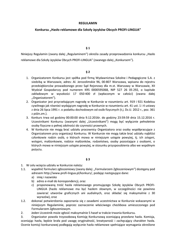 REGULAMIN Konkursu „Hasło reklamowe dla Szkoły Języków Obcych PROFI-LINGUA” §1 Niniejszy Regulamin (zwany dalej „Regulaminem”) określa zasady przeprowadzenia konkursu „Hasło reklamowe dla Szkoły Języków Obcych PROFI-LINGUA” (zwanego dalej „Konkursem”). §2 1. Organizatorem Konkursu jest spółka pod firmą Wydawnictwa Szkolne i Pedagogiczne S.A. z siedzibą w Warszawie, adres: Al. Jerozolimskie 96, 00-807 Warszawa, wpisana do rejestru przedsiębiorców prowadzonego przez Sąd Rejonowy dla m.st. Warszawy w Warszawie, XII Wydział Gospodarczy pod numerem KRS 0000595068, NIP 527 26 05 292, o kapitale zakładowym w wysokości 17 050 400 zł (wpłaconym w całości) (zwana dalej „Organizatorem”). 2. Organizator jest przyrzekającym nagrodę w Konkursie w rozumieniu art. 919 i 921 Kodeksu cywilnego jak również wydającym nagrodę w Konkursie w rozumieniu art. 41 ust. 1 i 4 ustawy z dnia 26 lipca 1991 r. o podatku dochodowym od osób fizycznych (t.j. Dz.U. 2012 r., poz. 361 z późn.zm.). 3. Konkurs trwa od godziny 00:00:00 dnia 9.12.2016r. do godziny 23:59:59 dnia 15.12.2016 r. Uczestnikami Konkursu (zwanymi dalej „Uczestnikami”) mogą być wyłącznie pełnoletnie osoby fizyczne o pełnej zdolności do czynności prawnych. 4. W Konkursie nie mogą brać udziału pracownicy Organizatora oraz osoby współpracujące z Organizatorem przy organizacji Konkursu. W Konkursie nie mogą także brać udziału najbliżsi członkowie rodzin osób, o których mowa w niniejszym ustępie powyżej, tj. ich zstępni, wstępni, małżonkowie, rodzice małżonków, rodzeństwo, osoby pozostające z osobami, o których mowa w niniejszym ustępie powyżej, w stosunku przysposobienia albo we wspólnym pożyciu. §3 1. W celu wzięcia udziału w Konkursie należy: 1.1. wypełnić formularz zgłoszeniowy (zwany dalej: „Formularzem Zgłoszeniowym”) dostępny pod adresem http://www.profi-lingua.pl/konkurs/, podając następujące dane: a) imię i nazwisko b) adres e-mail do korespondencji, oraz c) proponowaną treść hasła reklamowego promującego Szkołę Języków Obcych PROFILINGUA (hasło reklamowe ma być hasłem słownym, w szczególności nie powinno zawierać utworów graficznych ani audialnych, oraz składać się maksymalnie z 30 wyrazów), oraz 1.2. dokonać potwierdzenia zapoznania się z zasadami uczestnictwa w Konkursie wskazanymi w niniejszym Regulaminie, poprzez zaznaczenie właściwego checkboxa umieszczonego pod Formularzem Zgłoszeniowym. 2. Jeden Uczestnik może zgłosić maksymalnie 5 haseł w trakcie trwania Konkursu. 3. Organizator powoła trzyosobową Komisję Konkursową oceniającą przesłane hasła. Komisja, oceniając hasła, będzie brała pod uwagę oryginalność, kreatywność i zachęcający charakter hasła. Ocenie komisji konkursowej podlegają wyłącznie hasła reklamowe spełniające wymagania określone w niniejszym Regulaminie oraz przesłane zgodnie z treścią niniejszego Regulaminu. Komisja konkursowa podejmuje decyzje większością głosów. W przypadku równej liczby głosów rozstrzyga głos przewodniczącego Komisji Konkursowej. Decyzje Komisji Konkursowej są ostateczne i nie przysługuje od nich odwołanie, co nie pozbawia Uczestnika uprawnienia do dochodzenia roszczeń wynikających z przepisów prawa. 4. Nagrodą w konkursie jest nagroda rzeczowa w postaci kuponu rabatowego o wartości 1000 złotych (tysiąc złotych), uprawniającego do obniżenia wartości wybranego przez zwycięzcę kursu językowego, oferowanego w ramach Szkoły Języków Obcych Profi-Lingua, o wartość ww. kuponu rabatowego. Z kuponu, o którym mowa w zdaniu poprzednim, zwycięzca Konkursu będzie mógł skorzystać najpóźniej do końca 2017 r., poprzez zapisanie się przez ww. datą na wybrany przez siebie kurs językowy w dowolnej placówce Szkoły Języków Obcych Profi-Lingua, których lista dostępna jest pod adresem www.profil-lingua.pl. Organizator nie jest zobowiązany do pokrycia różnicy pomiędzy wartością wybranego przez zwycięzcę Konkursu kursu językowego a wartością kuponu rabatowego, o którym mowa w zdaniu poprzednim. Do nagrody, o której mowa powyżej, zostanie dodana nagroda pieniężna stanowiąca 11,11% wartości danej nagrody. Wspomniana nagroda pieniężna nie będzie wypłacona zwycięzcy, lecz pobrana jako podatek zryczałtowany od łącznej wartości nagrody, o którym mowa w ustawie z dnia 26 lipca 1991 r. o podatku dochodowym od osób fizycznych (tekst jednolity: Dz.U. 2012 r., poz. 361 z późn.zm.). Za pobranie i odprowadzenie należnego podatku od nagrody odpowiedzialny jest Organizator. 5. Po zakończeniu Konkursu spośród wszystkich nadesłanych zgłoszeń konkursowych Komisja Konkursowa wyłoni jednego zwycięzcę, którego hasło Komisja Konkursowa uzna za najbardziej oryginalne, kreatywne i zachęcające. 6. W dniu 19.12.2016 r. Organizator skontaktuje się ze zwycięzcą Konkursu, przesyłając informację o zwycięstwie w konkursie na adres e-mail zwycięzcy (wskazany przez Uczestnika jako adres do kontaktów). 7. Organizator nie przewiduje możliwości wypłaty ekwiwalentu pieniężnego zamiast nagrody rzeczowej w postaci kuponu rabatowego, o którym mowa w ust. 4 niniejszego paragrafu. Zwycięzcom nie służy prawo zastrzeżenia określonych cech czy właściwości nagród. 8. Przesyłając zgłoszenie udziału w Konkursie, zgodnie z ust. 1 niniejszego paragrafu, Uczestnik gwarantuje, że jest jej autorem przesłanego hasła reklamowego i przysługuje mu pełnia autorskich praw osobistych i majątkowych do ww. hasła, a także że prawa te nie są obciążone prawami osób trzecich i jest upoważniony do przeniesienia praw na Organizatora w zakresie określonym w umowie, której wzór stanowi załącznik nr 1 do niniejszego Regulaminu. 9. Przesłane hasło nie może naruszać jakichkolwiek praw osób trzecich, w szczególności autorskich praw majątkowych ani dóbr osobistych. Ponadto, treść hasła 