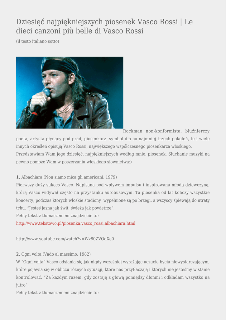 Dziesięć najpiękniejszych piosenek Vasco Rossi | Le dieci canzoni più belle di Vasco Rossi (il testo italiano sotto) Rockman non-konformista, bluźnierczy poeta, artysta płynący pod prąd, piosenkarz- symbol dla co najmniej trzech pokoleń, te i wiele innych określeń opisują Vasco Rossi, największego współczesnego piosenkarza włoskiego. Przedstawiam Wam jego dziesięć, najpiękniejszych według mnie, piosenek. Słuchanie muzyki na pewno pomoże Wam w poszerzaniu włoskiego słownictwa:) 1. Albachiara (Non siamo mica gli americani, 1979) Pierwszy duży sukces Vasco. Napisana pod wpływem impulsu i inspirowana młodą dziewczyną, którą Vasco widywał często na przystanku autobusowym. Ta piosenka od lat kończy wszystkie koncerty, podczas których włoskie stadiony wypełnione są po brzegi, a wszyscy śpiewają do utraty tchu. “Jesteś jasna jak świt, świeża jak powietrze”. Pełny tekst z tłumaczeniem znajdziecie tu: http://www.tekstowo.pl/piosenka,vasco_rossi,albachiara.html http://www.youtube.com/watch?v=Wv80ZVOdXc0 2. Ogni volta (Vado al massimo, 1982) W “Ogni volta” Vasco odsłania się jak nigdy wcześniej wyrażając uczucie bycia niewystarczającym, które pojawia się w obliczu różnych sytuacji, które nas przytłaczają i których nie jesteśmy w stanie kontrolować. “Za każdym razem, gdy zostaję z głową pomiędzy dłońmi i odkładam wszystko na jutro”. Pełny tekst z tłumaczeniem znajdziecie tu: http://www.tekstowo.pl/piosenka,vasco_rossi,ogni_volta.html http://www.youtube.com/watch?v=miKuc_mx2go 3. Canzone (Vado al massimo, 1982) Początkowo pomyślana jako piosenka dla zmarłego niedawno ojca. Vasco przerabia ją tak, by wyrażała te same uczucia w stosunku do kobiety i komponuje przepiękną piosenkę o miłości dla tych, którzy cierpią, nie potrafią zapomnieć, są przygnębieni z powodu okrutnego przeznaczenia. “Więc dziś wieczorem założę w łóżku jedno okrycie więcej, jeśli nie, będzie mi zimno nie mając ciebie, nie mając ciebie na sobie”. Pełny tekst z tłumaczeniem znajdziecie tu: http://www.tekstowo.pl/piosenka,vasco_rossi,canzone.html http://www.youtube.com/watch?v=WctMhQSzp_0 4. Vita spericolata (Bollicine, 1983) Piosenka- symbol całej dyskografii Vasco. „Chcę nieustraszonego życia” nie oznacza pragnienia życia bez zahamowań, pełnego nadmiaru, ale próbę łapania tego, co najlepsze, bez zadowalania się tym, co jest. Vasco śpiewał tę piosenkę podczas festiwalu w San Remo w 1983 roku, zajął ostatnie miejsce. „Chcę życia, w którym nigdy nie jest za późno, tego, w którym nie śpią w ogóle”. Pełny tekst z tłumaczeniem znajdziecie tu: http://www.tekstowo.pl/piosenka,vasco_rossi,vita_spericolata.html https://youtu.be/VNHSL0pTlzA 5. Una canzone per te (Bollicine, 1983) Poezja w muzyce, jedna z najpiękniejszych piosenek o miłości w historii muzyki włoskiej. Piosenkę zadedykowano tej samej bohaterce z „Albachiara” spotkanej ponownie po latach. „Uśmiechasz się, opuszczasz wzrok i mówisz: Nie wierzę, że jestem taka ważna” Pełny tekst z tłumaczeniem znajdziecie tu: http://www.tekstowo.pl/piosenka,vasco_rossi,una_canzone_per_te.html http://www.youtube.com/watch?v=JiW3_PwkhAM 6. Va bene, va bene così (Va bene, va bene così, 1984) Piękna i melanchonijna ballada śpiewana delikatnie. „Nawet jeśli mnie nie kochasz, w porządku, zadzwoń do mnie” śpiewa Vasco pod koniec piosenki pokazując rezygnację i zgorzknienie miłosną historią, która się kończy. „To nie Ty miałaś odejść i nie wrócić więcej…” Pełny tekst: http://www.tekstowo.pl/piosenka,vasco_rossi,va_bene__va_bene_cos_.html http://www.youtube.com/watch?v=xkBdNrsOSeM 7. C’è chi dice no (C’è chi dice no, 1987) Album „C’è chi dice no” to szczytowy album dyskografii Vasco z lat 80′. Piosenka o tym samym tytule to krzyk buntu przeciwko hipokryzji, przeciętności, zrezygnowanej akceptacji brzydoty, która nas otacza. „Wielu ludzi wierzy, że w zaświatach coś jest…kto wie?! Ile ludzi, którzy tam będą się tym zadowoli!” Pełny tekst z tłumaczeniem znajdziecie tu: http://www.tekstowo.pl/piosenka,vasco_rossi,c___chi_dice_no.html http://www.youtube.com/watch?v=b161PFm-bp4 8. Vivere (Gli spari sopra, 1993) Niezapomniany hymn do nadziei, chęci życia teraźniejszością, siły do pójścia naprzód. Vasco zachęca do nie rezygnowania z uśmiechu nawet jeśli życie sprawia nam przykre niespodzianki. Żyjemy i to wystarczy, nawet jeśli czasami oznacza to tylko „przeżycie”. „Żyć…i śmiać się z kłopotów tak, jak nigdy tego nie robiłeś i myśleć zawsze, że jutro będzie lepiej”. Pełny tekst z tłumaczeniem znajdziecie tu: http://www.tekstowo.pl/piosenka,vasco_rossi,vivere.html http://www.youtube.com/watch?v=UI7lFaF_owk 9. Gli angeli (Nessun pericolo… per te, 1996) Vasco pisze tekst pełen bólu i dedykuje go swojemu przyjacielowi i managerowi Maurizio Lolli, który zmarł na raka. Klip do tej piosenki nakręcił Roman Polański i do dziś pozostaje najdroższym klipem w historii muzyki włoskiej. „Kiedy już się lata, nie można już upaść”. Pełny tekst z tłumaczeniem znajdziecie tu: http://www.tekstowo.pl/piosenka,vasco_rossi,gli_angeli.html http://www.youtube.com/watch?v=RoHFoD2powg 10. Il mondo che vorrei (Il mondo che vorrei, 2008) Minimalistyczny tekst typowy dla obecnego Vasco, w którym wyraża brak satysfakcji rozpowszechniony w naszych czasach. To prawdopodobnie najlepszy tekst jego produkcji w ciągu ostatnich dziesięciu lat. „Nie można naciskać tylko na gaz. Spójrz, trzeba się trochę cieszyć”. Pełny tekst: http://www.tekstowo.pl/piosenka,vasco_rossi,il_mondo_che_vorrei.html http://www.youtube.com/watch?v=bzIP7evsnso Le dieci canzoni più belle di Vasco Rossi Rocker anticonformista, poeta dissacrante, artista sempre controcorrente, cantante simbolo di almeno tre generazioni: tutto questo e molto altro è Vasco Rossi, il 