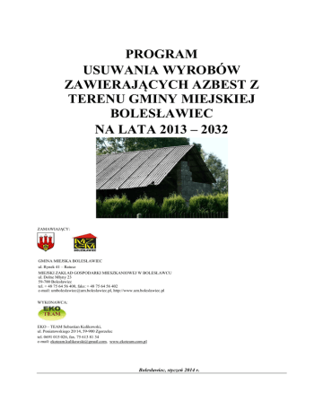PROGRAM USUWANIA WYROBÓW ZAWIERAJĄCYCH AZBEST Z TERENU GMINY MIEJSKIEJ BOLESŁAWIEC NA LATA 2013 – 2032 ZAMAWIAJĄCY: GMINA MIEJSKA BOLESŁAWIEC ul. Rynek 41 – Ratusz MIEJSKI ZAKŁAD GOSPODARKI MIESZKANIOWEJ W BOLESŁAWCU ul. Dolne Młyny 23 59-700 Bolesławiec tel. + 48 75 64 56 400, faks: + 48 75 64 56 402 e-mail: [email protected], http://www.um.boleslawiec.pl WYKONAWCA: EKO – TEAM Sebastian Kulikowski, ul. Poniatowskiego 20/14, 59-900 Zgorzelec tel. 0691 015 026, fax. 75 613 81 34 e-mail: [email protected], www.ekoteam.com.pl Bolesławiec, styczeń 2014 r. Program usuwania wyrobów zawierających azbest z terenu Gminy Miejskiej Bolesławiec na lata 2013-2032 SPIS TREŚCI: 1. WSTĘP .................................................................................................................................................................. 4 2. CELE I ZADANIA PROGRAMU USUWANIA AZBESTU DLA GMINY MIEJSKIEJ BOLESŁAWIEC ........................ 5 3. CHARAKTERYSTYKA AZBESTU I JEGO SZKODLIWOŚĆ DLA ZDROWIA LUDZKIEGO ...................................... 8 3.1. 3.2. 3.3. 4. CHARAKTERYSTYKA GMINY MIEJSKIEJ BOLESŁAWIEC LOKALIZACJA PROGRAMU .................................... 12 4.1. 4.2. 4.3. 5. AZBEST – CHARAKTERYSTYKA ........................................................................................................................... 8 ZASTOSOWANIE AZBESTU ................................................................................................................................ 8 NEGATYWNE ODDZIAŁYWANIA AZBESTU NA ZDROWIE CZŁOWIEKA ........................................................................ 11 POŁOŻENIE ................................................................................................................................................... 12 OCHRONA PRZYRODY I KRAJOBRAZU ................................................................................................................14 WARUNKI WODNE ......................................................................................................................................... 17 PRZEPISY I PROCEDURY W ZAKRESIE POSTĘPOWANIA Z ODPADAMI ZAWIERAJĄCYMI AZBEST ............. 18 5.1. 5.2. 5.3. AKTY PRAWNE DOTYCZĄCE POSTĘPOWANIA Z ODPADAMI ZAWIERAJĄCYMI AZBEST .................................................18 POSTĘPOWANIE Z WYROBAMI ZAWIERAJĄCYMI AZBEST...................................................................................... 23 ZAKŁADANE PROCEDURY POSTĘPOWANIA Z WYROBAMI ZAWIERAJĄCYMI AZBEST W ASPEKCIE OBOWIĄZUJĄCEGO PRAWA 24 5.4. METODY UNIESZKODLIWIANIE ODPADÓW AZBESTOWYCH................................................................................... 25 5.4.1. Termiczne unieszkodliwianie odpadów azbestowych ..........................................................................25 5.4.2. Chemiczne unieszkodliwienie wyrobów azbestowych ........................................................................ 26 5.4.3. Składowanie odpadów azbestowych ................................................................................................... 26 6. INFORMACJA O ILOŚCI I ROZMIESZCZENIU WYROBÓW ZAWIERAJĄCYCH AZBEST NA TERENIE GMINY MIEJSKIEJ BOLESŁAWIEC – ANALIZA WYNIKÓW INWENTARYZACJI ..................................................................... 27 6.1. 6.2. WYNIKI PRZEPROWADZONEJ INWENTARYZACJI ................................................................................................. 28 OCENA STANU TECHNICZNEGO I MOŻLIWOŚCI BEZPIECZNEGO UŻYTKOWANIA WYROBÓW ZAWIERAJĄCYCH AZBEST (NA PODSTAWIE PRZEPROWADZONEJ INWENTARYZACJI ORAZ DANYCH PRZEKAZANYCH PRZEZ ADMINISTRATORÓW BUDYNKÓW MIESZKALNYCH) .......................................................................................................................................................... 35 7. WSKAZANIE MOŻLIWOŚCI I ŹRÓDEŁ FINANSOWANIA.................................................................................. 35 7.1. OSZACOWANIE KOSZTÓW USUNIĘCIA AZBESTU Z OBIEKTÓW BUDOWNICTWA INDYWIDUALNEGO ............................. 35 7.2. ŹRÓDŁA POZYSKIWANIA ŚRODKÓW FINANSOWYCH NA USUWANIE AZBESTU ......................................................... 36 7.2.1. Instrumenty oferowane przez Wojewódzki Fundusz Ochrony Środowiska i Gospodarki Wodnej we Wrocławiu .......................................................................................................................................................... 37 7.2.2. Instrumenty oferowane przez Program Rozwoju Obszarów Wiejskich na lata 2007-2013 .................. 38 7.2.3. Instrumenty oferowane przez BOŚ we współpracy z Wojewódzkim Funduszem Ochrony Środowiska i Gospodarki Wodnej we Wrocławiu .................................................................................................................... 42 8. OKREŚLENIE ZADAŃ DO REALIZACJI NA OKRES PROGRAMOWANIA. HARMONOGRAM WDRAŻANIA SYSTEMU ..................................................................................................................................................................... 43 9. OKREŚLENIE SPOSOBU MONITOROWANIA I OCENY WDRAŻANIA PROGRAMU......................................... 44 10. ODDZIAŁYWANIE PROPONOWANEGO SYSTEMU USUWANIA WYROBÓW ZAWIERAJĄCYCH AZBEST NA ŚRODOWISKO ............................................................................................................................................................. 45 11. ZARZĄDZANIE, ORGANIZACJA I WDRAŻANIE PROGRAMU ........................................................................... 48 2 Program usuwania wyrobów zawierających azbest z terenu Gminy Miejskiej Bolesławiec na lata 2013-2032 SPIS TABEL: TABELA 1 ZAKRES ZASTOSOWANIA WYROBÓW ZAWIERAJĄCYCH AZBEST ........................................................................................10 TABELA 2 ILOŚĆ WYROBÓW ZAWIERAJĄCYCH AZBEST W OBIEKTACH BĘDĄCYCH 