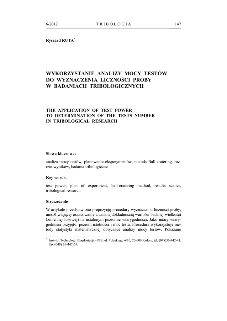 6-2012 TRIBOLOGIA 147 Ryszard RUTA* WYKORZYSTANIE ANALIZY MOCY TESTÓW DO WYZNACZENIA LICZNOŚCI PRÓBY W BADANIACH TRIBOLOGICZNYCH THE APPLICATION OF TEST POWER TO DETERMINATION OF THE TESTS NUMBER IN TRIBOLOGICAL RESEARCH Słowa kluczowe: analiza mocy testów, planowanie eksperymentów, metoda Ball-cratering, rozrzut wyników, badania tribologiczne Key words: test power, plan of experiment, ball-cratering method, results scatter, tribological research Streszczenie W artykule przedstawiono propozycję procedury wyznaczania liczności próby, umożliwiającej oszacowanie z zadaną dokładnością wartości badanej wielkości (zmiennej losowej) na ustalonym poziomie wiarygodności. Jako miary wiarygodności przyjęto: poziom istotności i moc testu. Procedura wykorzystuje metody statystyki matematycznej dotyczące analizy mocy testów. Pokazano * Instytut Technologii Eksploatacji – PIB, ul. Pułaskiego 6/10, 26-600 Radom, tel. (048)36-442-41, fax (048) 36-447-65. 148 TRIBOLOGIA 6-2012 zastosowanie opracowanej procedury do wyznaczenia liczby powtórzeń procedury testowej w metodzie ball-cratering oceny odporności powłok PVD na zużycie ścierne. W ramach prowadzonych badań odporności na zużycie ścierne powłok przeciwzużyciowych podstawowe znaczenie mają ślady zużycia w kształcie kraterów, których średnice są wykorzystywane do obliczenia wartości współczynnika odporności na zużycie ścierne. Testy zużyciowe wykonano w ustalonych warunkach pracy węzła tarcia tj. obciążenia, prędkości obrotowej na zadanej drodze tarcia w obecności węglika krzemu SiC jako ścierniwa. Zgodnie z opracowaną procedurą każdy test powtórzono pięć razy, sprawdzono wiarygodność uzyskanych wyników oraz, w przypadkach uzyskania wyników o nieakceptowanej wiarygodności, przeprowadzono badania uzupełniające. WPROWADZENIE Skuteczność i efektywność badań eksperymentalnych w znacznym stopniu można zwiększyć poprzez szerokie wykorzystanie nowoczesnych metod statystycznych zarówno na etapie planowania eksperymentów, jak i analizy uzyskanych wyników oraz opracowania adekwatnych i wiarygodnych modeli reprezentujących wiedzę uzyskaną w rezultacie przeprowadzonych badań. Szczególnie ważnym problemem, którego właściwe rozwiązanie w większości przypadków determinuje możliwość przeprowadzenia skutecznych i ekonomicznie uzasadnionych badań, jest oszacowanie liczby eksperymentów gwarantujących uzyskanie wartościowych i wiarygodnych informacji o przedmiocie badań. Szczególnie przydatną do tego celu okazała się analiza mocy testów opracowana w latach 80. ubiegłego wieku [L. 1]. Zastosowanie nowoczesnych metod projektowania eksperymentów w tribologii, będącej w swej istocie przede wszystkim nauką eksperymentalną, jest ze wszech miar uzasadnione oraz powinno usprawnić i zwiększyć efektywność badań tribologicznych. ANALIZA MOCY TESTÓW Ponieważ podstawą opracowania procedury wyznaczania liczności próby są metody opracowane w ramach analizy mocy testów, poniżej podano główne zasady testowania hipotez statystycznych oraz metody oceny wielkości błędów, powstających w procesie weryfikacji hipotez statystycznych. W celu wykazania prawdziwości tezy sformułowanej na podstawie badań empirycznych, formułuje się hipotezy: H1 – alternatywną, równoważną z weryfikowaną tezą oraz H0 – hipotezę zerową będącą jej zaprzeczeniem. W procesie weryfikacji dąży się do zakwestionowania hipotezy zerowej H0 jako mało prawdopodobnej (poniżej przyjętego poziomu istotności α), co daje podstawę do przyjęcia hipotezy alternatywnej H1 jako zaprzeczenia odrzuconej hipotezy zerowej. 6-2012 TRIBOLOGIA 149 W przedstawionym powyżej testowaniu OP (odrzucająco-potwierdzającym) wyróżnić można następujące sytuacje (Tabela 1): Tabela 1. Sytuacje decyzyjne w procesie weryfikacji hipotez Table 1. Decision – making situations in the process of verifying hypotheses Hipoteza prawdziwa: H0 Wybrano hipotezę: H1 H0 H1 Poprawne przyjęcie H0 1–β Błąd I rodzaju α Błąd II rodzaju β Poprawne odrzucenie H0 1–α Dwie z nich: przyjęcie prawdziwej hipotezy H0 i odrzucenie nieprawdziwej hipotezy H0 są decyzjami poprawnymi, natomiast zarówno przyjęcie fałszywej hipotezy H0 (i tym samym odrzucenie prawdziwej hipotezy H1) jak i odrzucenie poprawnej hipotezy H0 (i tym samym przyjecie nieprawdziwej hipotezy H1) są decyzjami błędnymi. Zgodnie z konstrukcją procedury weryfikacji hipotez statystycznych, prawdopodobieństwo błędu I rodzaju wyznaczone jest poprzez przyjęty poziom istotności α. W praktyce w naukach przyrodniczych zazwyczaj przyjmuje się α = 0,05, czasami 0,1; 0,01 oraz w szczególnych przypadkach 0,001. Należy zaznaczyć, że wartość poziomu istotności jest rezultatem arbitralnej decyzji badacza, która powinna być podjęta przed przystąpieniem do badań. W przypadku testowania OP niewielka wartość tego błędu ma zasadnicze znaczenie, ponieważ zabezpiecza przed błędnym potwierdzeniem nieprawdziwych rezultatów badań, sformułowanych w postaci hipotezy alternatywnej H1. Oczywiście badacz zainteresowany jest także skutecznością wykrywania nieprawdziwości weryfikowanej hipotezy H1, co jest równoznaczne z nieodrzuceniem poprawnej hipotezy H0, czyli uniknięciem popełnienia błędu II rodzaju. Ponieważ prawdopodobieństwo popełnienia błędu tego rodzaju oznacza się zwyczajowo literą β, zatem prawdopodobieństwo uniknięcia tego błędu µ = (1 – β) nazywane jest mocą testu. Podsumowując można stwierdzić, że przy testowaniu OP błąd I rodzaju oznacza błędne potwierdzenie tezy badacza. Z punktu widzenia odbiorcy wyników badań błąd ten jest szczególnie niekorzystny, bo wiąże się z wydatkowaniem środków nie dających żadnych efektów. Natomiast błąd II rodzaju jest przede wszystkim niekorzystny dla badacza, gdyż pozbawia go wszelkich korzyści wynikających z prawdziwości pos