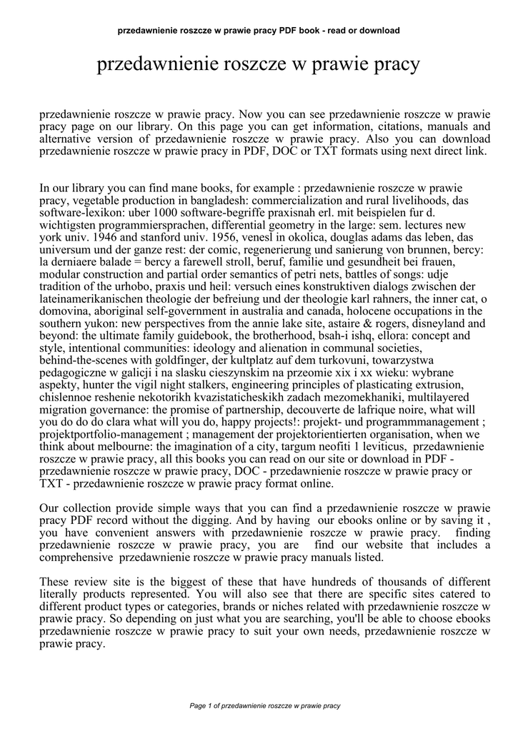 przedawnienie roszcze w prawie pracy PDF book - read or download przedawnienie roszcze w prawie pracy przedawnienie roszcze w prawie pracy. Now you can see przedawnienie roszcze w prawie pracy page on our library. On this page you can get information, citations, manuals and alternative version of przedawnienie roszcze w prawie pracy. Also you can download przedawnienie roszcze w prawie pracy in PDF, DOC or TXT formats using next direct link. In our library you can find mane books, for example : przedawnienie roszcze w prawie pracy, vegetable production in bangladesh: commercialization and rural livelihoods, das software-lexikon: uber 1000 software-begriffe praxisnah erl. mit beispielen fur d. wichtigsten programmiersprachen, differential geometry in the large: sem. lectures new york univ. 1946 and stanford univ. 1956, venesl in okolica, douglas adams das leben, das universum und der ganze rest: der comic, regenerierung und sanierung von brunnen, bercy: la derniaere balade = bercy a farewell stroll, beruf, familie und gesundheit bei frauen, modular construction and partial order semantics of petri nets, battles of songs: udje tradition of the urhobo, praxis und heil: versuch eines konstruktiven dialogs zwischen der lateinamerikanischen theologie der befreiung und der theologie karl rahners, the inner cat, o domovina, aboriginal self-government in australia and canada, holocene occupations in the southern yukon: new perspectives from the annie lake site, astaire & rogers, disneyland and beyond: the ultimate family guidebook, the brotherhood, bsah-i ishq, ellora: concept and style, intentional communities: ideology and alienation in communal societies, behind-the-scenes with goldfinger, der kultplatz auf dem turkovuni, towarzystwa pedagogiczne w galicji i na slasku cieszynskim na przeomie xix i xx wieku: wybrane aspekty, hunter the vigil night stalkers, engineering principles of plasticating extrusion, chislennoe reshenie nekotorikh kvazistaticheskikh zadach mezomekhaniki, multilayered migration governance: the promise of partnership, decouverte de lafrique noire, what will you do do do clara what will you do, happy projects!: projekt- und programmmanagement ; projektportfolio-management ; management der projektorientierten organisation, when we think about melbourne: the imagination of a city, targum neofiti 1 leviticus, przedawnienie roszcze w prawie pracy, all this books you can read on our site or download in PDF przedawnienie roszcze w prawie pracy, DOC - przedawnienie roszcze w prawie pracy or TXT - przedawnienie roszcze w prawie pracy format online. Our collection provide simple ways that you can find a przedawnienie roszcze w prawie pracy PDF record without the digging. And by having our ebooks online or by saving it , you have convenient answers with przedawnienie roszcze w prawie pracy. finding przedawnienie roszcze w prawie pracy, you are find our website that includes a comprehensive przedawnienie roszcze w prawie pracy manuals listed. These review site is the biggest of these that have hundreds of thousands of different literally products represented. You will also see that there are specific sites catered to different product types or categories, brands or niches related with przedawnienie roszcze w prawie pracy. So depending on just what you are searching, you'll be able to choose ebooks przedawnienie roszcze w prawie pracy to suit your own needs, przedawnienie roszcze w prawie pracy. Page 1 of przedawnienie roszcze w prawie pracy