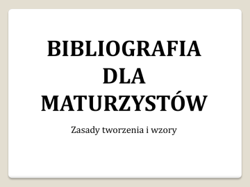 BIBLIOGRAFIA DLA MATURZYSTÓW Zasady tworzenia i wzory MATURZYSTO! Aby przystąpić do ustnego egzaminu maturalnego z języka polskiego: Stwórz bibliografię do swojej prezentacji maturalnej. Bibliografię należy składać w gabinecie pani wicedyrektor Jolanty Kłopeć. Bibliografię składa się na miesiąc przed rozpoczęciem matury – w tym roku do 4 kwietnia 2015 roku! Bibliografia powinna być wydrukowana na kartce A4. W materiałach pomocniczych koniecznie dopisz ramowy plan wypowiedzi! Pamiętaj, by bibliografię podpisać u dołu strony własnym imieniem i nazwiskiem. Nim przystąpisz do pracy nad swoją prezentacją maturalną zapoznaj się z zasadami tworzenia bibliografii załącznikowej. UWAGI: Brak bibliografii + przystąpienie do egzaminu ustnego = niewystarczająca liczba punktów, by zdać egzamin! Dlaczego? Komisja wtedy nie podejmuje z Tobą rozmowy, a więc ocenie nie podlega język i rozmowa. Otrzymujesz maksymalnie 5 punktów. *** Stosujemy zasady skróconego opisu bibliograficznego. W DALSZEJ CZĘŚCI POZNASZ ZASADY TWORZENIA BIBLIOGRAFII. BIBLIOGRAFIA ZAŁĄCZNIKOWA – spis tekstów, dokumentów, obrazów, filmów itd., z których korzystałeś/aś przy tworzeniu prezentacji maturalnej. LITERATURA PODMIOTU – omawiane przez Ciebie utwory literackie, które będziesz analizować w trakcie wypowiedzi. Są to także: dzieła sztuki, muzyka, fragmentu filmów, dokumenty, fotografie itd. LITERATURA PRZEDMIOTU – to książki, czasopisma, artykuły prasowe, popularnonaukowe, opracowania, słowniki, leksykony, publikacje z Internetu itd., które wykorzystałeś/aś opracowując swoją prezentację maturalną. MATERIAŁY POMOCNICZNE – wszystko to, co zamierzasz wykorzystać w trakcie wystąpienia maturalnego: plan ramowy wypowiedzi, prezentacja power point, reprodukcje dzieł malarskich, fotografie, fragmenty filmów/utworów muzycznych, kartka z cytatami, komputer, głośniki, dvd, projektor itd. PODSTAWOWE ZASADY Bibliografia ma układ alfabetyczny! Najpierw podaj nazwisko autora, potem jego imię w pełnym brzmieniu! Stosuj konsekwentnie interpunkcję! Tzn. oddzielaj elementy opisu bibliograficznego tylko kropkami lub tylko przecinkami. Tytuły wszystkich dzieł pisz kursywą! Wyjątkiem jest tytuł czasopisma – wtedy cudzysłów. Informacje przydatne w opisie bibliograficznym znajdziesz na karcie tytułowej. Literaturę podmiotu uporządkuj wg. dziedzin, np. LITERATURA – dla utworów literackich, MALARSTWO , MUZYKA, FILM - dla pozostałych dzieł sztuki Poniżej znajdziesz przykłady KSIĄŻKA NAZWISKO I IMIĘ AUTORA. TYTUŁ. MIEJSCE I ROK WYDANIA. Przykład: Mickiewicz Adam. Dziady. Warszawa 1998. Reymont Stanisław Władysław. Chłopi. T1. Kraków 2009. Llosa Vargas Mario. Ciotka Julia i skryba. Kraków 2008. KSIĄŻKA (kliku autorów) TYTUŁ. RED. IMIĘ I NAZWISKO REDAKTORA NACZELNEGO. MIEJSCE I ROK WYDANIA. Przykład: Słownik literatury polskiej XIX wieku. Red. Józef Bachórz, Alina Kowalczykowa. Wrocław 2002. Literatura polska od średniowiecza do pozytywizmu. Red. Jan Zygmunt Jakubowski. Warszawa 1975. KSIĄŻKA (fragment) NAZWISKO I IMIĘ AUTORA. TYTUŁ. MIEJSCE I ROK WYDANIA,STRONY. Przykład: Markiewicz Henryk. Literatura pozytywizmu. Warszawa 2000, s. 95-107. Kwiatkowska-Podraza Maria. Literatura Młodej Polski. Warszawa 2001, s. 135-140. WIERSZ NAZWISKO I IMIĘ AUTORA.TYTUŁ UTWORU. [W:] TYTUŁ TOMU.AUTOR. MIEJSCE I ROK WYDANIA, STRONA. Przykład: Stachura Edward. Biała Lokomotywa. [W:] Wiersze. Edward Stachura. Toruń 2005, s. 25. Norwid Kamil Cyprian. Fortepian Szopena. [W:] Poezja polska od średniowiecza do współczesności. Warszawa 2000, s. 256. HASŁO SŁOWNIKOWE HASŁO SŁOWNIKOWE. W: TYTUŁ. RED. IMIĘ I NAZWISKO REDAKTORA. MIEJSCE I ROK WYDANIA. Przykład: Stańczyk. [W:] Słownik literatury polskiej XIX wieku. Red. Józef Bachórz, Alina Kowalczykowa. Wrocław 2002. Opis hasła słownikowego możesz potraktować też jak opis fragmentu książki, tzn. na końcu opisu wymienić tylko strony, z których korzystałeś/aś. ARTYKUŁ Z CZASOPISMA NAZWISKO I IMIĘ AUTORA ARTYKUŁU. TYTUŁ ARTYKUŁU. „TYTUŁ CZASOPISMA”. ROK WYDANIA, NUMER, NUMER STRONY. Przykład: Trześniowski Dariusz. Powrót egzystencjalizmu. „Pomagamy uczyć”. 2010, nr 1, s. 11-16. Kuklińska Bożena. Jacek Malczewski. Polska-Sztuka-Śmierć. „Pomagamy uczyć”. 2008, nr 2, s. 51-57. DZIEŁO MALARSKIE NAZWISKO I IMIĘ AUTORA.TYTUŁ OBRAZU. [W:] TYTUŁ ZBIORU. RED. IMIĘ I NAZWISKO REDAKTORA. MIEJSCE I ROK WYDANIA. Przykład: Renoir Auguste. Śpiąca dziewczyna. [W:] 100 piękności w malarstwie. Red. Joanna Reszko-Wróblewska. Warszawa 2007. NAZWISKO I IMIĘ AUTORA. TYTUŁ OBRAZU. [W:] TYTUŁ ZBIORU. IMIĘ I NAZWISKO AUTORA. MIEJSCE I ROK WYDANIA. Przykład: Caravaggio. Narcyz. W: Caravaggio. Gilles Lambert. Warszawa 2005. FILM TYTUŁ FILMU. REŻ. IMIĘ I NAZWISKO REŻYSERA. MIEJSCE I ROK DYSTRUBUCJI. Przykład: Wesele. Reż. Andrzej Wajda. Polska, 1973. Zemsta. Reż. Andrzej Wajda. Polska, 2002. Imię róży. Reż. Jean Jacques Annaud. Francja, Włochy, RFN 1986. STRONA INTERNETOWA NAZWISKO I IMIĘ. TYTUŁ ARTYKUŁU [ONLINE][DOSTĘP]. DOSTĘPNY W INTERNECIE: ADRES STRONY. Przykład: Ryszard Kapuściński zawód - reporter [online] [dostęp 23 lutego 2007]. Dostępny w Internecie: http://www.kapuscinski.hg.pl/index.php Jarecka Dorota. Nawet dzieci myślą [online] [dostęp 12 lutego 2011]. Dostępny w Internecie: http://wyborcza.pl/1,75480,9041028,Nawet_dzieci_mysla.html INTERNETOWA WERSJA UTWORU LITERACKIEGO NAZWISKO I IMIĘ AUTORA. W INTERNECIE:ADRES STRONY. TYTUŁ. [ONLINE][DOSTĘP]. DOSTĘPNY Przykład: Kochanowski Jan. Treny. [online][Dostęp 23 lutego 2007]. Dostępny w Internecie: http://monika.univ.gda.pl/~literat/kochan/index.htm Staff Leopold. Kowal. [online][Dostęp 23 lutego 2007]. Dostępny w Internecie: http://monika.univ.gda.pl/~literat/staff/001.htm UTWÓR MUZYCZNY NAZWISKO I IMIĘ AUTORA. TYTUŁ. WYDAWCA. ROK WYDANIA. Przykład: Chopin F