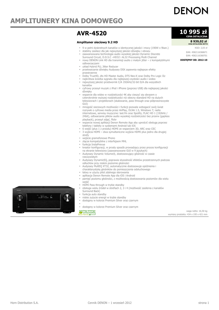 AMPLITUNERY KINA DOMOWEGO 10 995 zł AVR-4520 CENA DETALICZNA 8 939,02 zł Amplituner sieciowy 9.2 HD CENA DETALICZNA NETTO • 9 w pełni dyskretnych kanałów o identycznej jakości i mocy (190W x 9kan.) • stabilny zasilacz dla jak najwyższej jakości dźwięku i obrazu • zaawansowana technologia audio wysokiej jakości Dynamic Discrete Surround Circuit, D.D.S.C –HD32 i AL32 Processing Multi Channel • nowy DENON Link HD dla transmisji audio z małym jitter – z kompatybilnymi odtwarzaczami • układ Hybrid PLL Jitter Reducer • przetwarzanie dźwięku Audyssey DSX zapewnia najlepsze efekty przestrzenne • Dolby TrueHD, dts HD Master Audio, DTS Neo:X oraz Dolby Pro Logic IIz • najkrótsza ścieżka sygnału dla najlepszej czystości audio i wideo • najwyższej jakości przetwornik C/A 192kHz/32-bit D/A dla wszystkich kanałów • cyfrowy przesył muzyki z iPod i iPhone (poprzez USB) dla najlepszej jakości dźwięku • wsparcie dla wideo w rozdzielczości 4K aby cieszyć się obrazem o czterokrotnie wyższej rozdzielczości niż obecny standard HD na dużych telewizorach i projektorach (skalowanie, pass through oraz półprzezroczyste GUI) • mnogość sieciowych możliwości i funkcji pozwala wzbogacić swój świat rozrywki o cyfrowe media przez AirPlay, DLNA 1.5, Windows 7; radio internetowe, serwisy muzyczne: last.fm oraz Spotify; FLAC HD 1 (192kHz / 24bit), odtwarzanie plików audio wysokiej rozdzielczości bez przerw (gapless playback), przesył zdjęć, flickr • wsparcie nowej aplikacji Denon Remote App aby uprościć obsługę poprzez telefony i tablety w systemami Android lub iOS • 6 wejść (plus 1 z przodu) HDMI ze wsparciem 3D, ARC oraz CEC • 3 wyjścia HDMI – dwa symultaniczne wyjścia HDMI plus jedno dla drugiej strefy • wejście gramofonowe Phono • złącze kompatybilne z interfejsem MHL • funkcja InstaPrevue • kreator konfiguracji, w prosty sposób prowadzący przez proces konfiguracji na ekranie telewizora (zaawansowane GUI w 9 językach) • Audyssey Dynamic Volume®, dostosowujący głośność w czasie rzeczywistym • Audyssey DynamicEQ, poprawia słyszalność efektów przestrzennych podczas odłuchów przy niskim poziomie głośności • Audyssey MultEQ XT32, automatycznie dostosowuje opóźnienia i charakterystykę głośników do pomieszczenia odsłuchowego • łatwy w użyciu pilot zdalnego sterowania • aplikacja Denon Remote App dla iOS i Android • pamięć poziomu głośności, z możliwością dostosowania poziomów dla wielu wejść • HDMI Pass through w trybie standby • obsługa wielu źródeł w strefiach 2, 3 i 4 (możliwość zasilenia z kanałów Surround Back) • funkcja auto standby • niskie zużycie energii w trybie standby • dostępny w kolorze Premium Silver oraz czarnym • • dostępny w kolorze Premium Silver oraz czarnym KGO: 2,03 zł EAN: 4582116368671 EAN: 4582116368701 DOSTĘPNY OD: 2012-10 waga netto: 16,50 kg wymiary produktu: 434 x 195 x 421 mm Horn Distribution S.A. Cennik DENON – 1 wrzesień 2012 strona 1 AVR-3313 Amplituner sieciowy 7.2 HD • 165W x 7 kanałów (6 ohm) – w pełni dyskretne i symetrycznie rozłożone stopnie mocy • zaawansowana technologia audio wysokiej jakości Denon D.D.S.C.-HD (Dynamic Discrete Surround Circuit – High Definition) i AL24 Multi Processing • nowy DENON Link HD dla transmisji audio z małym jitter – z kompatybilnymi odtwarzaczami • skalowanie wideo do 1080p oraz 4k, przełączanie sygnałów 4k dla HDMI, półprzeźroczyste menu GUI, nawet przy obrazie 4k • dekodery Dolby TrueHD oraz dts-HD Master Audio • Audyssey MultEQ XT z Audyssey Dynamic Volume oraz Dynamic EQ • Compressed Audio Restorer - polepszający jakość z formatów stratnych • 6 wejść (plus 1 z przodu) HDMI ze wsparciem 3D, ARC oraz CEC • 3 wyjścia HDMI – dwa symultaniczne wyjścia HDMI plus jedno dla drugiej strefy • zaawansowane funkcje sieciowe • certyfikat DLNA1.5 • strumieniowy przesył audio w sieci z obsługą plików FLAC HD • AirPlay - strumieniowy przesył audio Apple • wsparcie serwisu last.fm* • vTuner Internet radio • wsparcie strumieniowego przesyłu zdjęć z serwisu Flickr • wejście USB z przodu: cyfrowe, kompatybilne z iPod / iPhone • Menu Advanced GUI (dostępne w siedmiu językach) z funkcją Setup Assistant ułatwiającą ustawienia i obsługę • funkcja Multizone (3 strefy) • aktualizacja firmware’u przez Internet i USB • funkcja Auto Power Off dla oszczędzania energii • obsługa za pomocą nowej aplikacji Denon Remote App • dostępny w kolorze Premium Silver i czarnym AVR-2313 Amplituner sieciowy 7.2 HD • 135W x 7ch (6 ohm) – w pełni dyskretne i symetrycznie rozłożone stopnie mocy • skalowanie wideo do 1080p oraz 4k Video Scaling, przełączanie sygnałów 4k dla HDMI, półprzezroczyste menu GUI nawet przy obrazie 4k • dekodery Dolby TrueHD oraz dts-HD Master Audio • Audyssey DSX • Audyssey Pro ready • Audyssey MultEQ XT z Audyssey Dynamic Volume oraz Dynamic EQ • Compressed Audio Restorer - polepszający jakość z formatów stratnych • 5 wejścia (plus 1 z przodu) HDMI z wsparciem 3D, ARC oraz CEC • certyfikat DLNA1.5 • strumieniowy przesył audio w sieci z obsługą plików FLAC HD • AirPlay - strumieniowy przeył audio Apple • wsparcie serwisu last.fm* • radio internetowe vTuner • wsparcie strumieniowego przesyłu zdjęć z erwisu Flickr • wejście USB z przodu:cyfrowe, kompatybilne z iPod / iPhone • wejście HDMI z przodu • guzik Quick Select dla łatwego dostępu do ulubionych źródeł • menu Advanced GUI (dostępne w siedmiu językach) z funkcją Setup Assistant ułatwiającą ustawienia i obsługę • rozszerzone funkcje wielostrefowe (2 strefy) z obsługą RS-232 • dwa wyjścia HDMI (działające jednocześnie) • wyjścia pre-out 7.2 kan. • wsparcie DSD dla HDMI • duży, czytelny wyświetlacz • funkcja Auto Power Off dla oszczędzania energii 