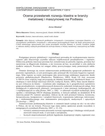 WSPÓŁCZESNE ZARZ DZANIE 1/2012 CONTEMPORARY MANAGEMENT QUARTERLY 1/2012 41 Ocena przesłanek rozwoju klastra w bran y metalowej i maszynowej na Podlasiu Anna Wasiluk ∗ Słowa kluczowe: klastry, innowacyjno , klaster obróbki metali Keywords: clusters, innovativeness, metal work cluster Synopsis: tekst dotyczy wybranych problemów zwi zanych z tworzeniem i rozwojem klastrów, a w szczególno ci problemów zwi zanych z zaliczaniem poszczególnych bran do bran priorytetowych. Celem niniejszego opracowania jest ocena przesłanek rozwoju klastara w wietle wyników bada w zakresie analizy realnych przesłanek do rozwoju klastra w bran y metalowej i maszynowej na Podlasiu. Post puj ce procesy globalizacji i regionalizacji prowadz do wyeksponowania innowacyjno ci jako kluczowego czynnika sukcesu współczesnych przedsi biorstw i regionów. Efektywna polityka innowacji powinna by zorientowana na potrzeby regionu, powinna by nastawiona na długotrwałe działanie, a nie tworzona ad hoc, na przykład w celu zdobycia rodków unijnych. Powinna te osi ga efekty przewy szaj ce sumy poniesionych nakładów. Ostatnio dostrzega si wzrost zainteresowania problematyk zgrupowa podmiotów na poziomie regionalnym, co jest postrzegane jako potencjał dla tworzenia bogactwa regionalnego. Silne regiony s cz sto postrzegane jako przeciwwaga redukuj ca negatywne skutki procesów globalizacyjnych [Stachowicz, Walukiwicz, 2003]. Kraje UE oraz zrzeszone w OECD coraz wi ksz wag przywi zuj do lokalnej koncentracji okre lonych bran i zachodz cej w nich dyfuzji innowacji [Solvell, Lindqvist, Ketels, 2003]. Du y nacisk kładziony jest zwłaszcza na klastry – rozumiane jako znajduj ca si w geograficznym s siedztwie grupa przedsi biorstw, wyspecjalizowanych dostawców, jednostek wiadcz cych usługi, firm działaj cych w pokrewnych sektorach i powi zanych z nimi instytucji, konkuruj cych, ale i współpracuj cych ze sob [Porter, 2001, s. 246] – w sektorach wysokich technologii, które zgodnie z metodologi OECD obejmuj dziedziny, w których nakłady na działalno B+R stanowi ponad 4% warto ci sprzeda y. Zalicza si do nich przemysł lotniczy, kosmiczny, farmaceutyczny, komputerowy i urz dze biurowych, wyposa enia radiowego, telewizyjnego i telekomunikacyjnego oraz instrumentów precyzyjnych, medycznych i optycznych [Technology…, 2001]. Zainteresowanie problematyk klastrów w ostatnich latach zyskuje na sile i to nie tylko w Polsce, ale te na wiecie. Przyczyn tego stanu nale y upatrywa przede wszystkim w nast puj cych czynnikach [Pasieczny, 2007, s. 32–33]: − wzro cie zainteresowania procesami rozwoju regionalnego i lokalnego w ród przedstawicieli ró nych nauk, w tym nauk o zarz dzaniu, − licznych niepowodzeniach polityki łagodzenia dysproporcji mi dzy regionami oraz - - - - Wst p - ∗ Dr Anna Wasiluk, Politechnika Białostocka. 42 A. Wasiluk, Ocena przesłanek rozwoju klastra w bran y… A. Wasiluk, Evaluation of conditions for metal work and machine… walki z polaryzacj jako jednym z głównych celów wielu organizacji, takich jak m.in. Unia Europejska czy ONZ, − liberalizacji przepływów kapitałowych i lokowania kapitału w miejscach o szczególnie sprzyjaj cych warunkach, które charakteryzuj si wysokim poziomem rozwoju gospodarczego, co powoduje, e wyj tkowej wagi nabieraj analizy przyczyn i uwarunkowa decyzji lokalizacyjnych w tych regionach, − poszukiwaniu nowych kosztowych i niekosztowych ródeł przewagi konkurencyjnej. Przyjmuje si , e klastry s doskonał form dzielenia si wiedz i wzajemnego uczenia si , korzystaj c z transferu wiedzy z ró nych dziedzin, przekraczaj cych granice sektora i firmy [Porter, 1998, s. 77–90]. S równie nowym podej ciem do współpracy firm, które konkuruj ze sob na rynku. Jak wskazuj do wiadczenia krajów zachodnich, klastry mog sta si motorami rozwoju firm i całego regionu. Jednak samo stworzenie lub przyst pienie do klastra nie daje adnej gwarancji powodzenia czy osi gni cia sukcesu. Celem niniejszego opracowania bada w zakresie analizy realnych przesłanek do rozwoju klastra w bran y metalowej i maszynowej na Podlasiu. Prezentowane analizy oparto m.in. na danych statystycznych uzyskanych w GUS oraz WUS w Białymstoku. Praca naukowa finansowana ze rodków na nauk w latach 2009-2011 jako projekt badawczy N N115248036. - - - - - Klastry recept na sukces? Jak wspomniano wcze niej, klastry mog , cho zdecydowanie nie musz , by drog do sukcesu. W literaturze przedmiotu uwaga skupiona jest na korzy ciach płyn cych z tworzenia struktur klastrowych, natomiast mało miejsca, je eli w ogóle, po wi ca si na zagro enia, które mog si pojawi . Przykładem mog tu by chocia by niektóre z klastrów włoskich, które w literaturze przedmiotu cz sto s podawane jako wzorcowe. Włoskie firmy, nale ce do klastrów o wieloletniej tradycji, przyzwyczajone przez lata do okre lonych zachowa wobec rynku, działaj ce pr nie w okre lonym zakresie swojej produkcji, innowacyjne w zakresie wzornictwa, materiałów czy technologii; cz sto nie potrafi stawi czoła wyzwaniom globalnej konkurencji, zwłaszcza ze strony krajów azjatyckich. Poza ułomno ciami finansowymi czy organizacyjnymi, nie posiadaj umiej tno ci ostrego konkurowania marketingowego. S zazwyczaj przyzwyczajone do rutynowej sprzeda y produktów wielkim odbiorcom, maj przekonanie, e „dobry produkt sam si sprzeda” [Gumbel, 2006; Jakes, 2006]. Podstawowym narz dziem komunikacji jest dla nich ci gle telefon, fax oraz bezporednie spotkania, natomiast nowoczesne technologie odgrywaj rol marginaln [Chiarvesio, Micelli, 2001, s. 85–90]. Innym przykładem mo e by Prato – od wieków włoskie zagł bie włókiennictwa, gdzie produkowano najlepsze tkaniny i szyto kreacje dla najsłynniejszych włoskich domów mody. Włosi zbyt długo uwa ali, e w walce z chi sk konkurencj wygraj tylko jako ci produktów. Na pocz tku lat 90-tych włoscy włókiennicy, poszukuj c taniej siły roboczej, zatrudnili kilku Chi czyków, którzy szybk
