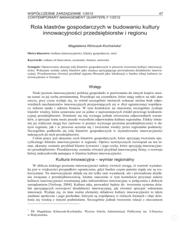 WSPÓŁCZESNE ZARZ DZANIE 1/2012 CONTEMPORARY MANAGEMENT QUARTERLY 1/2012 47 Rola klastrów gospodarczych w budowaniu kultury innowacyjno ci przedsi biorstw i regionu Magdalena Klimczuk-Kocha ska∗ Słowa kluczowe: kultura innowacyjno ci, klastry gospodarcze, sieci Keywords: culture of innovation, economic clusters, networks Synopsis: Opracowanie ukazuje rol klastrów gospodarczych w procesie tworzenia kultury innowacyjno ci. Wskazane zostały zalety klastrów jako miejsca sprzyjaj cego prowadzeniu działalno ci innowacyjnej. Przedstawiono równie przykład regionu Øresund jako lokalizacji o bardzo silnej kulturze innowacyjno ci w Europie. Wst p Niski poziom innowacyjno ci polskiej gospodarki w porównaniu do innych krajów mo na uzna za jej cech permanentn . Poszukuje si czynników, które maj wpływ na taki stan rzeczy, przy czym wydaje si , e w ród szczególnie istotnych wskaza mo na brak odpowiednich mechanizmów innowacyjnych przejawiaj cych si w zbyt ograniczonej współpracy sektora nauki i sektora biznesu. W tym kontek cie na znaczeniu szczególnie zyskuje transfer wiedzy, która uznawana jest za jedno z najwa niejszych ródeł przewagi konkurencyjnej przedsi biorstw. Dzielenie si ni wymaga jednak stworzenia odpowiednich warunków, a sprzyja temu mo e przede wszystkim odpowiednia kultura regionalna. Efekty istnienia jej widoczne mog by zarówno w postaci wy szego poziomu przedsi biorczo ci w danym regionie, jak i w procesie uczenia si i tworzenia wiedzy przez regionalne podmioty. Szczególnie podkre la si rol klastrów gospodarczych w stymulowaniu innowacyjno ci nale cych do nich przedsi biorstw. Celem pracy jest ukazanie cech klastrów gospodarczych, które sprzyjaj tworzeniu specyficznego klimatu innowacyjno ci w regionie. Oprócz teoretycznych rozwi za na ten temat, ukazany zostanie przykład klastra ywno ci i jego cechy, które sprzyjaj innowacyjnoci przedsi biorstw. Przedstawiony zostanie równie przykład innowacyjnej firmy, o rozwoju której zadecydowała panuj ca w klastrze kultura innowacyjno ci. W obliczu niskiego poziomu innowacyjno ci nale y zwróci uwag , i warto wynalazku jest w wi kszo ci przypadków ograniczona, gdy bardzo cz sto patenty nigdy nie s wykorzystane. Na innowacyjno składa si nie tylko sam wynalazek, ale i prowadzone działania zwi zane z przedsi biorczo ci . Istotne znaczenie w tym kontek cie przyzna nale y kulturze innowacyjno ci rozumianej jako infrastruktura innowacyjna w poł czeniu z dobrym zarz dzaniem [Verloop, 2004]. Kultura taka, prowadzi b dzie do tworzenia systemu działa sprzyjaj cych rozwojowi działalno ci innowacyjnej, jak równie sprzyja wdra aniu innowacji. Wydaje si , e inne wa ne elementy składowe kultury innowacyjno ci to tak e zaufanie społeczne i jego pochodne, którymi s współpraca w ró nych formach i ch dzielenia si wiedz z innymi podmiotami. Szczególnie jednak tworzenie relacji z otoczeniem - - - - Kultura innowacyjna – wymiar regionalny - ∗ Dr Magdalena Klimczuk-Kocha ska, Wy sza Szkoła Administracji Publicznej im. S.Staszica w Białymstoku. 48 M. Klimczuk-Kocha ska, Rola klastrów gospodarczych w budowaniu… M. Klimczuk-Kocha ska, The role of regional clusters in building… w postaci ró nego rodzaju sieci współpracy jest nieodzownym elementem ka dego rodowiska sprzyjaj cego innowacjom. - - - - - Istota współdziałania w sieciach Zagadnienie współdziałania podmiotów zostało dostrze one zarówno w naukach ekonomicznych, jak i w naukach o zarz dzaniu [Czakon, 2005, s.10]. W tym drugim przypadku zakłada si , e we współczesnych warunkach o przewadze strategicznej podmiotów decyduj nie cechy fizyczne produktów czy rynków, lecz zdolno do szybkiej i sprawnej reakcji na działania konkurentów. St d te pojawiaj si nowe sposoby działa pozwalaj ce na osi gni cie i utrzymanie trwałej przewagi konkurencyjnej, do których nale m.in. sie relacji zewn trznych organizacji [Kanter, 1997, cyt. za Stachowicz, Kordel, 2005]. Tworzenie relacji sieciowych mi dzy podmiotami jest specyficzn form współdziałania. Zwraca na to uwag J. Meyer-Stamer twierdz c, e w gospodarce wiatowej nie konkuruj ju mi dzy sob ani samodzielne przedsi biorstwa, ani pa stwa [Meyer-Stamer, 1996, s.1– 2]. A. Jewtuchowicz zauwa a, e konkuruj grupy przedsi biorstw zorganizowane w sieci, a ich konkurencyjno bazuje na skuteczno ci i efektywno ci o rodków przemysłowych lub g sto ci efektów zewn trznych. Polegaj one na intensywno ci współdziałania z ró nymi rodzajami podmiotów, w tym m.in.: uniwersytetami, instytucjami szkoleniowymi, sfer badawcz , systemami informacji technologicznej, konsultantami prywatnymi, firmami handlowymi, instytucjami finansowymi. Podej cie takie wymaga jednak rozwoju strategii współpracy w ramach sieci partnerów, która mo e przyczyni si do zaj cia lepszej pozycji konkurencyjnej na rynku. Przyj cie takich zało e pozwala na wypracowanie wspólnych usprawnie w ofercie rynkowej czy zdobycie wiedzy o nowych rynkach zbytu [Jewtuchowicz, 2000, s. 120]. Koncepcja współpracy w ramach sieci jest zgodna z pogl dem, e „coraz wi cej organizacji stwierdza, e ich miejsce na rynku zale y od umiej tno ci współpracy z innymi. Organizacja nie mo e dłu ej poszukiwa funkcji produkcji jedynie w wewn trznej wydajno ci, gdy obecnie jej ródło jest umiejscowione w zło onej sieci powi za gospodarczych” [Wijnhoven, 2001, s.196]. Wła ciwym kluczem do sukcesu firm jest wi c zarz dzanie i rozwój sieci współzale no ci. Budowanie personalnych zwi zków z kluczowymi interesariuszami, w których podstaw jest zaufanie, co pozwala redukowa ryzyko wynikaj ce z niepewno ci otoczenia [Jewtuchowicz, 2006, s. 17–20]. Jak zauwa ył A. Pomykalski, zarz dzanie w warunkach struktury sieciowej jest raczej zarz dzaniem biznesem, gdzie ustawicznie poszukuje si mo liwo ci korzystnej alokacji zasobów, ni zarz dzaniem przedsi biorstwem w tradycyjnym uj ciu. Oznacz to, e koncentruje si na relacjach przedsi biorstwa z otoczeniem, wymaga