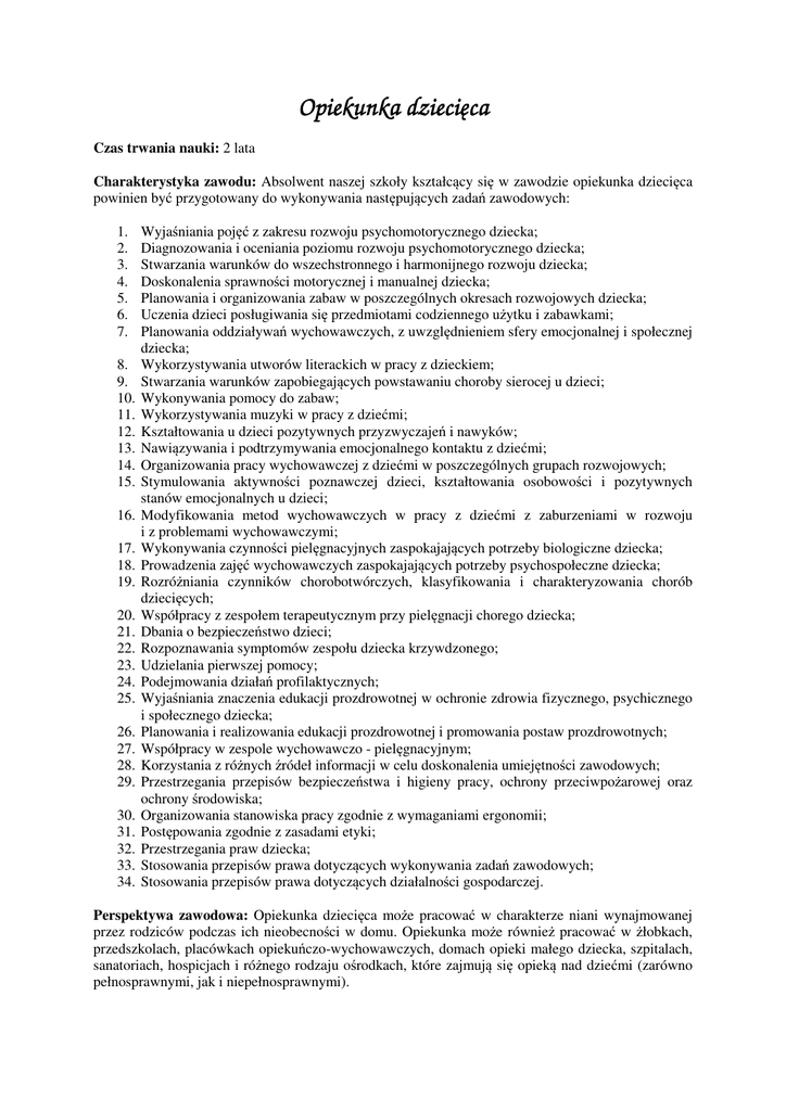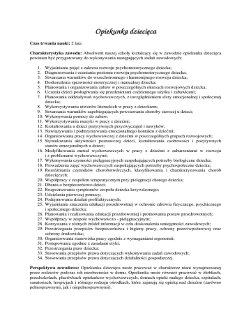 Opiekunka dziecię dziecięca Czas trwania nauki: 2 lata Charakterystyka zawodu: Absolwent naszej szkoły kształcący się w zawodzie opiekunka dziecięca powinien być przygotowany do wykonywania następujących zadań zawodowych: 1. 2. 3. 4. 5. 6. 7. 8. 9. 10. 11. 12. 13. 14. 15. 16. 17. 18. 19. 20. 21. 22. 23. 24. 25. 26. 27. 28. 29. 30. 31. 32. 33. 34. Wyjaśniania pojęć z zakresu rozwoju psychomotorycznego dziecka; Diagnozowania i oceniania poziomu rozwoju psychomotorycznego dziecka; Stwarzania warunków do wszechstronnego i harmonijnego rozwoju dziecka; Doskonalenia sprawności motorycznej i manualnej dziecka; Planowania i organizowania zabaw w poszczególnych okresach rozwojowych dziecka; Uczenia dzieci posługiwania się przedmiotami codziennego użytku i zabawkami; Planowania oddziaływań wychowawczych, z uwzględnieniem sfery emocjonalnej i społecznej dziecka; Wykorzystywania utworów literackich w pracy z dzieckiem; Stwarzania warunków zapobiegających powstawaniu choroby sierocej u dzieci; Wykonywania pomocy do zabaw; Wykorzystywania muzyki w pracy z dziećmi; Kształtowania u dzieci pozytywnych przyzwyczajeń i nawyków; Nawiązywania i podtrzymywania emocjonalnego kontaktu z dziećmi; Organizowania pracy wychowawczej z dziećmi w poszczególnych grupach rozwojowych; Stymulowania aktywności poznawczej dzieci, kształtowania osobowości i pozytywnych stanów emocjonalnych u dzieci; Modyfikowania metod wychowawczych w pracy z dziećmi z zaburzeniami w rozwoju i z problemami wychowawczymi; Wykonywania czynności pielęgnacyjnych zaspokajających potrzeby biologiczne dziecka; Prowadzenia zajęć wychowawczych zaspokajających potrzeby psychospołeczne dziecka; Rozróżniania czynników chorobotwórczych, klasyfikowania i charakteryzowania chorób dziecięcych; Współpracy z zespołem terapeutycznym przy pielęgnacji chorego dziecka; Dbania o bezpieczeństwo dzieci; Rozpoznawania symptomów zespołu dziecka krzywdzonego; Udzielania pierwszej pomocy; Podejmowania działań profilaktycznych; Wyjaśniania znaczenia edukacji prozdrowotnej w ochronie zdrowia fizycznego, psychicznego i społecznego dziecka; Planowania i realizowania edukacji prozdrowotnej i promowania postaw prozdrowotnych; Współpracy w zespole wychowawczo - pielęgnacyjnym; Korzystania z różnych źródeł informacji w celu doskonalenia umiejętności zawodowych; Przestrzegania przepisów bezpieczeństwa i higieny pracy, ochrony przeciwpożarowej oraz ochrony środowiska; Organizowania stanowiska pracy zgodnie z wymaganiami ergonomii; Postępowania zgodnie z zasadami etyki; Przestrzegania praw dziecka; Stosowania przepisów prawa dotyczących wykonywania zadań zawodowych; Stosowania przepisów prawa dotyczących działalności gospodarczej. Perspektywa zawodowa: Opiekunka dziecięca może pracować w charakterze niani wynajmowanej przez rodziców podczas ich nieobecności w domu. Opiekunka może również pracować w żłobkach, przedszkolach, placówkach opiekuńczo-wychowawczych, domach opieki małego dziecka, szpitalach, sanatoriach, hospicjach i różnego rodzaju ośrodkach, które zajmują się opieką nad dziećmi (zarówno pełnosprawnymi, jak i niepełnosprawnymi).