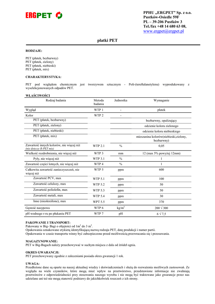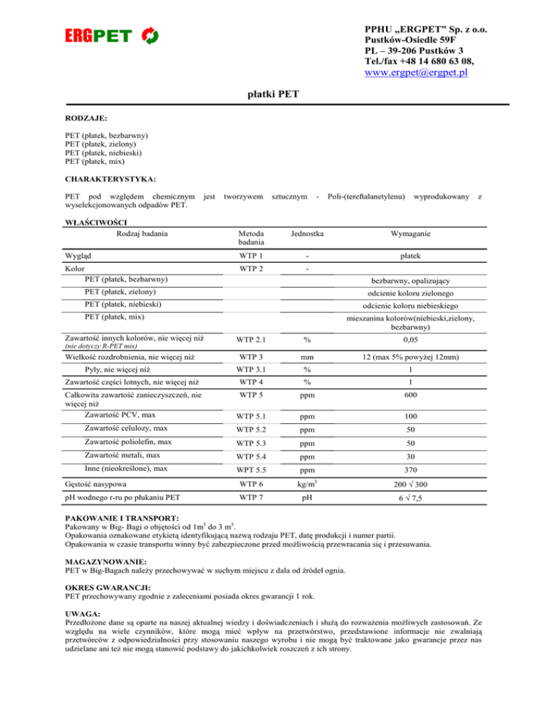 PPHU „ERGPET” Sp. z o.o. Pustków-Osiedle 59F PL – 39-206 Pustków 3 Tel./fax +48 14 680 63 08, ERGPET [email protected] płatki PET RODZAJE: PET (płatek, bezbarwny) PET (płatek, zielony) PET (płatek, niebieski) PET (płatek, mix) CHARAKTERYSTYKA: PET pod względem chemicznym wyselekcjonowanych odpadów PET. jest WŁAŚCIWOŚCI Rodzaj badania tworzywem sztucznym - Poli-(tereftalanetylenu) wyprodukowany Metoda badania Jednostka Wymaganie Wygląd WTP 1 - płatek Kolor WTP 2 - PET (płatek, bezbarwny) bezbarwny, opalizujący PET (płatek, zielony) odcienie koloru zielonego PET (płatek, niebieski) odcienie koloru niebieskiego PET (płatek, mix) Zawartość innych kolorów, nie więcej niż mieszanina kolorów(niebieski,zielony, bezbarwny) WTP 2.1 % 0,05 WTP 3 mm 12 (max 5% powyżej 12mm) WTP 3.1 % 1 Zawartość części lotnych, nie więcej niż WTP 4 % 1 Całkowita zawartość zanieczyszczeń, nie więcej niż Zawartość PCV, max WTP 5 ppm 600 WTP 5.1 ppm 100 Zawartość celulozy, max WTP 5.2 ppm 50 Zawartość poliolefin, max WTP 5.3 ppm 50 Zawartość metali, max WTP 5.4 ppm 30 Inne (nieokreślone), max WPT 5.5 ppm 370 (nie dotyczy R-PET mix) Wielkość rozdrobnienia, nie więcej niż Pyły, nie więcej niż z Gęstość nasypowa WTP 6 kg/m 200 ÷ 300 pH wodnego r-ru po płukaniu PET WTP 7 pH 6 ÷ 7,5 3 PAKOWANIE I TRANSPORT: Pakowany w Big- Bagi o objętości od 1m3 do 3 m3. Opakowania oznakowane etykietą identyfikującą nazwą rodzaju PET, datę produkcji i numer partii. Opakowania w czasie transportu winny być zabezpieczone przed możliwością przewracania się i przesuwania. MAGAZYNOWANIE: PET w Big-Bagach należy przechowywać w suchym miejscu z dala od źródeł ognia. OKRES GWARANCJI: PET przechowywany zgodnie z zaleceniami posiada okres gwarancji 1 rok. UWAGA: Przedłożone dane są oparte na naszej aktualnej wiedzy i doświadczeniach i służą do rozważenia możliwych zastosowań. Ze względu na wiele czynników, które mogą mieć wpływ na przetwórstwo, przedstawione informacje nie zwalniają przetwórców z odpowiedzialności przy stosowaniu naszego wyrobu i nie mogą być traktowane jako gwarancje przez nas udzielane ani też nie mogą stanowić podstawy do jakichkolwiek roszczeń z ich strony.