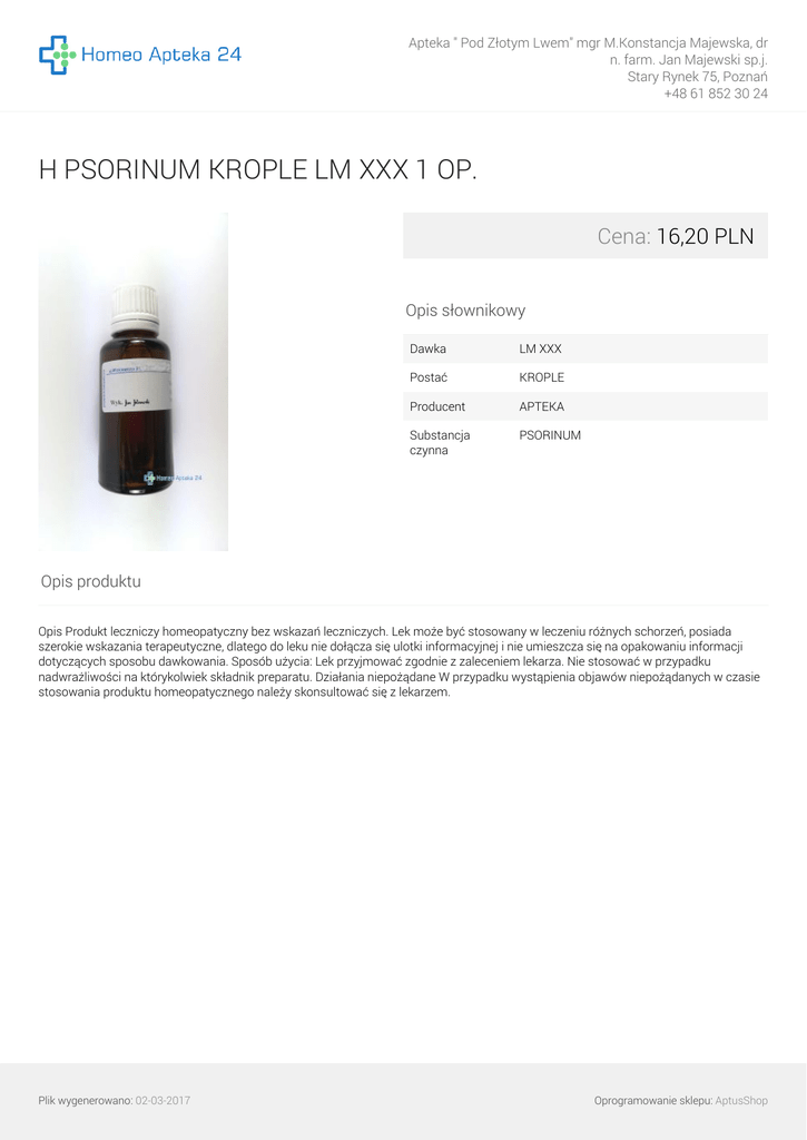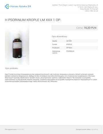 Apteka " Pod Złotym Lwem" mgr M.Konstancja Majewska, dr n. farm. Jan Majewski sp.j. Stary Rynek 75, Poznań +48 61 852 30 24 H PSORINUM KROPLE LM XXX 1 OP. Cena: 16,20 PLN Opis słownikowy Dawka LM XXX Postać KROPLE Producent APTEKA Substancja czynna PSORINUM Opis produktu Opis Produkt leczniczy homeopatyczny bez wskazań leczniczych. Lek może być stosowany w leczeniu różnych schorzeń, posiada szerokie wskazania terapeutyczne, dlatego do leku nie dołącza się ulotki informacyjnej i nie umieszcza się na opakowaniu informacji dotyczących sposobu dawkowania. Sposób użycia: Lek przyjmować zgodnie z zaleceniem lekarza. Nie stosować w przypadku nadwrażliwości na którykolwiek składnik preparatu. Działania niepożądane W przypadku wystąpienia objawów niepożądanych w czasie stosowania produktu homeopatycznego należy skonsultować się z lekarzem. Plik wygenerowano: 02-03-2017 Powered by TCPDF (www.tcpdf.org) Oprogramowanie sklepu: AptusShop