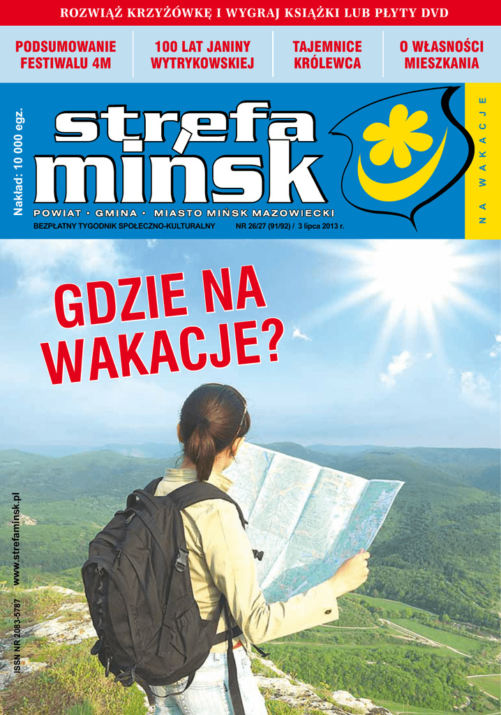 rozwiąż krzyżówkę i wygraj książki lub płyty dvd 100 lat Janiny wytrykowskiej tajemnice królewca NR 26/27 (91/92) / 3 lipca 2013 r. www.strefaminsk.pl a n e i z gd ? e j c waka na Nakład: 10 000 egz. BEZPŁATNY TYGODNIK SPOŁECZNO-KULTURALNY ISSN NR 2083-5787 o własności mieszkania W A K A C J E podsumowanie festiwalu 4m R e k l a m a WAKACYJNA będzie się ukazywać co dwa tygodnie Wakacyjny terminarz wydań Tygodnika: - 3 lipca - 17 lipca - 31 lipca - 14 sierpnia - 28 sierpnia Strefa naczelnego strefy numeru Ludzie bardziej cenią swoje mniemania niż rzeczywistość. Strefa informacji str. 4 Strefa seniorów str. 9 Nie przegap – kalendarz imprez Monteskiusz 100 lat Janiny Wytrykowskiej Lipiec, wakacje i coraz bliżej do realizacji marzeń o letnim wypoczynku. Podpytaliśmy mińszczan i mieszkańców powiatu w różnym wieku o ich wakacyjne plany. Co niektórym szykują się podróże marzeń. Ale nie wszyscy wyruszą na podbój Polski i świata. „Ja na wakacje? Ja cały czas pracuję!” – powiedziała nam Małgosia z Targówki. „Nigdzie nie wyjeżdżam, bo za mało zarabiam. Chyba że trafię kumulację w Lotto, to wtedy na pewno ruszymy w świat” – dodaje Jarek z Barczącej. Za nami III Festiwal 4M – Mińsk Mazowiecki Miasto Muzyki. Przez trzy dni mogliśmy podziwiać na scenie zarówno mińskich wykonawców, jak i gwiazdy. Na występ Grzegorza Turnaua przyszli młodzi i starsi, bo koncerty krakowskiego artysty to magia. Z kolei Brodka dała energetyczny show, który oglądało prawie 5 tys. osób. Zapraszam do przeczytania relacji i obejrzenia zdjęć z tego wydarzenia. Strefa obyczajów str. 10 Strefa wydarzenie str. 12 Strefa historii str. 14 Prezentacja w Strefie str. 16 Strefa nieruchomości str. 17 Strefa flesz str. 18 Strefa rozrywki str. 20 Nasza sonda: gdzie na wakacje wybierają się mińszczanie i mieszkańcy powiatu? Relacja z Festiwalu 4M – Mińsk Mazowiecki Miasto Muzyki Tajemnice Królewca, wsi położonej niedaleko Mińska Zakupy w sklepie „za rogiem” 4 lipca w Miejskim Domu Kultury rusza akcja „Parkuj z książką”. Zainauguruje ją spotkanie z Małgorzatą Kalicińską. A potem, przez całe wakacje mińszczanie i goście odwiedzający nasze miasto będą mogli zaszyć się w miejskim parku z książką i się zaczytać. MDK rozpoczyna jeszcze jeden letni projekt – „Mińskie granie, czyli muzyka na podwieczorek”. To cykl koncertów w amfiteatrze, które odbywać się będą w każdą wakacyjną niedzielę o godz. 16. A publiczność zetknie się z muzyką różnego gatunku, począwszy od bluesa, przez fortepianowe brzmienia, skończywszy na muzyce klasycznej. W „Strefie historii” opisujemy tajemnice Królewca, wsi położonej niedaleko Mińska. Gorąco polecam ten tekst. Podobnie jak porady Urszuli Radło, która w na naszych łamach będzie wyjaśniała wszystkie wątpliwości związane z nieruchomościami. Urszula Radło o skomplikowanej własności mieszkania Fotorelacje z miejskich imprez: Dzień Patrona Miasta, III Turniej Rycerski Jana z Gościańczyc i XVII Rally Mińsk Mazowiecki I na koniec chciałbym przypomnieć, że podobnie jak w ubiegłym roku, w lipcu i w sierpniu „Strefa Mińsk” będzie się ukazywała co dwa tygodnie – po prostu „Strefa Mińsk na wakacje”. Wakacyjne gadżety i uśmiechnij się :) Wszystkiego dobrego i miłej lektury :) Dziękujemy, że jesteście z nami. Ogłoszenia drobne str. 22 Dariusz Mieczysław Mól, redaktor naczelny tygodnika „Strefa Mińsk” Krzyżówka str. 23 Dedykacje okolicznościowe str. 21 R e k l a m a KOLEKTORY SŁONECZNE TAŃSZE O 70 % PIECE Z DOFINANSOWANIEM OGNIWA FOTOWOLTAICZNE tel. 513 009 105 Najniższe ceny w Polsce! Załatwiamy wszelkie formalności! SZYBKA GOTÓWKA ! DO 20 000 NA OŚWIADCZENIE O DOCHODACH ! tel. 25 758 38 04, 508 391 880 ul. Tartaczna 11 Mińsk Maz. 3 Strefa informacji „Parkuj z książką” Miejski Dom Kultury w Mińsku wraz z początkiem wakacji inauguruje akcję „Parkuj z książką”. W parku miejskim, przy tarasie oraz przy placu zabaw ustawione zostaną regały z książkami. Każdy gość będzie mógł sięgnąć po jedną z nich, zabrać ze sobą na czas spaceru, zaszyć się w parkowych alejkach i zagłębić w lekturze. Akcja rozpocznie się w czwartek, 4 lipca o godz. 19. Gościem specjalnym inauguracji akcji będzie Małgorzata Kalicińska, autorka bestsellerowej serii „Nad rozlewiskiem”. Fragmenty prozy autorki przeczyta Joanna Dukaczewska, aktorka i lektorka, jeden z najciekawszych głosów radiowych w Polsce. „Mamy nadzieję, że nasz księgozbiór umili odwiedzającym pobyt w parku. Zachęcamy do swobodnego korzystania z umieszczonych na regale książek, wędrowania z nimi po parku, pogrążania się w lekturze. Po zakończeniu czytania prosimy o odstawienie tomu na półkę, tak aby kolejni parkujący mieli możliwość skorzystania z zaparkowanych książek. Mamy nadzieję, że akcja zyska stałych uczestników, a może nawet cichych współtwórców, którzy będą przynosili i stawiali na regale własne, przeczytane już książki. Zachęcamy rodziców i dzieci do włączenia się do akcji. Regał przy placu zabaw ustawiony będzie z myślą o literaturze dla najmłodszych czytelników” – wyjaśniają organizatorzy akcji „Parkuj z książką”, która potrwa do 1 września. Partnerami przedsięwzięcia są Miejska Biblioteka Publiczna w Mińsku, Burmistrz Miasta Mińsk Mazowiecki i tygodnik „Strefa Mińsk”. Oprac. na podst. mat. organizatorów Miasto w kwiatach Rzucają się w oczy, bo zwisają kaskadami z latarni, tworzą kolorowe kompozycje na klombach, albo zachwycają wyglądem w wazach ustawionych na placach i skwerach. Mowa o kwiatach, które dodają kolorytu stolicy powiatu. Na zlecenie Urzędu Miasta dokonano nasadzeń kwiatów, m.in. na placach Stary Rynek, Kilińskiego, Dworcowym, Lotników Polskich, w pasie ulic Konstytucji 3 Maja, Kazikowskiego i Piłsudskiego. Na kwietnikach 