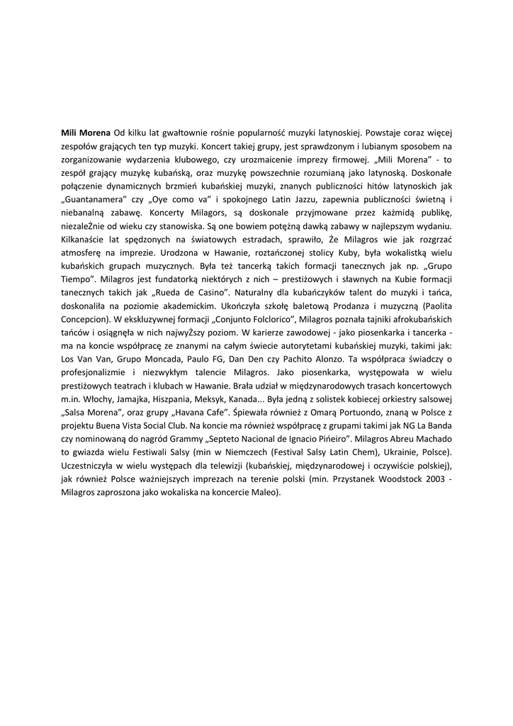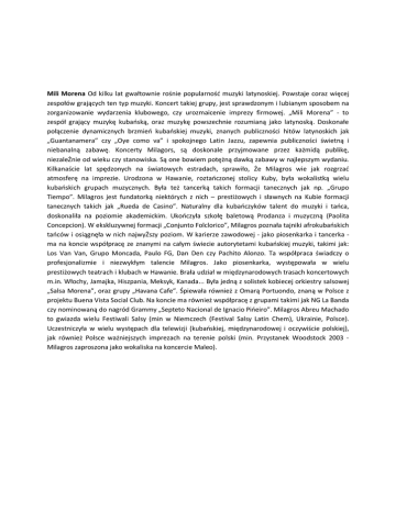 Mili Morena Od kilku lat gwałtownie rośnie popularność muzyki latynoskiej. Powstaje coraz więcej zespołów grających ten typ muzyki. Koncert takiej grupy, jest sprawdzonym i lubianym sposobem na zorganizowanie wydarzenia klubowego, czy urozmaicenie imprezy firmowej. „Mili Morena” - to zespół grający muzykę kubańską, oraz muzykę powszechnie rozumianą jako latynoską. Doskonałe połączenie dynamicznych brzmień kubańskiej muzyki, znanych publiczności hitów latynoskich jak „Guantanamera” czy „Oye como va” i spokojnego Latin Jazzu, zapewnia publiczności świetną i niebanalną zabawę. Koncerty Milagors, są doskonale przyjmowane przez każmidą publikę, niezaleŻnie od wieku czy stanowiska. Są one bowiem potężną dawką zabawy w najlepszym wydaniu. Kilkanaście lat spędzonych na światowych estradach, sprawiło, Że Milagros wie jak rozgrzać atmosferę na imprezie. Urodzona w Hawanie, roztańczonej stolicy Kuby, była wokalistką wielu kubańskich grupach muzycznych. Była też tancerką takich formacji tanecznych jak np. „Grupo Tiempo”. Milagros jest fundatorką niektórych z nich – prestiżowych i sławnych na Kubie formacji tanecznych takich jak „Rueda de Casino”. Naturalny dla kubańczyków talent do muzyki i tańca, doskonaliła na poziomie akademickim. Ukończyła szkołę baletową Prodanza i muzyczną (Paolita Concepcion). W ekskluzywnej formacji „Conjunto Folclorico”, Milagros poznała tajniki afrokubańskich tańców i osiągnęła w nich najwyŻszy poziom. W karierze zawodowej - jako piosenkarka i tancerka ma na koncie współpracę ze znanymi na całym świecie autorytetami kubańskiej muzyki, takimi jak: Los Van Van, Grupo Moncada, Paulo FG, Dan Den czy Pachito Alonzo. Ta współpraca świadczy o profesjonalizmie i niezwykłym talencie Milagros. Jako piosenkarka, występowała w wielu prestiżowych teatrach i klubach w Hawanie. Brała udział w międzynarodowych trasach koncertowych m.in. Włochy, Jamajka, Hiszpania, Meksyk, Kanada... Była jedną z solistek kobiecej orkiestry salsowej „Salsa Morena”, oraz grupy „Havana Cafe”. Śpiewała również z Omarą Portuondo, znaną w Polsce z projektu Buena Vista Social Club. Na koncie ma również współpracę z grupami takimi jak NG La Banda czy nominowaną do nagród Grammy „Septeto Nacional de Ignacio Pińeiro”. Milagros Abreu Machado to gwiazda wielu Festiwali Salsy (min w Niemczech (Festival Salsy Latin Chem), Ukrainie, Polsce). Uczestniczyła w wielu występach dla telewizji (kubańskiej, międzynarodowej i oczywiście polskiej), jak również Polsce ważniejszych imprezach na terenie polski (min. Przystanek Woodstock 2003 Milagros zaproszona jako wokaliska na koncercie Maleo).