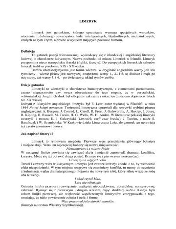 LIMERYK Limeryk jest gatunkiem, którego uprawianie wymaga specjalnych warunków, otoczenia i dobranego towarzystwa ludzi inteligentnych, błyskotliwych, nietuzinkowych, czułych na rym i rytm, a przede wszystkim mających poczucie humoru. Definicja To gatunek poezji wierszowanej, wywodzący się z irlandzkiej i angielskiej literatury ludowej, o charakterze ludycznym. Nazwa pochodzi od miasta Limerick w Irlandii. Limeryk przypomina nieco staropolskie fraszki (figliki, facecje). Do europejskich literackich salonów limeryk trafił na przełomie XIX i XX wieku. Bardzo charakterystyczna jest forma wiersza, w oryginale angielskim ważny jest tok rytmiczny – wiersz pisany jest zazwyczaj anapestem, wersy 1., 2., i 5. są dłuższe i mają po trzy stopy, zaś wersy 3. i 4. – po dwie stopy; układ rymów aabba. Dzieje gatunku Limeryki to wierszyki o charakterze humorystycznym, z elementami purnonsensu, często nieprzyzwoite czy wręcz obsceniczne do tego stopnia, że w purytańskiej, wiktoriańskiej Anglii ich druk był oficjalnie zakazany (zakaz ten zniesiono dopiero w latach 60. XX wieku). Jednym z klasyków angielskiego limeryku był E. Lear, autor wydanej w Filadelfii w roku 1864 Nowej księgi nonsensu. Twórczość limeryczną uprawiali dla rozrywki wybitni pisarze anglojęzyczni: A. Burgess, J. Conrad, L. Caroll, R. Frost, J. Galsworthy, A. Huxley, J. Joyce, R. Kipling, B. Russell, M. Twain, H. G. Wells, W. H. Auden. W literaturze polskiej limeryki tworzyli i tworzą: K. I. Gałczyński (Limerick, czyli czar bredni), J. Tuwim, a także S. Barańczak i W. Szymborska. W Krakowie działa Limeryczna Loża, ale gatunek ten uprawiają też często anonimowi twórcy. Jak napisać limeryk? Limeryk to rymowana anegdota. Pierwszy wers przedstawia głównego bohatera i miejsce akcji. Wers ten najczęściej kończy się nazwą miejscowości. Płetwonurkowi z miasta Pekin W następnej linijce powinna się zawiązać akcja i pojawić zapowiedź dramatu, konfliktu, kryzysu. Może się też objawić druga postać. Rymuje się z pierwszym wersem (aa). Urodę życia odgryzł rekin. Trzeci i czwarty wers w klasycznym limeryku jest zawsze krótszy; chodzi o to, by wzmocnić efekt niespodzianki. W tym miejscu rozgrywa się zasadniczy konflikt, tu mamy do czynienia z kulminacją wątku dramaturgicznego. Pojawia się nowy rym (bb), który silnie wiąże ze sobą oba te wersy. I choć czytał Mao, Lecz nie odrastało Ostatnia linijka przynosi rozwiązanie, najlepiej nieoczekiwane, absurdalne, nonsensowne, zabawne. Rymuje się z pierwszym i drugim wersem, dając strukturę aabba. Kiedyś była echem linijki pierwszej, ale większość współczesnych limerystów zrezygnowała z tego, uważając, że takie powtórzenie zubaża i treść, i formę. Więc pracował jako damski manekin. (limeryk autorstwa Wisławy Szymborskiej). Przykłady limeryków * * * Pewien redaktor w Bielsku – Biała Książkę swą pisał rok bez mała I choć ją pieścił i wycackał Ciosem dobito go znienacka Gdy korektorka rzekła : „chała”. tekst anonimowy zamieszczony w: Marek Biernacki, Marta Pawlus, Słownik gatunków literackich, Wyd. Park, Bielsko – Biała 1999. Limeryki o narodach Był Anglik co przyjaźń nawiązał z Hindusem Z najczystszej sympatii, a nie pod przymusem. Do dzisiaj by trwała Ta przyjaźń wspaniała, Lecz Hindus nieświeży dał mu ser. Pretensje mieć trudno do tego Anglika, Gdy druh w narodowej go dumie dotyka. Więc wzgardził pariasem I przyjaźń swą z czasem Położył u stóp - Irlandczyka. (...) Jacek Kaczmarski Limeryki o narodach 1987 Opracowano na podstawie: 1. Marek Biernacki, Marta Pawlus, Słownik gatunków literackich, Wyd. Park, Bielsko – Biała 1999. 2. Anna Bikont, Joanna Szczęsna Żyje sobie limeryk w Krakowie; Magazyn Gazety Wyborczej 1997. 3. http://www.kaczmarski.art.pl/tworczosc/wiersze_alfabetycznie/kaczmarskiego/l/limeryki. php mgr Barbara Garsztka