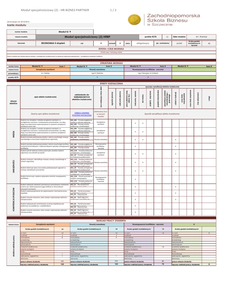 Moduł specjalnościowy (2) - HR BIZNES PARTNER 1/2 obowiązuje od: 2015/2016 karta modułu Moduł E/ 9 numer modułu Moduł specjalnościowy (2) HRBP nazwa modułu EKONOMIA II stopień kierunek II rok punkty ECTS 3 semestr obligatoryjny status 13 lider modułu polski jęz. wykładowy dr I. Rafaląt liczba godzin kontaktowych łącznie 42 ISTOTA I CELE MODUŁU Krótki opis i katalog celów Celem modułu jest doskonalenie wiedzy i umiejętności praktycznych w obszarze wybranej specjalności - zarządzania zasobami ludzkimi. STRUKTURA MODUŁU Moduł E/ 9 numer kursu kurs 1 kurs 2 Moduł E/ 9 Moduł E/ 9 kurs 3 nazwa kursu Zarządzanie wynikami Rozwój zawodowy Rozwiązywanie konfliktów - warsztat prowadzący dr I. Rafaląt mgr B. Dobińska mgr E.Świergiel, dr A.Olejnik punkty ECTS 5 5 3 Moduł E/ 9 kurs 4 WIEDZA Student zna narzędzia i metody zarządzania wynikami, w szczególności oceniania i motywowania pracowników; zna ideę, etapy oraz dokumenty wykorzystywane w systemie zarządzania wynikami/ przez cele. Student zna narzędzia i metody zarządzania wynikami, w szczególności oceniania i motywowania pracowników; zna ideę, etapy oraz dokumenty wykorzystywane w systemie zarządzania wynikami/ przez cele. Student posiada podstawową wiedzę z zakresu psychologii rozwoju zawodowego w warunkach współczesnej organizacji. KOMPETENCJE SPOŁECZNE UMIEJĘTNOŚCI Student posiada podstawową wiedzę z zakresu psychologii konfliktu, rozróżnia konstruktywne i niekonstruktywne sposoby rozwiązywania konfliktów. Student potrafi dokonać analizy potencjału zasobów ludzkich organizacji oraz określić jej wyniki. Student analizuje i identyfikuje motywy rozwoju zawodowego w ramach organizacji. KE2_W8 Posiada pogłębioną wiedzę w zakresie wybranej specjalności, zna narzędzia KE2_W9 Posiada wiedzę i praktyczną, umożliwiającą podjęcie pracy zawodowej lub KE2_W8 Posiada pogłębioną wiedzę w zakresie wybranej specjalności, zna narzędzia KE2_W9 Posiada wiedzę i praktyczną, umożliwiającą podjęcie pracy zawodowej KE2_W9 Posiada wiedzę lub praktyczną, umożliwiającą KE2_W8 Posiada pogłębioną wiedzę w zakresie wybranej KE2_W9 Posiada wiedzę praktyczną, umożliwiającą KE2_U12 Posiada praktyczne umiejętności, umożliwiające podjęcie pracy zawodowej w KE2_U9 Posiada umiejętność formułowania praktycznych wniosków użytecznych dla KE2_U12 Posiada praktyczne umiejętności, umożliwiające podjęcie pracy zawodowej w KE2_U9 Posiada umiejętność Student dokonuje opisu oraz analizy podstawowych zagrożeń w rozwoju zawodowym pracownika. formułowania praktycznych KE2_U9 Posiada umiejętność formułowania praktycznych wniosków użytecznych dla KE2_U12 Posiada praktyczne Student konstruuje i wybiera optymalne techniki rozwiązywania konfliktów. umiejętności, umożliwiające podjęcie pracy zawodowej ww KE2_U10 Potrafi pracować zespole rozwiązującym konkretne zadania z zakresu KE2_U12 Posiada praktyczne Student wykazuje ciekawość poznawczą w poszukiwaniu możliwości uczenia się i wykorzystywania jego efektów w różnorodnych sytuacjach życiowych. Student wykazuje gotowość do organizowania i kierowania pracą zespołów. Student rozumie znaczenie, stale rozwija i wykorzystuje zdolności interpersonalne. Student wykazuje jest zorientowany na pracę zespołową oraz podejmuje się współpracy i współdziałania. Student rozumie znaczenie, stale rozwija i wykorzystuje zdolności interpersonalne. uwagi inne aktywności case study zespołowo case study indywidualnie udział w dyskusji prezentacja zadania indywidualnego / grupowego projekty indywidualne projekty zespołowe test wiedzy Adekwatny kurs w ramach modułu ćwiczenia, zadania ZOBACZ LEGENDĘ EFEKTÓW KSZTAŁCENIA praca pisemna (esej, referat, itp.) Zwarty opis efektu kształcenia obszar efektów zaliczenie pisemne odniesienie do KIERUNKOWYCH efektów kształcenia sposoby weryfikacji efektów kształcenia egzamin pisemny opis efektu kształcenia kurs realizujący dany efekt EFEKTY KSZTAŁCENIA Sposób weryfikacji efektu kształcenia Zarządzanie wynikami x x Zarządzanie wynikami x x Rozwój zawodowy x x Rozwiązywanie konfliktów warsztat x Zarządzanie wynikami x x x Rozwój zawodowy x x x Rozwój zawodowy x x x Rozwiązywanie konfliktów warsztat x umiejętności, umożliwiające KE2_K1 Ma świadomość poziomu swojej wiedzy, KE2_K4 Potrafi pracować i współdziałać w grupie, KE2_K5 Reprezentuje postawę przedsiębiorczą i KE2_K3 Myśli logicznie i analitycznie, jest zdolny do KE2_K4 Potrafi pracować i współdziałać w grupie, KE2_K5 Reprezentuje postawę przedsiębiorczą i KE2_K3 Myśli logicznie i analitycznie, jest zdolny do KE2_K5 Reprezentuje postawę przedsiębiorczą i x x x x x x x x x x NAKŁAD PRACY STUDENTA nazwa kursu Zarządzanie wynikami struktura nakładu pracy liczba godzin kontaktowych w tym: wykład ćwiczenia e-learning laboratorium seminarium warsztat praktyczny wizyta studyjna inne… konsultacje zaliczenia, egzaminy Rozwój zawodowy 14 14 4 8 1 1 lektoraty liczba godzin kontaktowych w tym: wykład ćwiczenia e-learning laboratorium seminarium warsztat praktyczny wizyta studyjna inne… konsultacje zaliczenia, egzaminy Rozwiązywanie konfliktów - warsztat 14 14 4 9 1 lektoraty liczba godzin kontaktowych w tym: wykład ćwiczenia e-learning laboratorium seminarium warsztat praktyczny wizyta studyjna inne… konsultacje zaliczenia, egzaminy 14 14 14 lektoraty 0 liczba godzin kontaktowych w tym: wykład ćwiczenia e-learning laboratorium seminarium warsztat praktyczny wizyta studyjna inne… konsultacje zaliczenia, egzaminy 0 lektoraty praca własna studenta 111 praca własna studenta 111 praca własna studenta 61 praca własna studenta łączny nakład pracy studenta 125 łączny nakład pracy studenta 125 łączny nakład pracy studenta 75 łączny nakład pracy studenta 0 Moduł specjalnościowy (2) - HR BIZNES PARTNER nazwa kursu Zarządzanie wynikami 2/2 Rozw