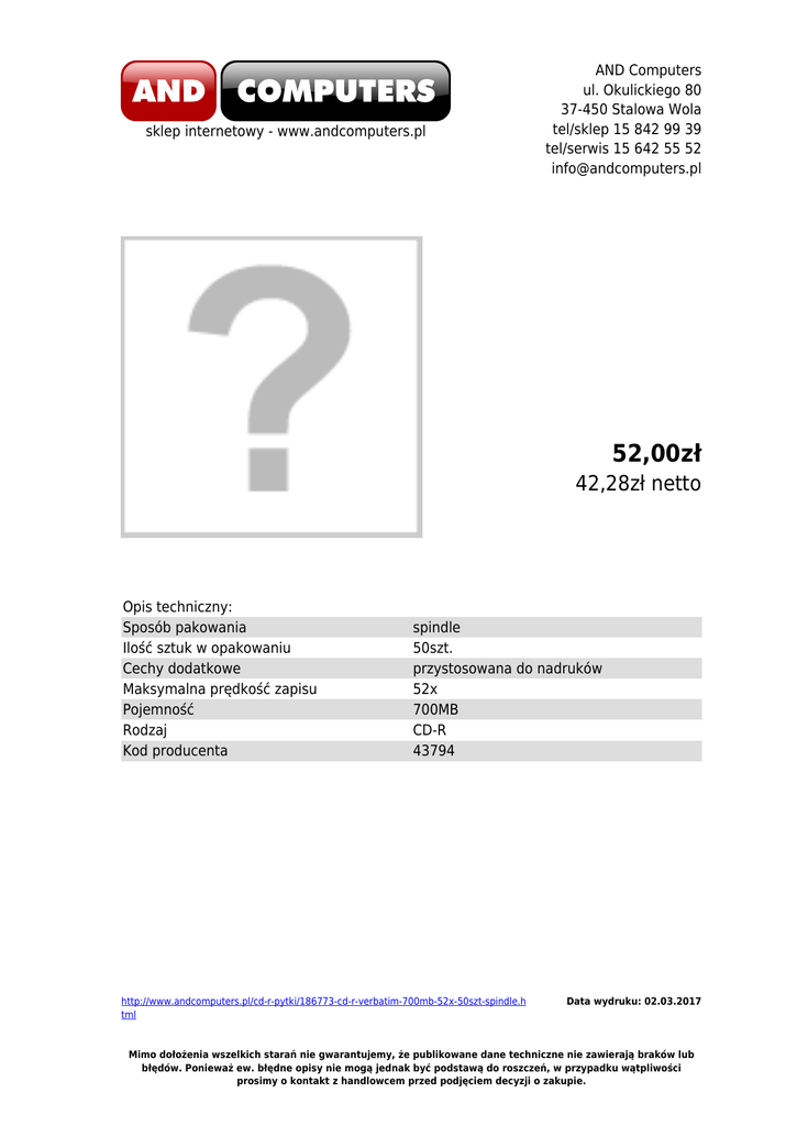 AND Computers -CD-R Verbatim 700MB 52x 50szt. spindle