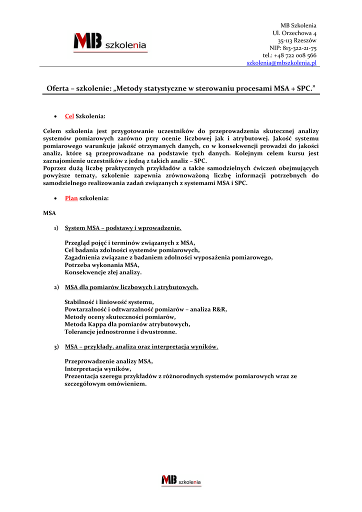 MB Szkolenia Ul. Orzechowa 4 35-113 Rzeszów NIP: 813-322-21-75 tel.: +48 722 008 566 [email protected] Oferta – szkolenie: „Metody statystyczne w sterowaniu procesami MSA + SPC.” Cel Szkolenia: Celem szkolenia jest przygotowanie uczestników do przeprowadzenia skutecznej analizy systemów pomiarowych zarówno przy ocenie liczbowej jak i atrybutowej. Jakość systemu pomiarowego warunkuje jakość otrzymanych danych, co w konsekwencji prowadzi do jakości analiz, które są przeprowadzane na podstawie tych danych. Kolejnym celem kursu jest zaznajomienie uczestników z jedną z takich analiz – SPC. Poprzez dużą liczbę praktycznych przykładów a także samodzielnych ćwiczeń obejmujących powyższe tematy, szkolenie zapewnia zrównoważoną liczbę informacji potrzebnych do samodzielnego realizowania zadań związanych z systemami MSA i SPC. Plan szkolenia: MSA 1) System MSA – podstawy i wprowadzenie. Przegląd pojęć i terminów związanych z MSA, Cel badania zdolności systemów pomiarowych, Zagadnienia związane z badaniem zdolności wyposażenia pomiarowego, Potrzeba wykonania MSA, Konsekwencje złej analizy. 2) MSA dla pomiarów liczbowych i atrybutowych. Stabilność i liniowość systemu, Powtarzalność i odtwarzalność pomiarów – analiza R&R, Metody oceny skuteczności pomiarów, Metoda Kappa dla pomiarów atrybutowych, Tolerancje jednostronne i dwustronne. 3) MSA – przykłady, analiza oraz interpretacja wyników. Przeprowadzenie analizy MSA, Interpretacja wyników, Prezentacja szeregu przykładów z różnorodnych systemów pomiarowych wraz ze szczegółowym omówieniem. MB Szkolenia Ul. Orzechowa 4 35-113 Rzeszów NIP: 813-322-21-75 tel.: +48 722 008 566 [email protected] SPC 1) System SPC – podstawy i wprowadzenie. Potrzeba i rola sytemu SPC w nowoczesnym systemie zarządzania jakością. Korzyści z wprowadzenia / stosowania SPC. 2) Wprowadzenie do statystyki. Omówienie podstawowych zagadnień ze statystyki, Rodzaje i źródła zmienności, Rozkład normalny – istota, przykłady, badanie rozkładu. 3) Metody monitorowania oraz zbierania danych. Zasady doboru kart w zależności od charakteru procesu produkcyjnego, Karty kontrolne dla danych mierzalnych, Karty kontrolne dla danych atrybutowych. 4) Obliczanie zdolności jakościowej procesu Oceny zdolności jakościowej procesów, Sposoby obliczania oraz analiza współczynników Cp, Cpk, Pp, Ppk. Interpretacja wyników zdolności jakościowej. Cena za udział w szkoleniu wynosi 1300 PLN netto (1599 PLN brutto). Podana cena zawiera: zakwaterowanie (2 noce), pełne wyżywienie, usługę szkoleniową, materiały szkoleniowe, przerwy kawowe. Dla Państwa przygotowane zostały materiały szkoleniowe. Materiały zredagowane są w taki sposób, aby po zakończeniu kursu można było w nie łatwo „zaglądnąć” i odszukać potrzebne informacje. Prowadzący: Mgr inż. MBA, certyfikowany audytor systemów PN-EN ISO 9001:2001, posiadający również certyfikat asystenta zarządzania środowiskowego wg normy ISO14001. Praktyk, trener z zakresu stosowania i wdrażania SPC. Od kilku lat związany z działem konstrukcyjnym, gdzie aktywnie wspiera dostawców krajowych jak i zagranicznych w kierunku systemów SPC i MSA. Szkolenie skierowane jest do personelu związanego z zarządzaniem i zapewnieniem jakości (kontrolerzy, inżynierowie zapewnienia jakości, inżynierowie jakości dostawców), ale także dla szeroko pojętej kadry inżynierskiej (konstruktorzy, technolodzy, analitycy produkcji) oraz kadry zarządzającej. Na szkolenie zapraszamy Państwa do czterogwiazdkowego pensjonatu Gaborek mieszczącego się w Krynicy – Zdroju, przy ulicy Szkolnej 7.