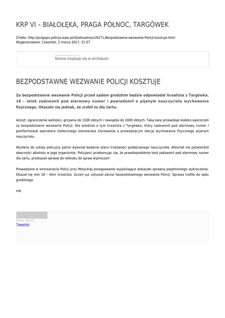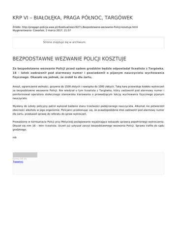 KRP VI – BIAŁOŁĘKA, PRAGA PÓŁNOC, TARGÓWEK Źródło: http://pragapn.policja.waw.pl/r6/aktualnosci/9271,Bezpodstawne-wezwanie-Policji-kosztuje.html Wygenerowano: Czwartek, 2 marca 2017, 21:57 Strona znajduje się w archiwum. BEZPODSTAWNE WEZWANIE POLICJI KOSZTUJE Za bezpodstawne wezwanie Policji przed sądem grodzkim będzie odpowiadał licealista z Targówka. 18 – latek zadzwonił pod alarmowy numer i powiadomił o pijanym nauczycielu wychowania fizycznego. Okazało się jednak, że zrobił to dla żartu. Areszt, ograniczenie wolności, grzywna do 1500 złotych i nawiązka do 1000 złotych. Taką karę przewiduje kodeks wykroczeń za bezpodstawne wezwanie Policji. Nie wiedział o tym licealista z Targówka, który zadzwonił pod alarmowy numer i poinformował operatora stołecznego stanowiska kierowania o prowadzącym lekcję wychowania fizycznego pijanym nauczycielu. Wysłany do szkoły policyjny patrol wykonał badanie stanu trzeźwości podejrzanego nauczyciela. Alkomat nie potwierdził obecności alkoholu w jego organizmie. Policjanci przekonując się, że prawdopodobnie ktoś zadzwonił pod alarmowy numer dla żartu, przekazali sprawę do referatu do spraw wykroczeń. Prowadzone w komisariacie Policji przy Motyckiej postępowanie wyjaśniające wskazało sprawcę popełnionego wykroczenia. Okazał się nim 18 – letni licealista. Uczeń już usłyszał zarzut bezpodstawnego wezwania Policji. Sprawa trafiła do sądu grodzkiego. mb Ocena: 0/5 (0) Tweetnij
