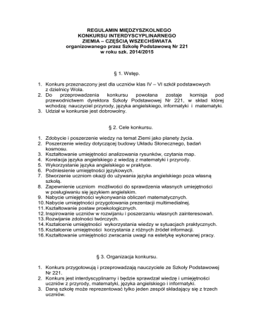 REGULAMIN MIĘDZYSZKOLNEGO KONKURSU INTERDYSCYPLINARNEGO ZIEMIA – CZĘŚCIĄ WSZECHŚWIATA organizowanego przez Szkołę Podstawową Nr 221 w roku szk. 2014/2015 § 1. Wstęp. 1. Konkurs przeznaczony jest dla uczniów klas IV – VI szkół podstawowych z dzielnicy Wola. 2. Do przeprowadzenia konkursu powołana zostaje komisja pod przewodnictwem dyrektora Szkoły Podstawowej Nr 221, w skład której wchodzą: nauczyciel przyrody, języka angielskiego, informatyki i matematyki. 3. Udział w konkursie jest dobrowolny. § 2. Cele konkursu. 1. Zdobycie i poszerzenie wiedzy na temat Ziemi jako planety życia. 2. Poszerzenie wiedzy dotyczącej budowy Układu Słonecznego, badań kosmosu. 3. Kształtowanie umiejętności analizowania rysunków, czytania map. 4. Korelacja języka angielskiego z wiedzą z matematyki i przyrody. 5. Wykorzystanie języka angielskiego w praktyce. 6. Podniesienie umiejętności językowych. 7. Stworzenie uczniom okazji do używania języka angielskiego poza własną szkołą. 8. Zapewnienie uczniom możliwości do sprawdzenia własnych umiejętności w posługiwaniu się językiem angielskim. 9. Nabycie umiejętności wykonywania obliczeń matematycznych. 10. Nabycie umiejętności przygotowania prezentacji multimedialnej. 11. Kształtowanie postaw proekologicznych. 12. Inspirowanie uczniów w rozwijaniu i poszerzaniu własnych zainteresowań. 13. Rozwijanie zdolności twórczych. 14. Kształcenie umiejętności wykorzystania wiedzy w sytuacjach praktycznych. 15. Kształcenie umiejętności korzystania z różnych źródeł informacji. 16. Kształtowanie umiejętności zwracania uwagi na estetykę wykonanej pracy. § 3. Organizacja konkursu. 1. Konkurs przygotowują i przeprowadzają nauczyciele ze Szkoły Podstawowej Nr 221. 2. Konkurs jest interdyscyplinarny i będzie sprawdzał wiedzę i umiejętności uczniów z przyrody, matematyki, języka angielskiego i informatyki. 3. Daną szkołę może reprezentować tylko jeden zespół składający się z trzech uczniów. 4. Warunkiem udziału w konkursie jest przesłanie do dnia 7 listopada 2014 r. zgłoszenia szkoły na jeden z trzech podanych poniżej sposobów: faxem: 022-620-17-40 pocztą elektroniczną: [email protected] na adres: SP221, ul. Ogrodowa 42/44, 00-876 Warszawa W zgłoszeniu należy podać dane adresowe szkoły oraz dane nauczyciela odpowiedzialnego za przeprowadzenie konkursu w szkole i przygotowanie uczniów. § 4. Wymagania konkursowe. 1. W I etapie uczestnicy wykonują pracę z przyrody – Prezentacja na temat „Ziemia – częścią Wszechświata”. Prezentacja powinna być wykonana w wersji elektronicznej w formie prezentacji multimedialnej i zapisana na płycie jako pokaz (w formacie .pps lub .ppsx). Prace pozostają na terenie macierzystych szkół. Szkolna komisja wyłania 3 najlepsze prace, których autorzy przystąpią do II etapu. Uczniowie ci powinni wykazać się umiejętnościami z zakresu przyrody, matematyki, informatyki i języka angielskiego. 2. Etap II będzie przeprowadzony w postaci testu. Pytania będą dotyczyć następujących zagadnień: Planety, gwiazdy i inne obiekty w Układzie Słonecznym, Historia poznawania i badania kosmosu, Kształt i wymiary Ziemi, Czynniki warunkujące życie na Ziemi, Pole magnetyczne Ziemi, Określanie położenia punktów na kuli ziemskiej (długość i szerokość geograficzna Ruch obrotowy i obiegowy Ziemi (strefy oświetlenia) Położenie kontynentów i oceanów. Obliczenia związane ze skalą, Obliczenia związane z zamianą jednostek długości i pola, Obliczenia związane z drogą, prędkością i czasem zapis wielkich liczb w notacji wykładniczej Angielskie słownictwo związane z tematem konkursu wykorzystane w zadaniach typu: a) space vocabulary eg.: Sun, planet, moon, star, space craft... b) names of the planetes eg.: Jupiter, Uranus, Earth, Pluto... c) who explored space in the past: Jurij Gagarin, Valentina Tereshkova, Neil Armstrong, Laika- dog.... 3. Komisja będzie brała pod uwagę czytelność pracy. § 5. Przebieg konkursu. 1. Konkurs jest dwuetapowy. I etap odbywa się w szkole macierzystej. 2. Zgłoszenie nazwisk uczestników zakwalifikowanych do II etapu należy przesłać do organizatora konkursu na dołączonych kartach zgłoszenia do dnia 18 grudnia 2014 r. w sposób podany w §3 p.4 (załącznik nr 1). 3. II etap odbędzie się dnia 17 marca 2015 r. (czwartek) o godzinie 1200 na terenie SP221 i będzie trwał 60 minut. 4. Na konkurs uczniowie przyjeżdżają pod opieką nauczycieli. 5. Każdy z 3 uczestników pracuje indywidualnie na rzecz zespołu. O wyniku końcowym będzie decydować suma punktów zdobyta przez każdego ucznia danej szkoły. 6. Komisja konkursowa sprawdzi testy i wyłoni zwycięzców. 7. Ogłoszenie wyników, rozdanie nagród i dyplomów odbędzie się w czwartek dnia 9 kwietnia 2015r. o godzinie 1200 w Szkole Podstawowej Nr 221 Literatura: PODRĘCZNIKI DO PRZYRODY TAJEMNICE WSZECHŚWIATA. NAJNOWSZE ODKRYCIA, Giles Sparrow Wydawnictwo „Bellona” NASZA PLANETA I WSZECHŚWIAT. ATLAS KOSMOSU, Wydawnictwo „Wilga” ATLAS NIEBA.GWIAZDY,PLANETY, WSZECHŚWIAT Wydawnictwo „Arkady” Zapraszamy do udziału w konkursie