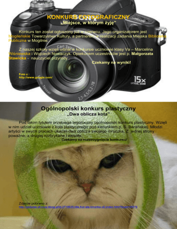 KONKURS FOTOGRAFICZNY „Miejsce, w którym żyję” Konkurs ten został ogłoszony już w czerwcu. Jego organizatorem jest Mogileńskie Towarzystwo Kultury, a partnerem w realizacji zadania Miejska Biblioteka Publiczna w Mogilnie. Z naszej szkoły wzięli udział w konkursie uczniowie klasy Va – Marcelina Wiśniewska i Wojciech Nowaczyk. Opiekunem uczestników jest p. Małgorzata Stawicka - nauczyciel przyrody . Czekamy na wyniki! Foto z : http://www.google.com/ Ogólnopolski konkurs plastyczny „Dwa oblicza kota” Pod takim tytułem przebiega tegoroczny ogólnopolski konkurs plastyczny. Wzięli w nim udział uczniowie z koła plastycznego pod kierunkiem p. S. Barańskiej. Młodzi artyści w swych pracach ukazali dwa oblicza swojego mruczka. Z jednej strony poważne, z drugiej rozbrykane i wesołe. Czekamy na rozstrzygnięcie konkursu! Zdjęcie pobrano z: http://pictures-of-mua.bloog.pl/id,2719535,title,Kot-ala-limonka-xD,index.html?ticaid=6f479